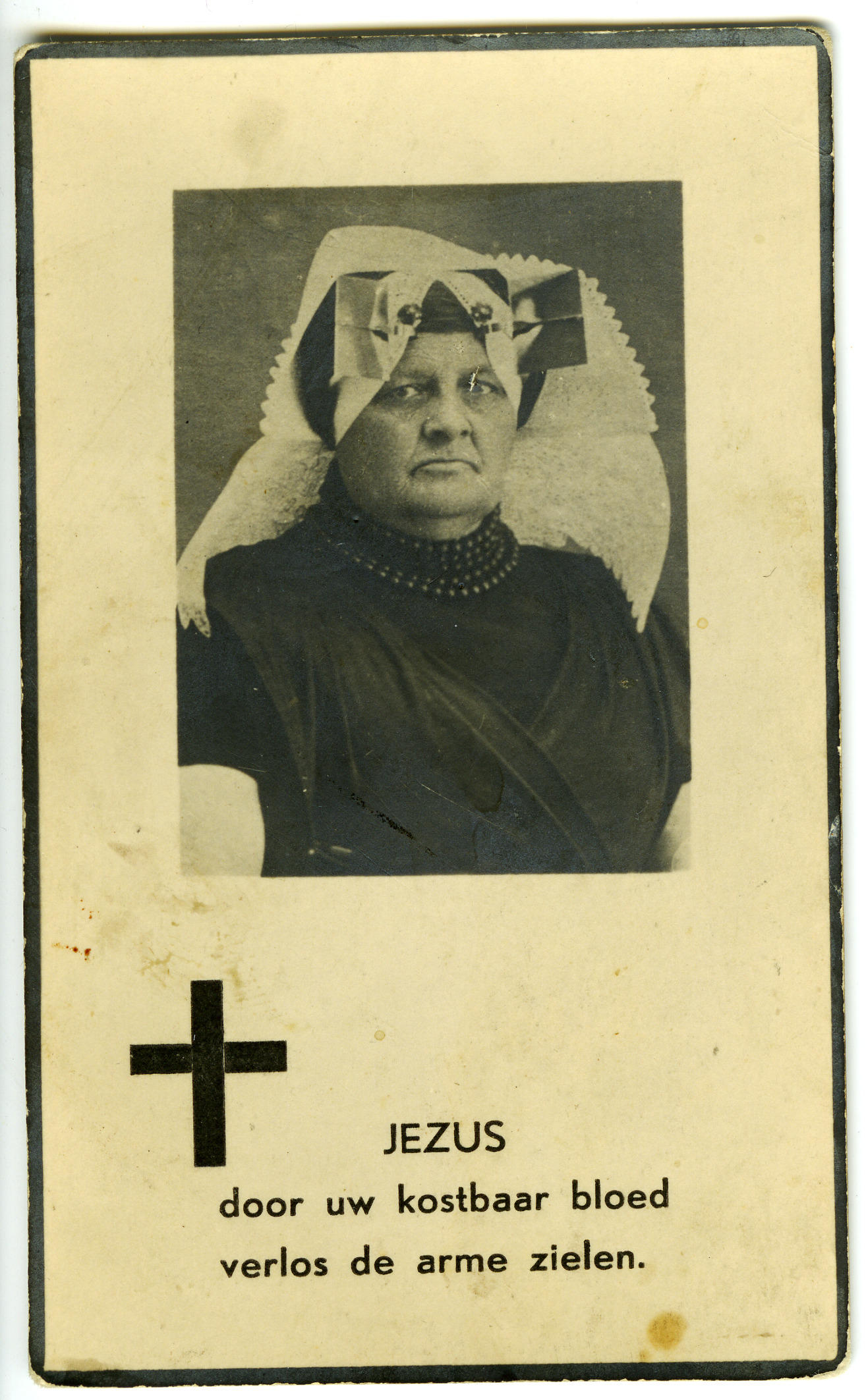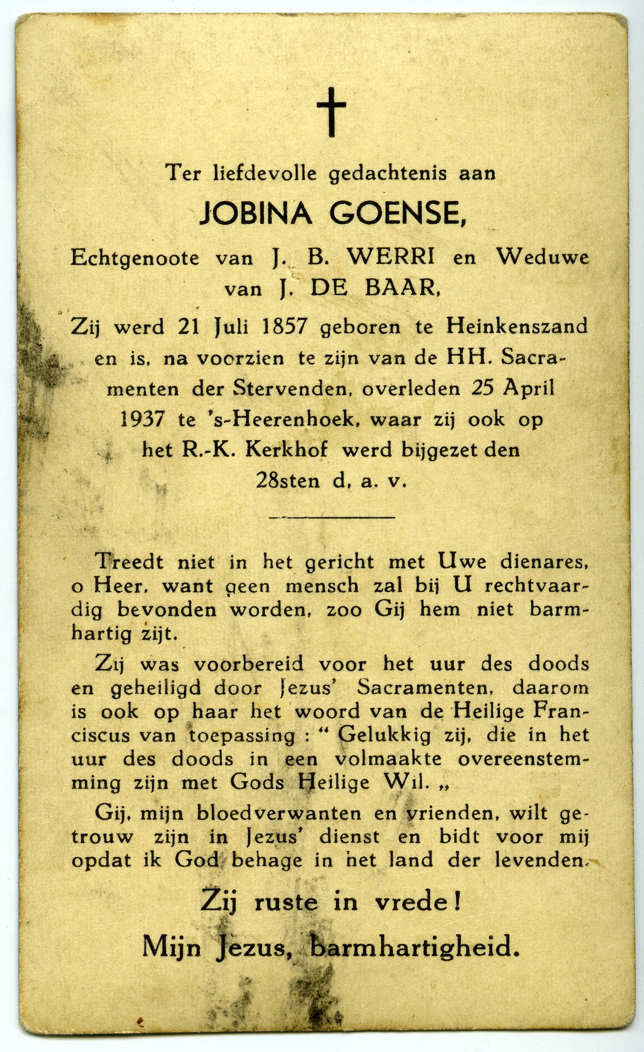 Bidprentje ter gedachtenis aan Jobina Werri-Goense, geboren op 21 juli 1857 in Heinkenszand en overleden op 25 april 1937 in 's-Heerenhoek. Jobina is gekleed in Zuid-Bevelandse streekdracht. Ze draagt de rouwdracht.