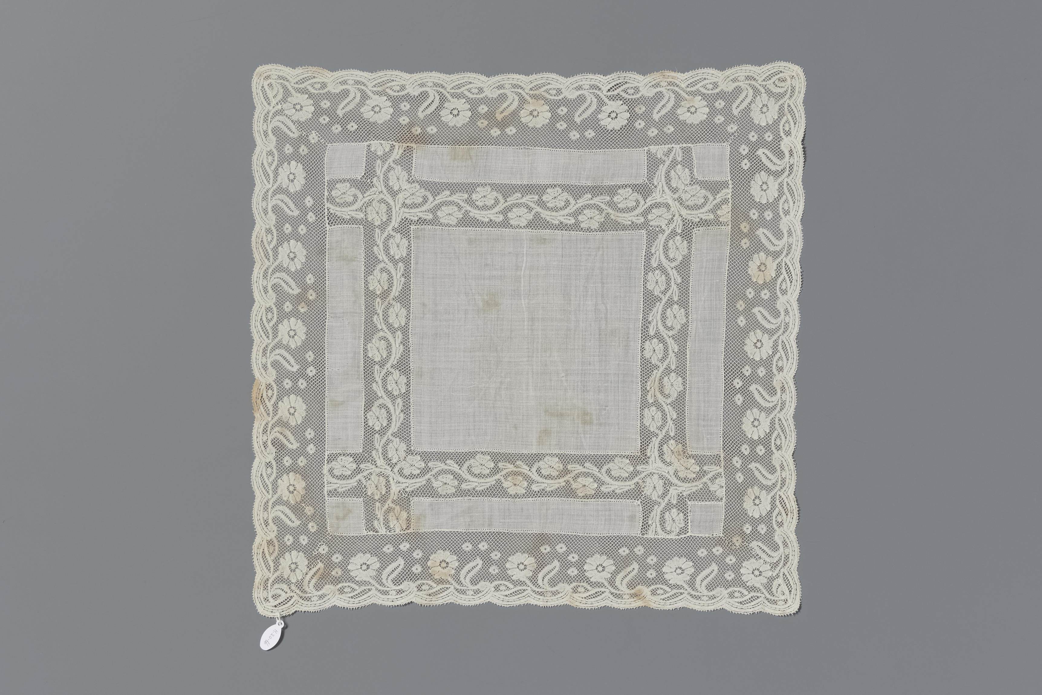 Zakdoek van zijdeachtig neteldoek en Valenciennes kloskant.