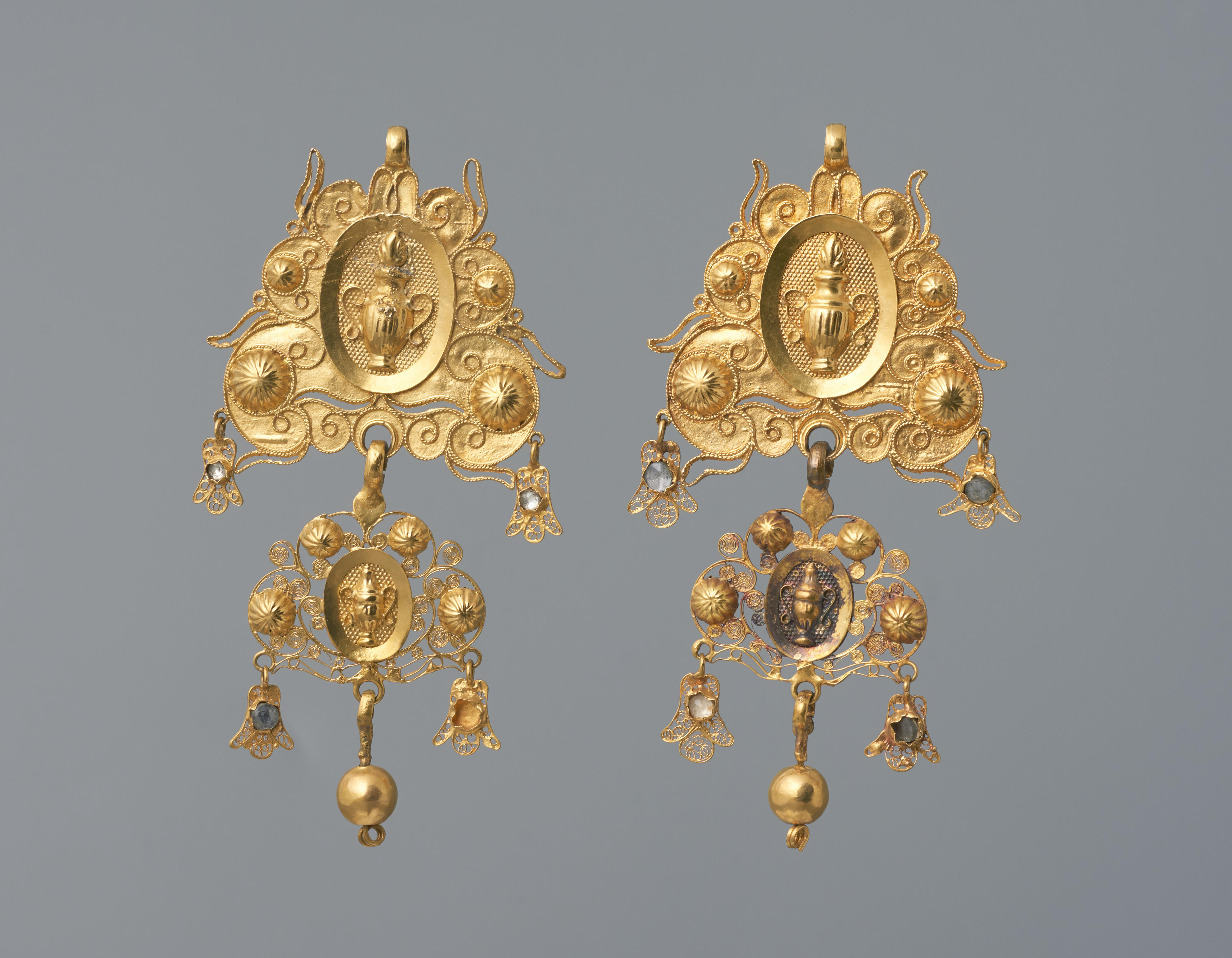 Paar 18-karaats gouden 'bloempotbellen' uit omstreeks 1900. Dit paar is gedragen door een vrouw in Nieuw- en St. Joosland. Incidenteel kwam dit type ook voor in Arnemuiden. De oorijzerhangers hebben geen meesterteken.