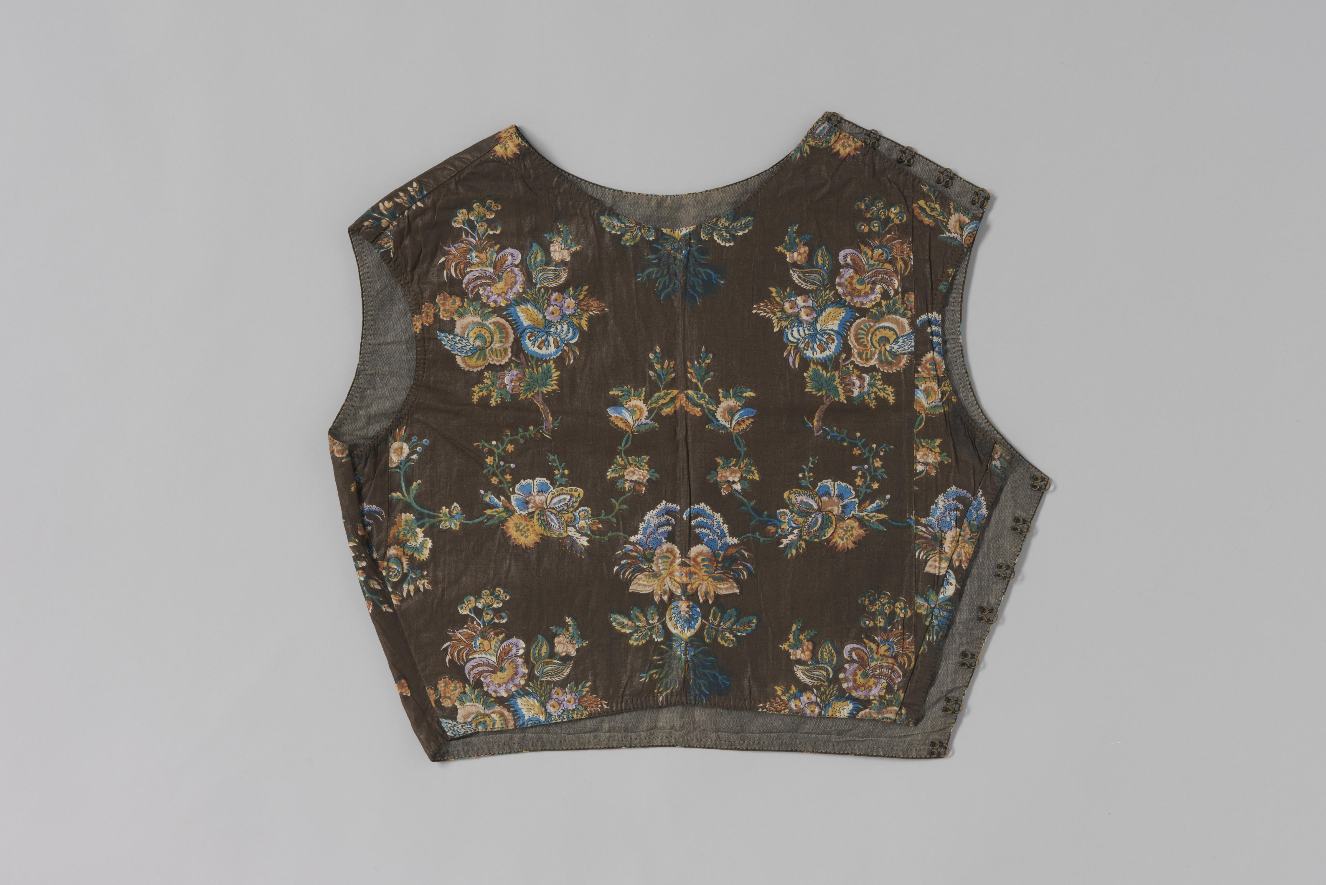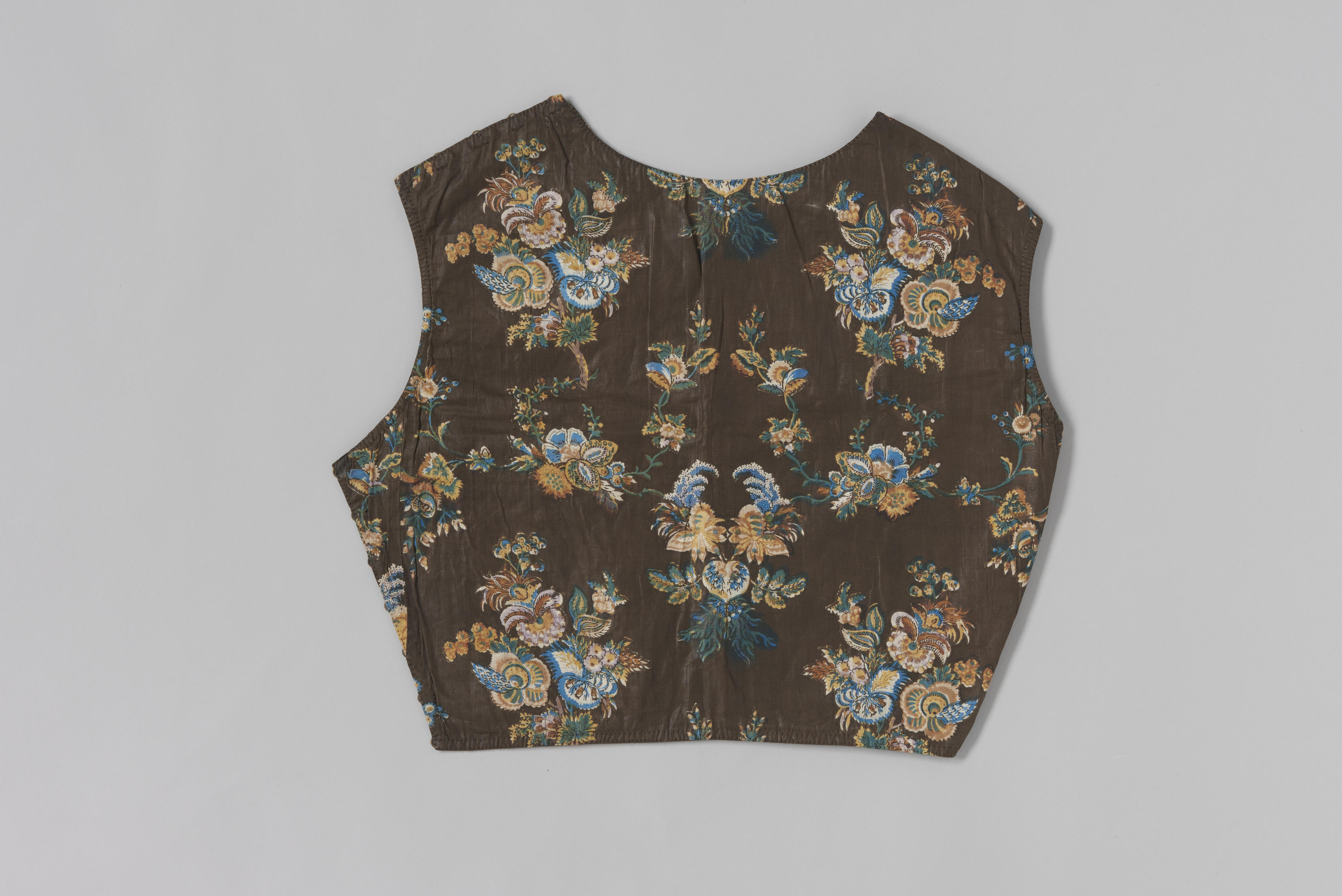 Kroplap van geglansde of gekalanderde, Europese bedrukte katoen met een donker fond, zogenaamde nachtgrond. De kroplap werd in 1948 als ouderwets omschreven.