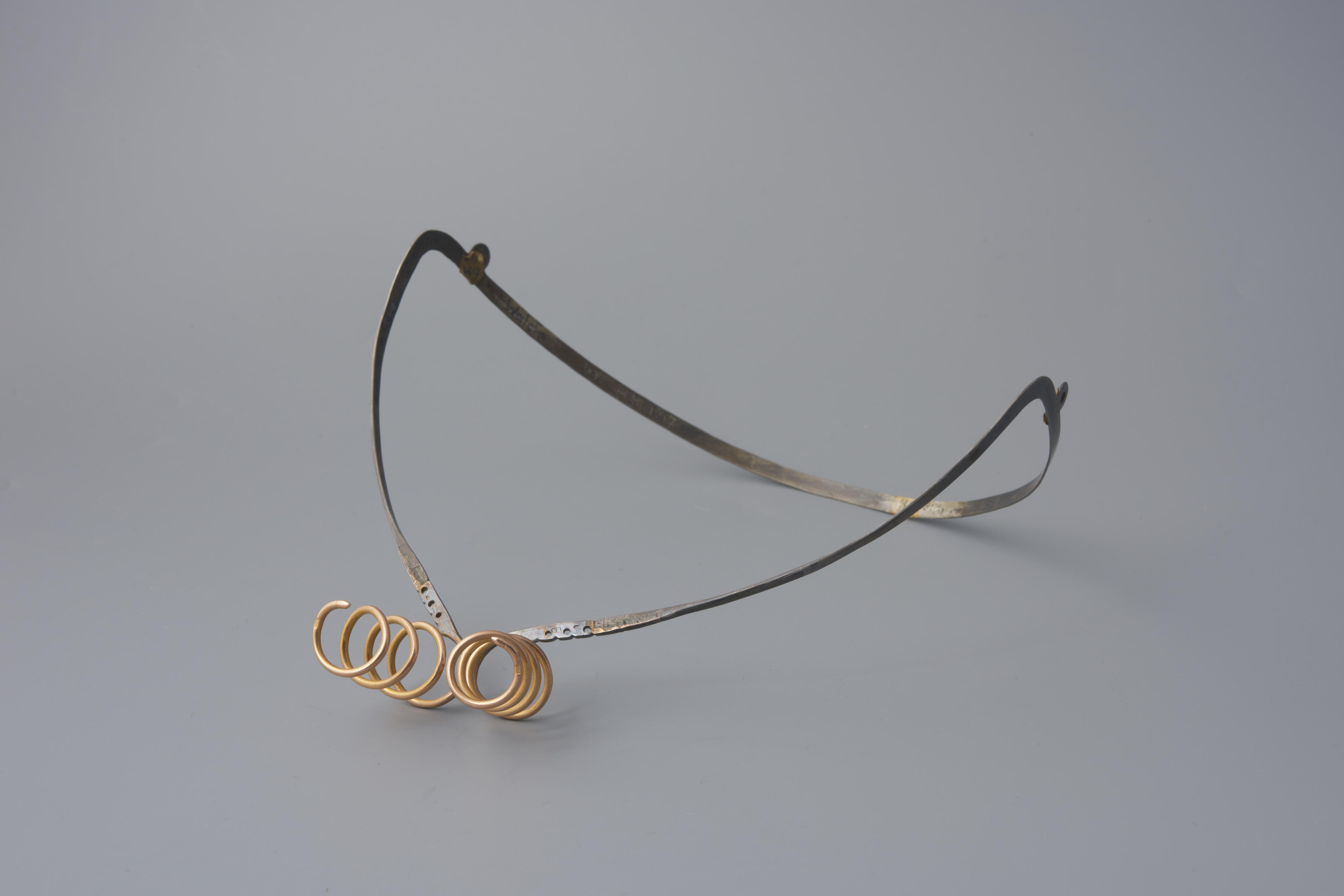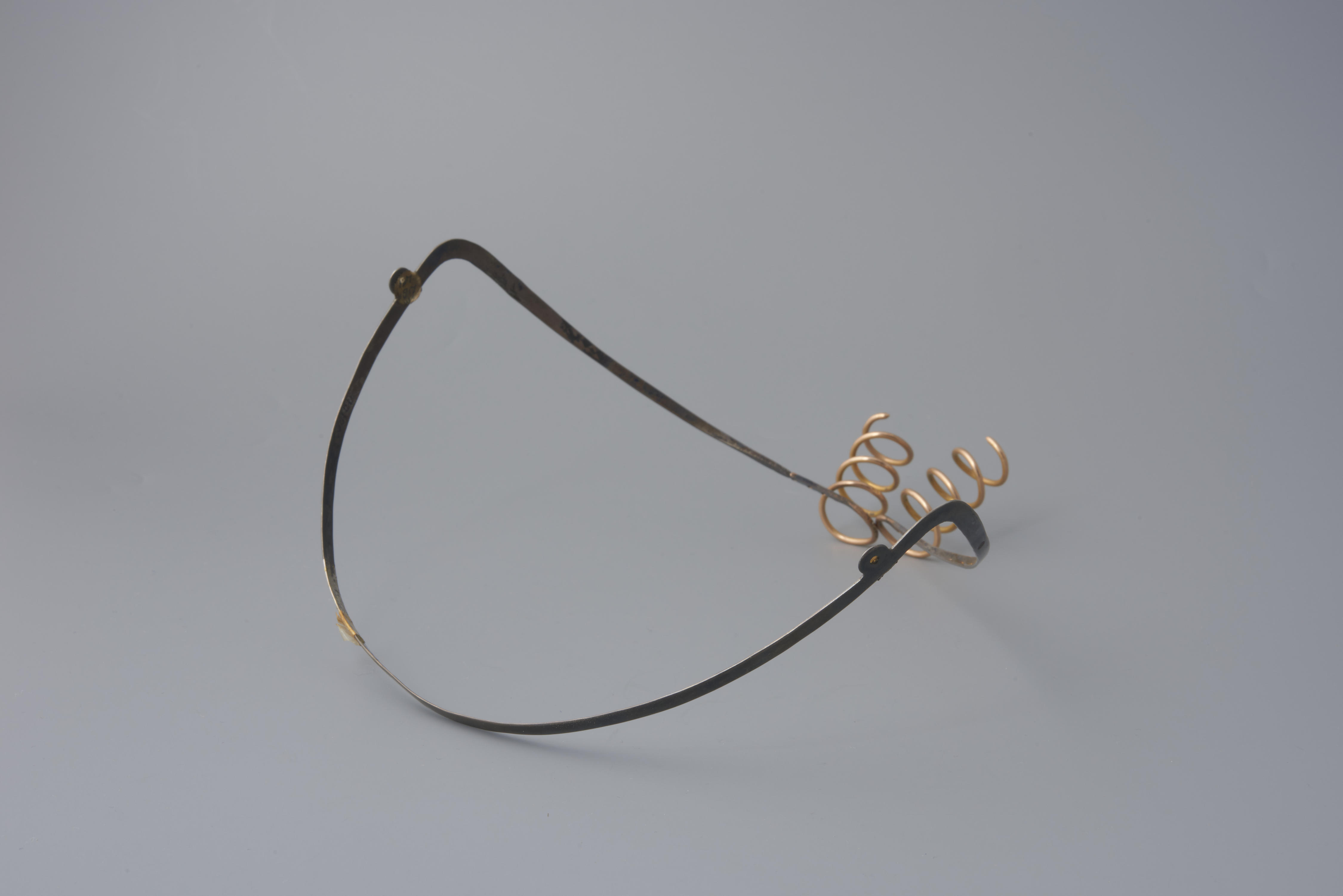 Oorijzer, gedragen door een vrouw in streekdracht van Walcheren. Het oorijzer bestaat uit een koperen beugel met gouden krullen. In de aanzet van de krullen zitten drie gaatjes. Door deze gaatjes kunnen spelden worden gestoken om het oorijzer en de muts aan elkaar vast te maken. De krullen hebben vier windingen en zijn gekeurd met ...