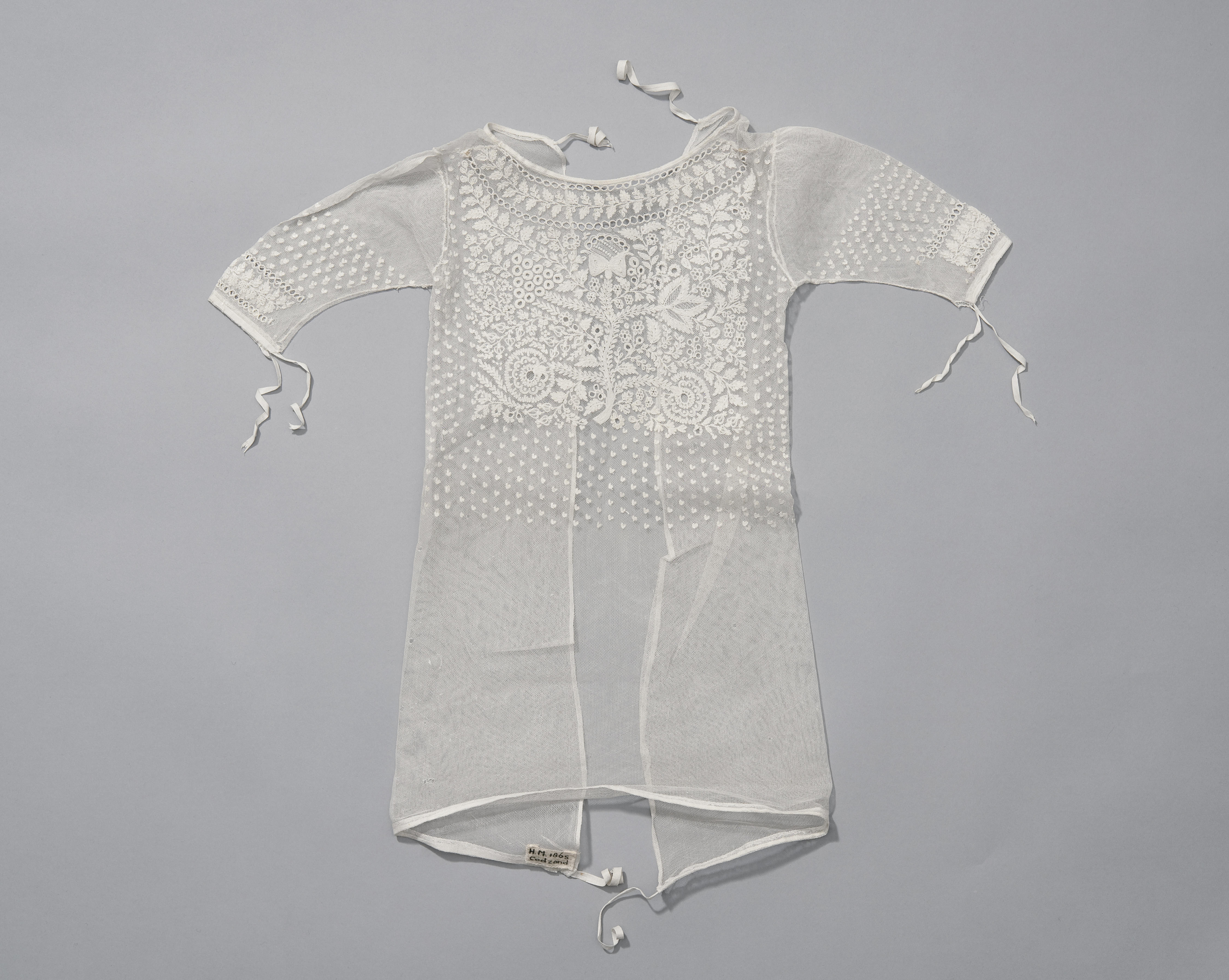Jurkje of jakje van doorgestopte tule. Dit jakje staat geregistreerd als doopjurk. Het feit dat het een recht model heeft, aan de onderzijde aangetrokken kan worden én alleen een versierd bovendeel heeft, doet vermoeden dat dit een jak is dat door een bakerkindje is gedragen. Het onderste deel van het jak verdween dan onder de ...