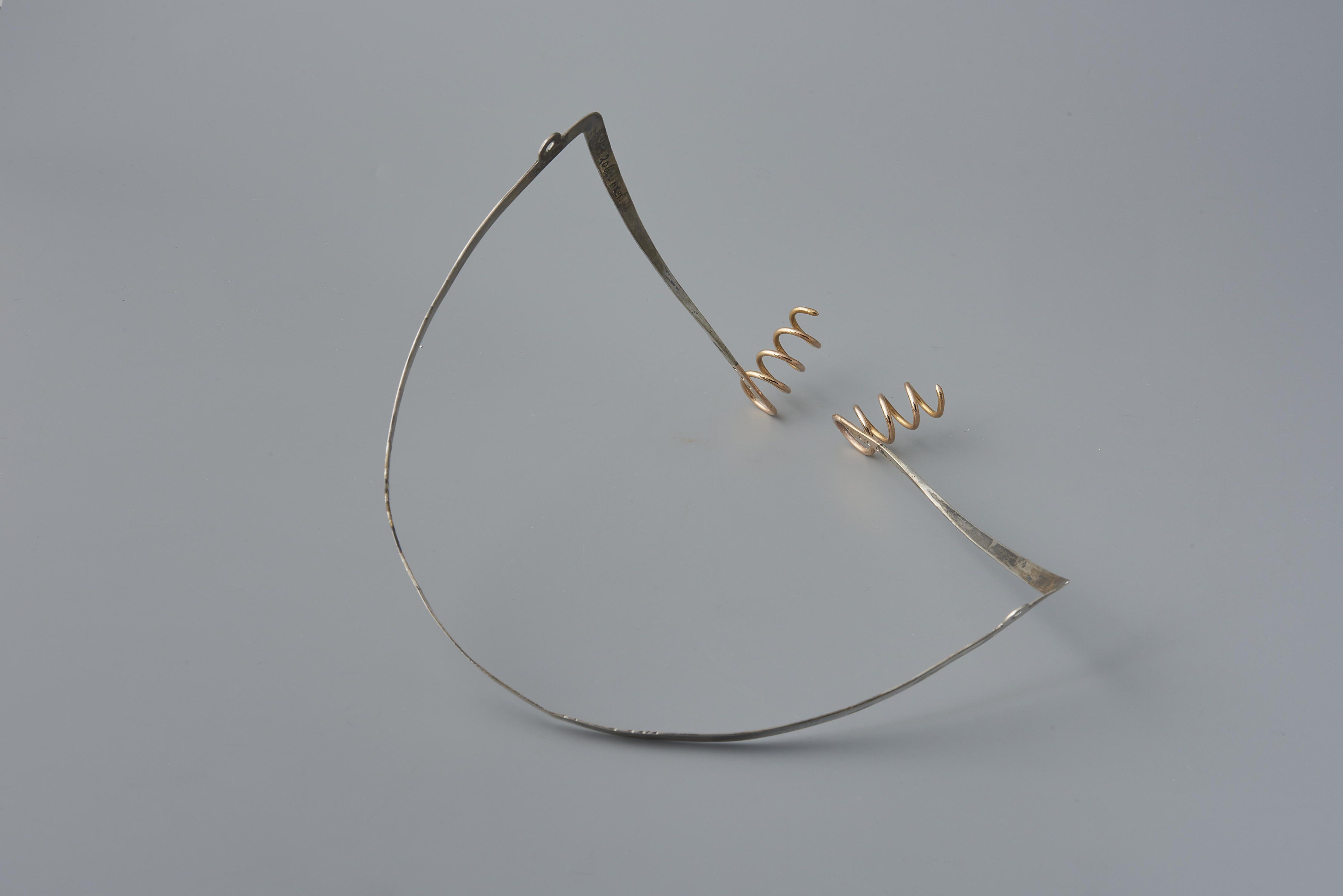 Zilveren oorijzer met roodgouden krullen, gedragen door een meisje in Axelse streekdracht. De krullen hebben vier windingen. Het oorijzer is in 1899 gemaakt door Evert Schotman in Dordrecht.