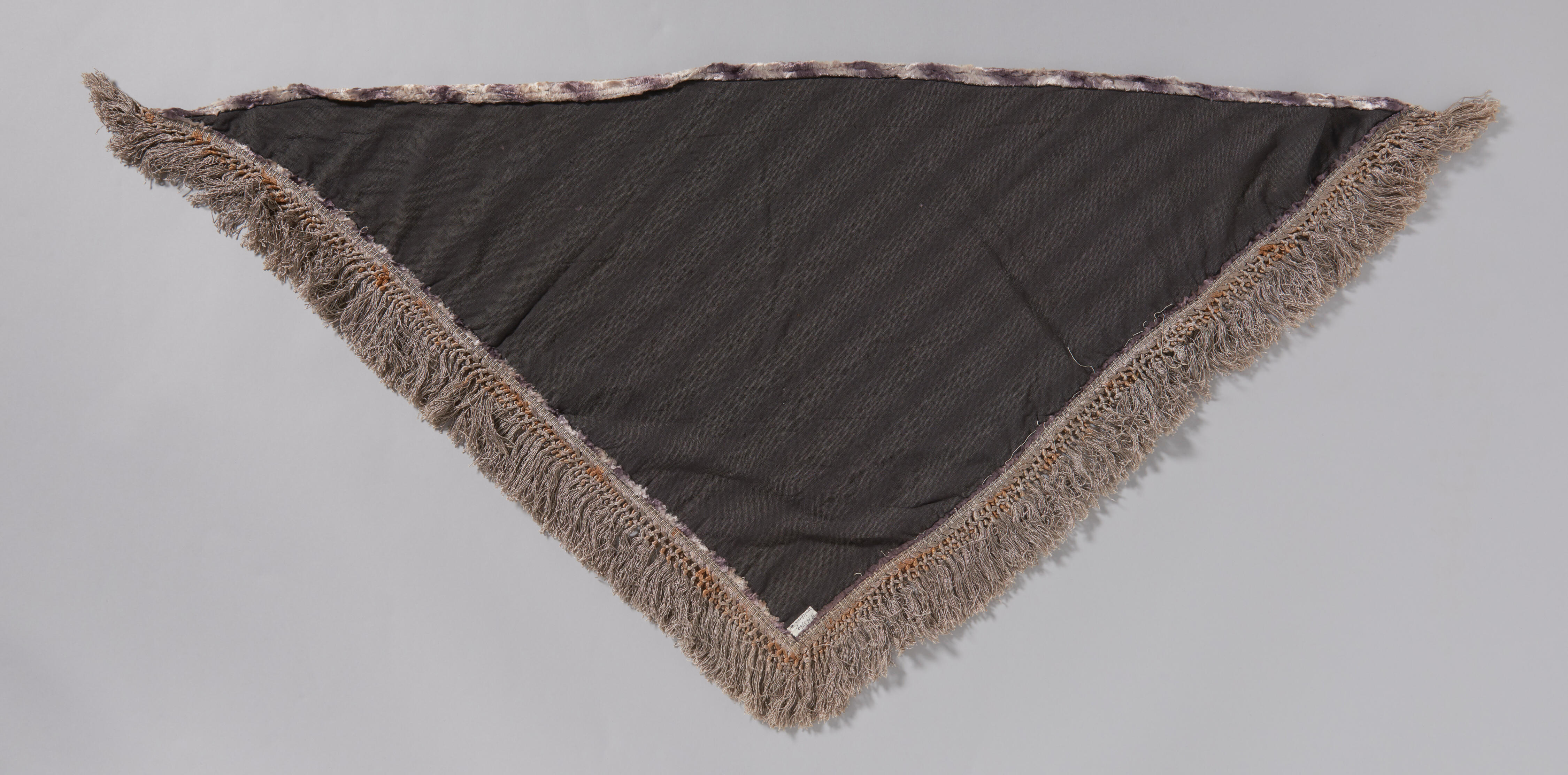Driehoekige omslagdoek van pluche, gedragen door een vrouw in streekdracht van Walcheren als bescherming tegen de kou. Langs beide korte zijden is een franje gezet van 11 centimeter lang. De binnenzijde is gevoerd.