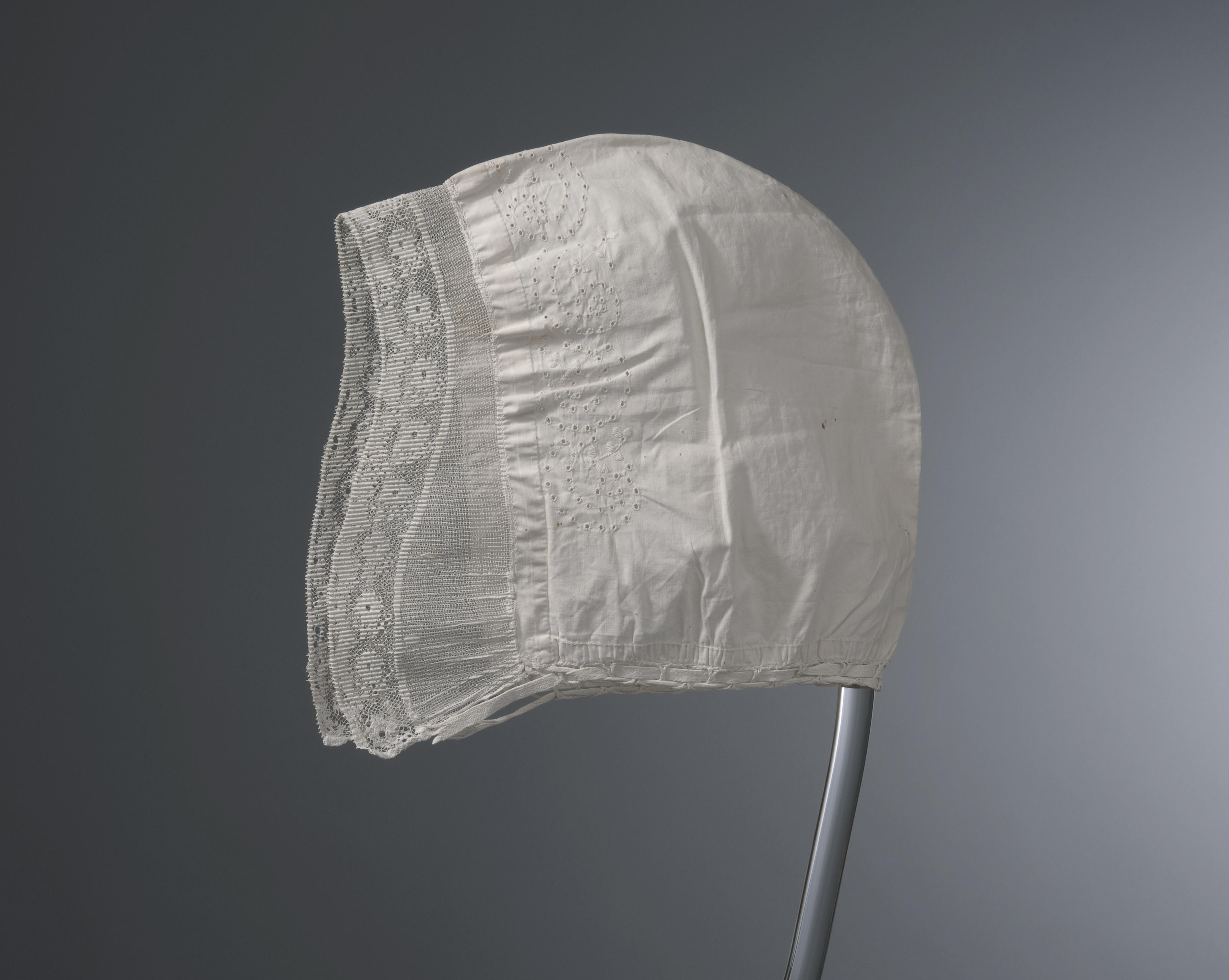 Hul voor de rouw met een bol van effen witte katoen, langs de voorzijde versierd met Engels borduurwerk, een tussenstrook van mutsengaas en een 2,5 centimeter brede kanten voorstrook.