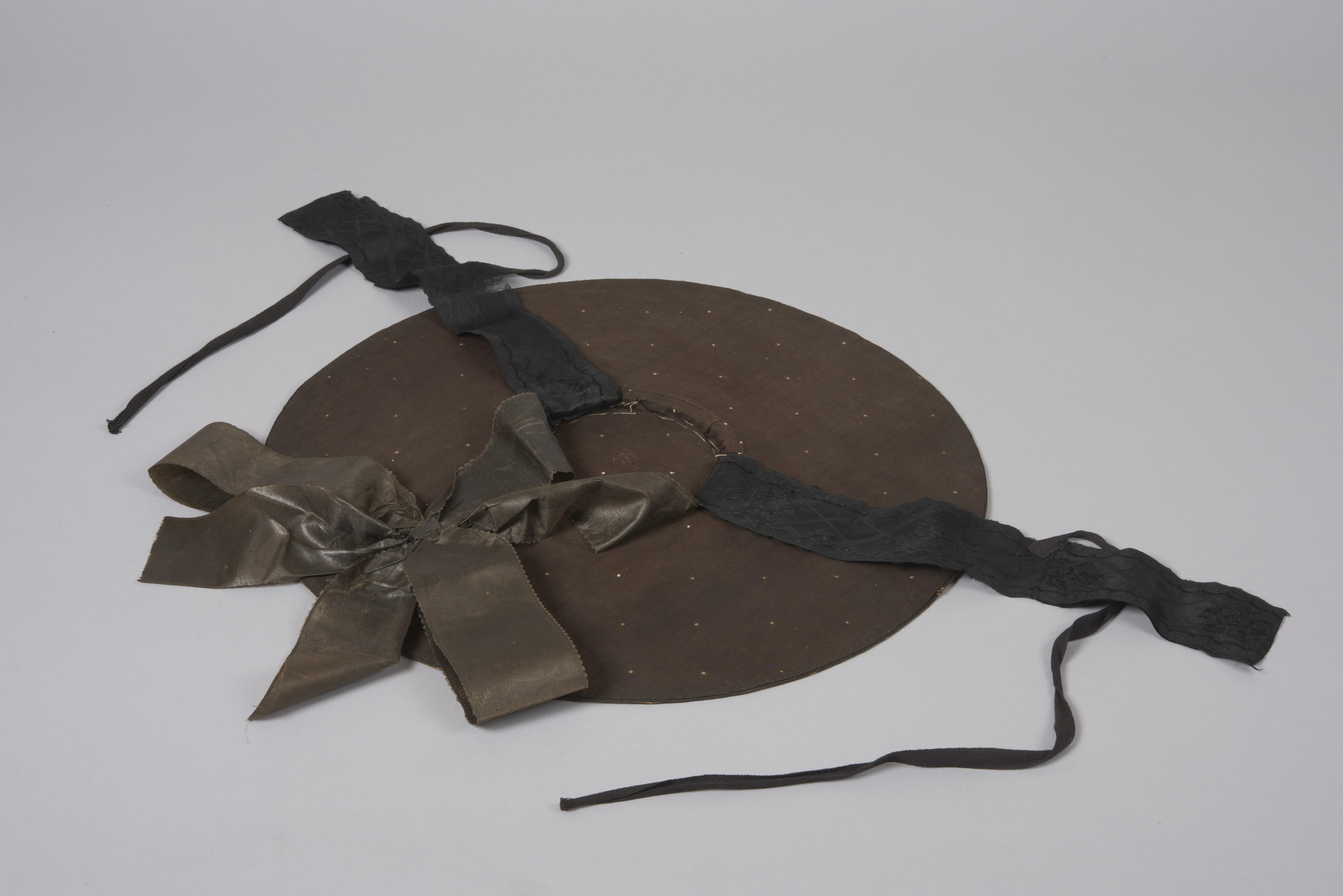 Zogenaamde schelphoed, gevoerd met bruin katoen met een wit stipje. Aan de hoed zitten zwarte en zwartbruine linten. Vermoedelijk is deze hoed als rouwdracht gedragen. Schelphoeden waren tot omstreeks 1850 in een groot deel van Zeeland mode.