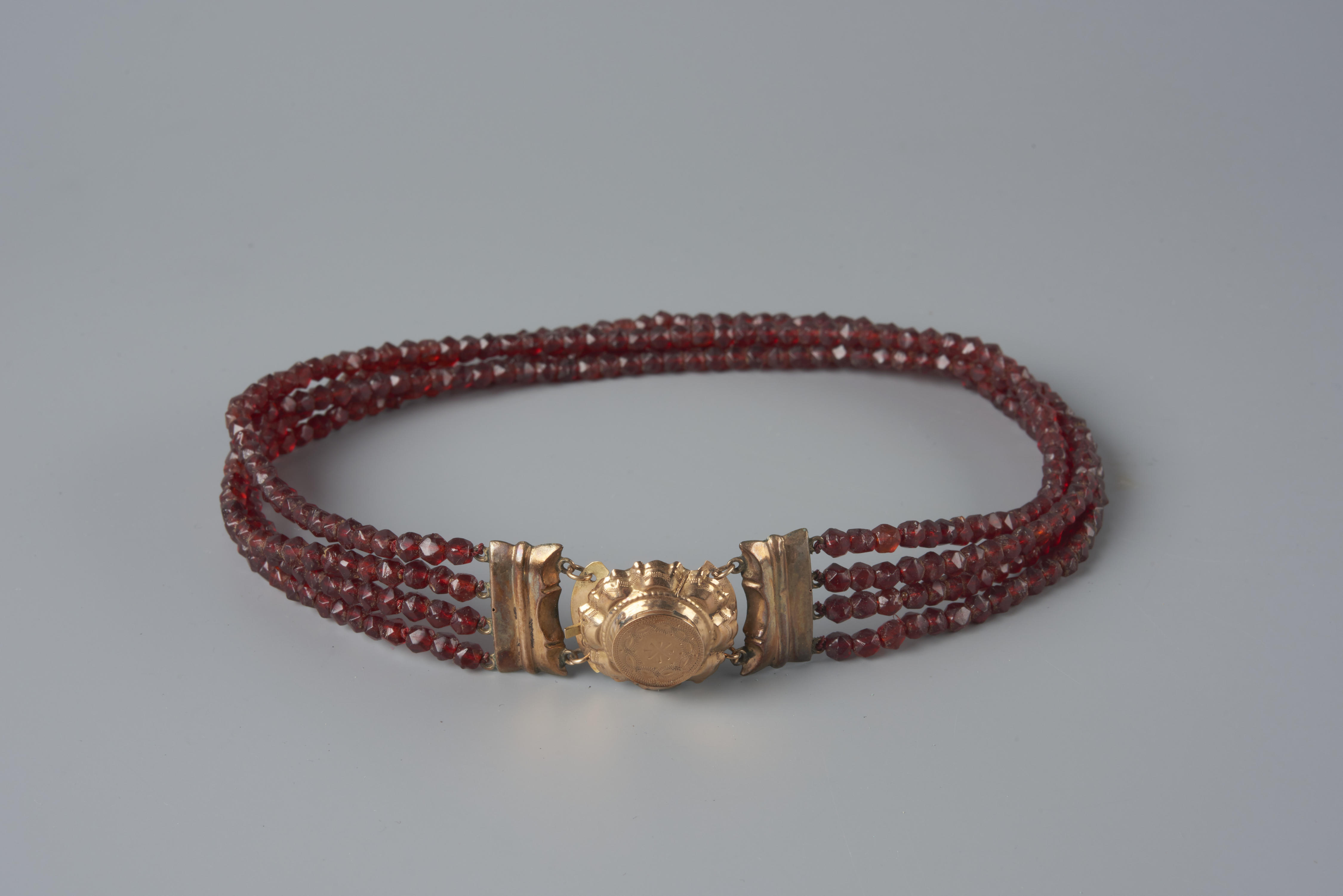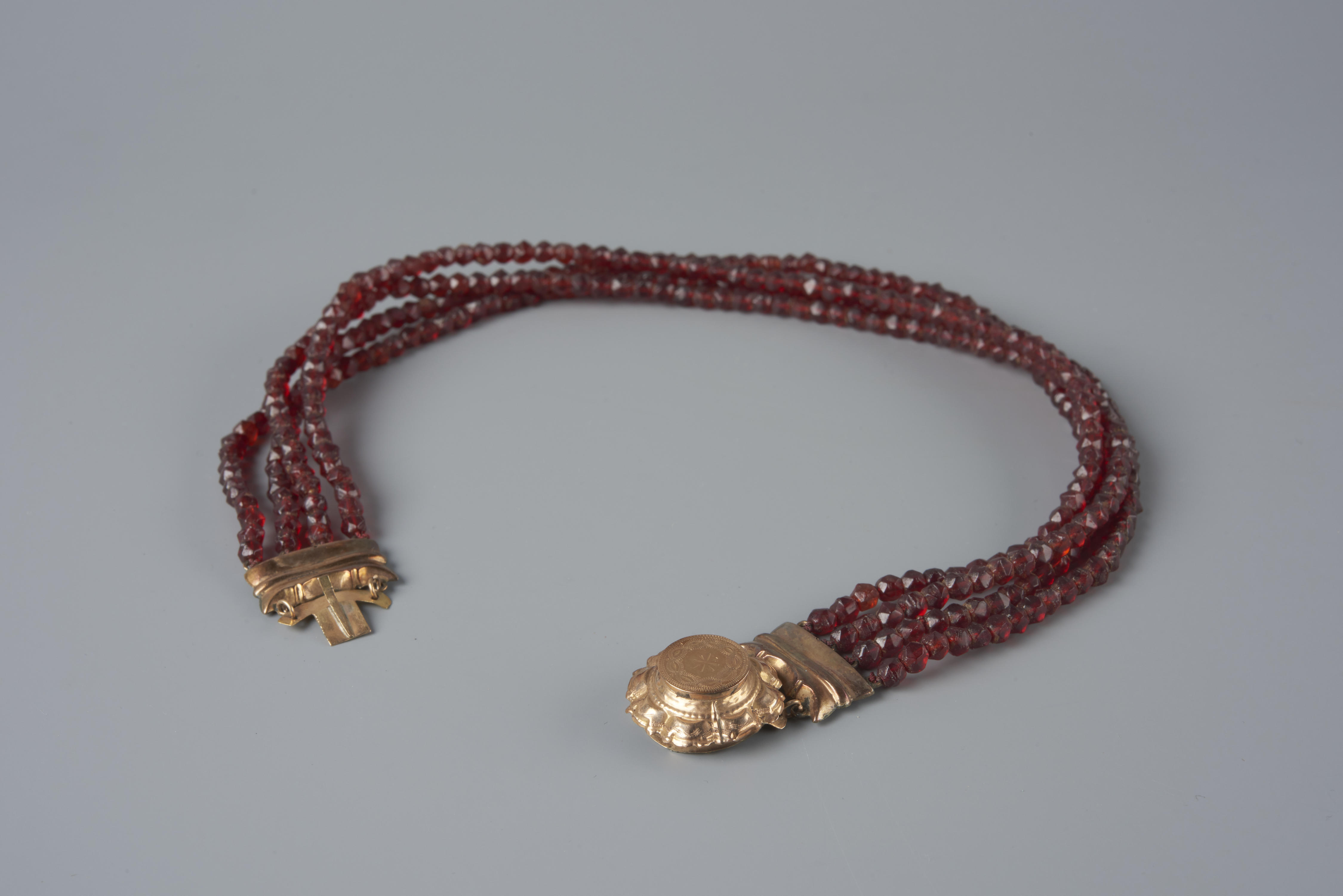 Halssnoer, bestaande uit een 14-karaats gouden slot met vier strengen glazen kralen, gedragen door een meisje uit de provincie Drenthe. Dit type slot uit omstreeks 1920 is niet specifiek streekgebonden en werd ook bij de algemene modedracht gedragen. De vervaardiger van het slot is onbekend.
