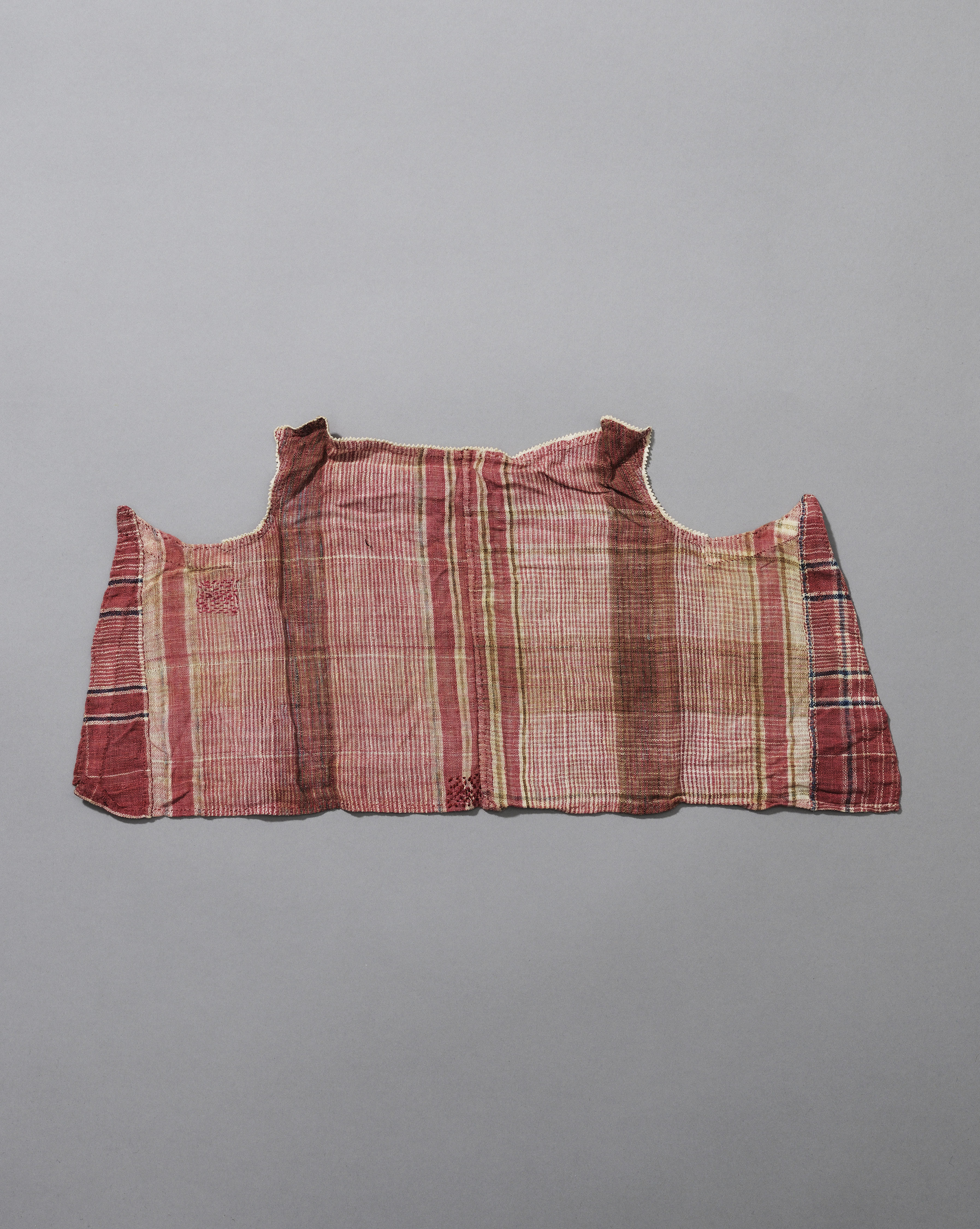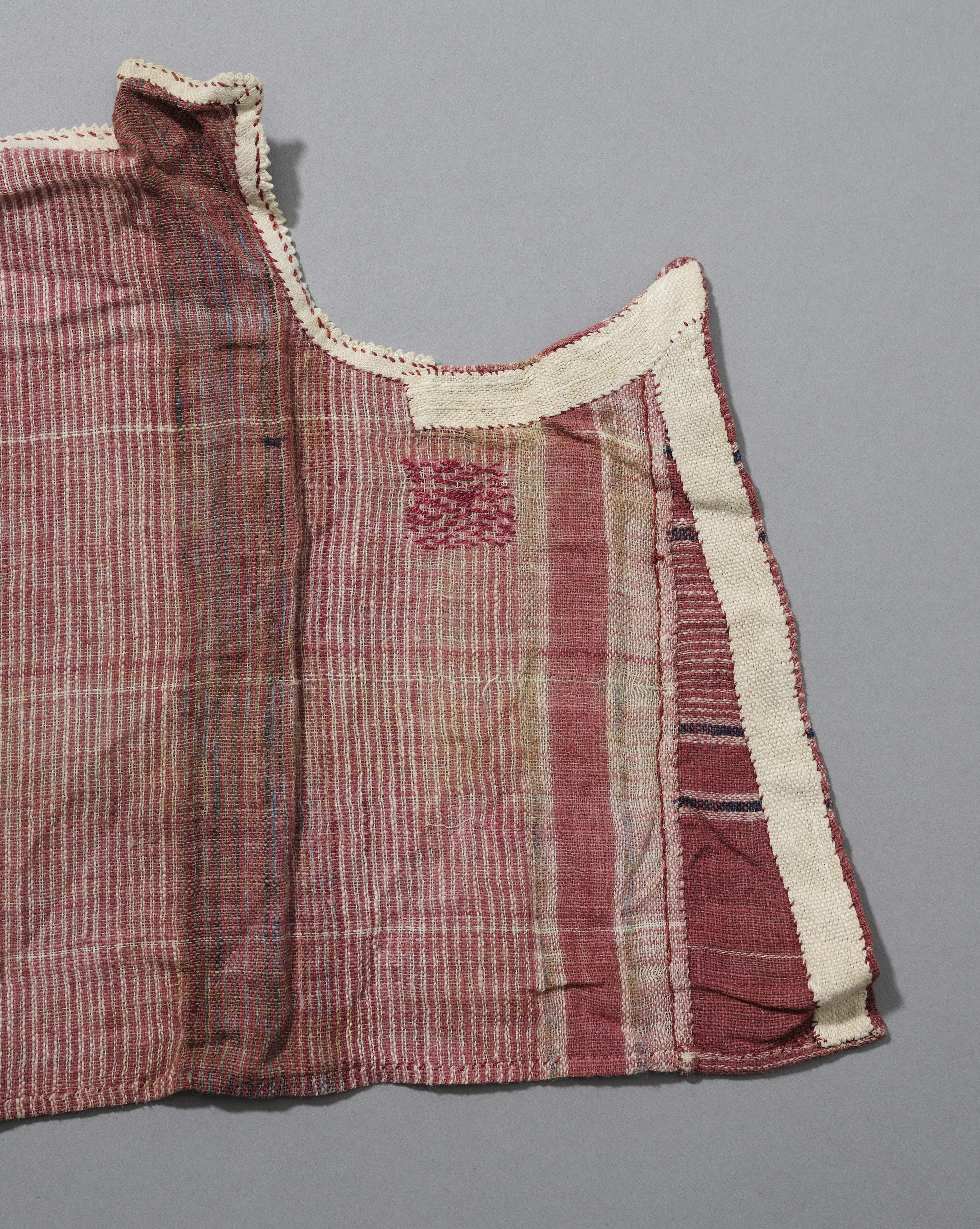 Linnen slab, afkomstig uit de Zaanstreek. De slab is karmozijnrood gekleurd met crème- en beigekleurige strepen. Langs het halsje en gedeeltelijk langs de armsgaten zit een fijn tandjesrandje van ongebleekt linnen. De slab is op twee plaatsen gestopt met rood garen.