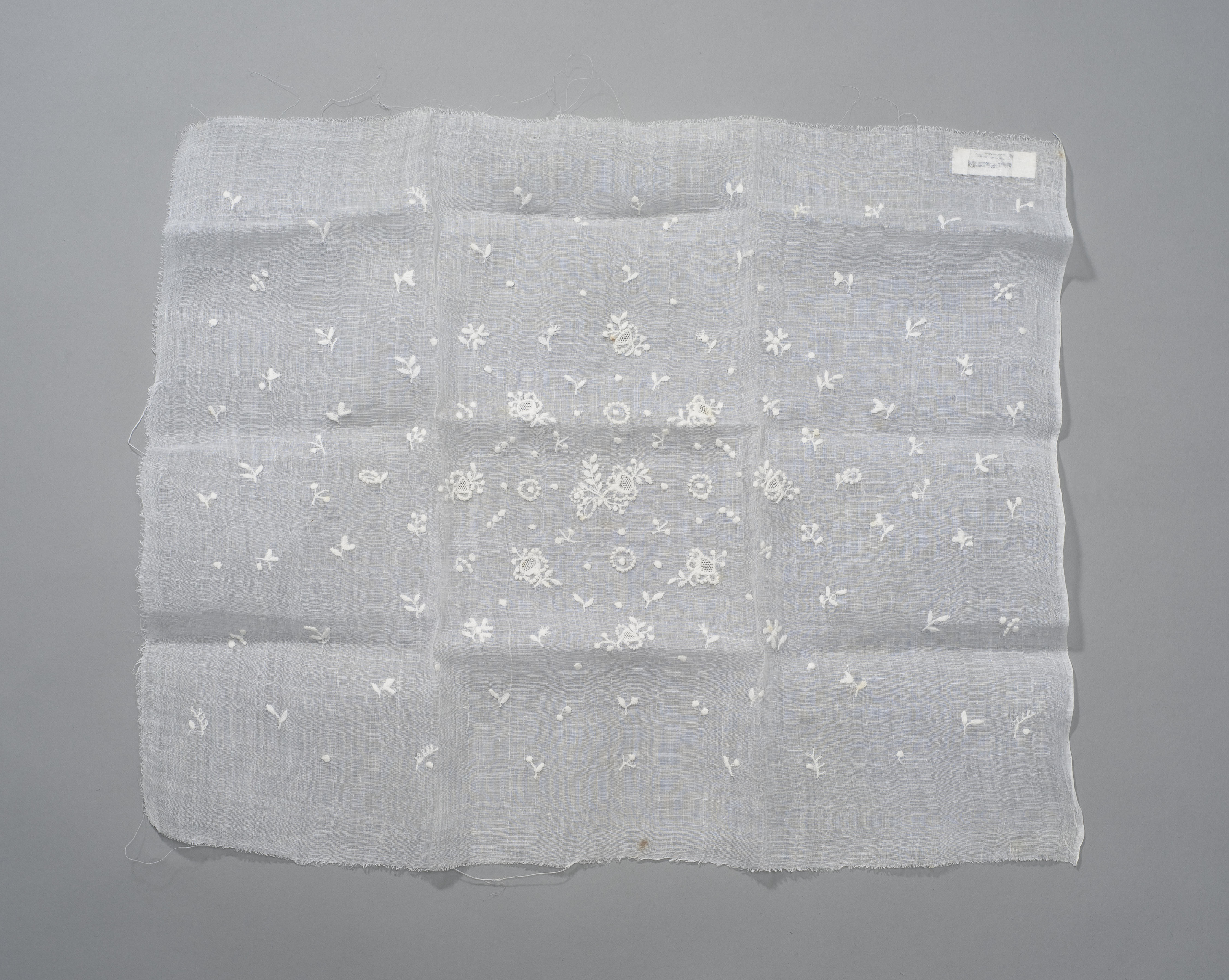 Lapje batist, met wit garen vrij grof geborduurd. Het lapje is bedoeld voor de vervaardiging van een muts.