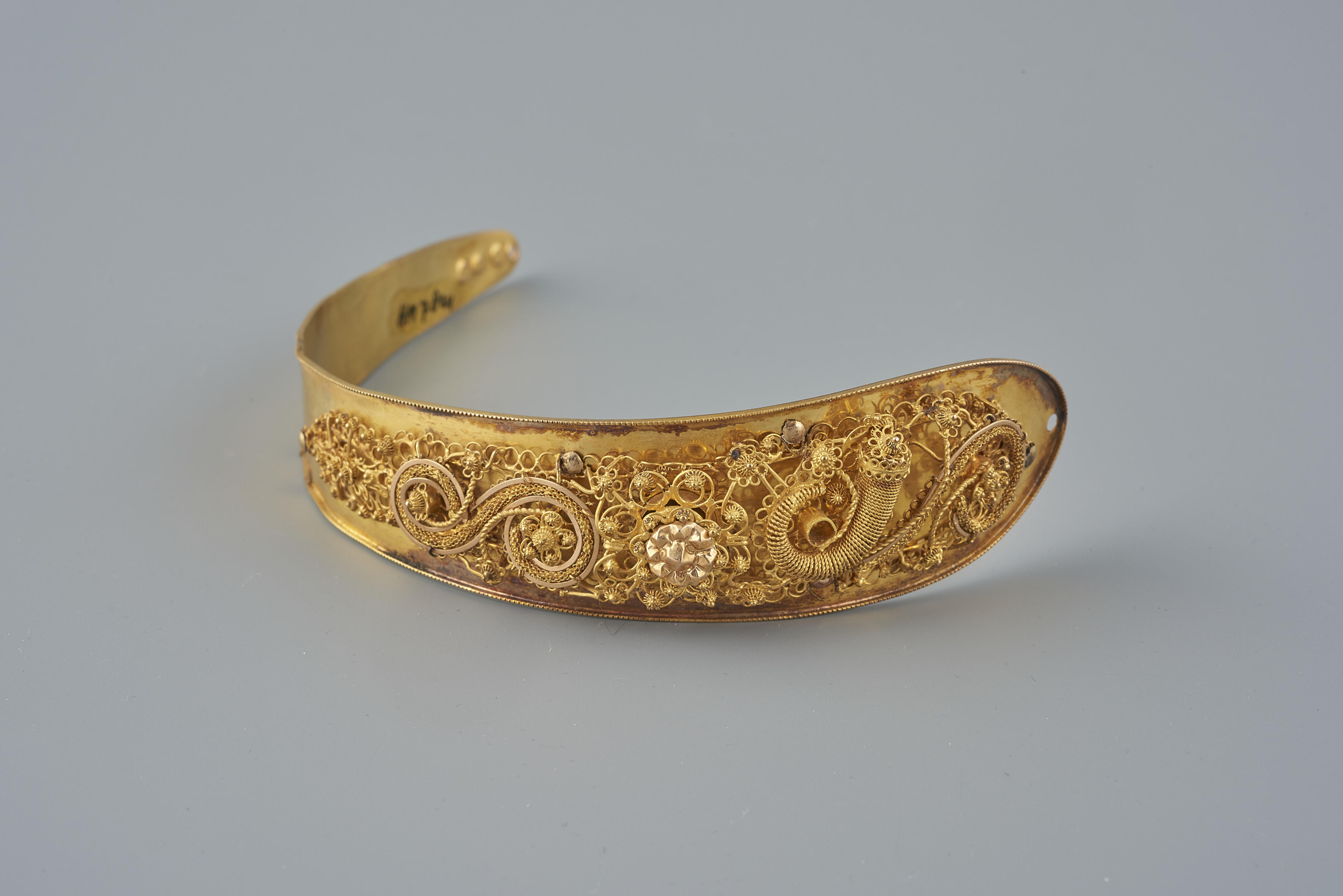 Voorhoofdsnaald van 14-karaats goud, gedragen door een vrouw in Hilversum. De vervaardiger is onbekend. De voorhoofdnaald heeft een jaarletter uit 1899.