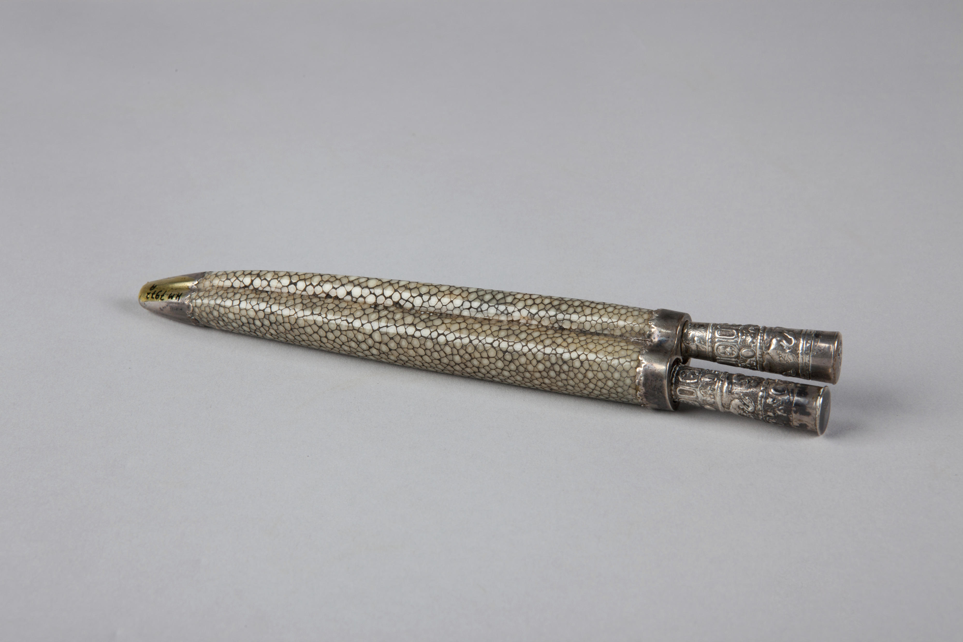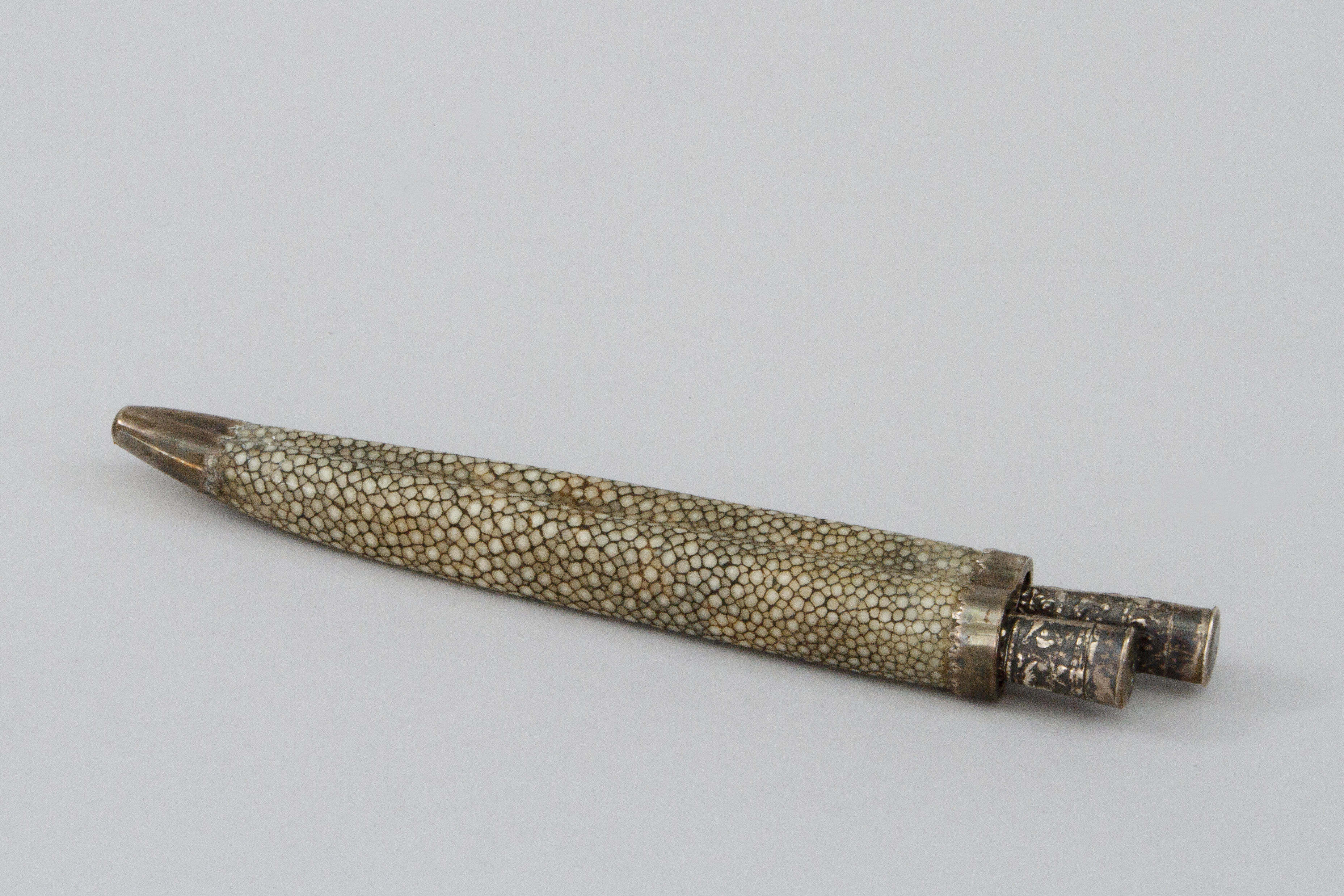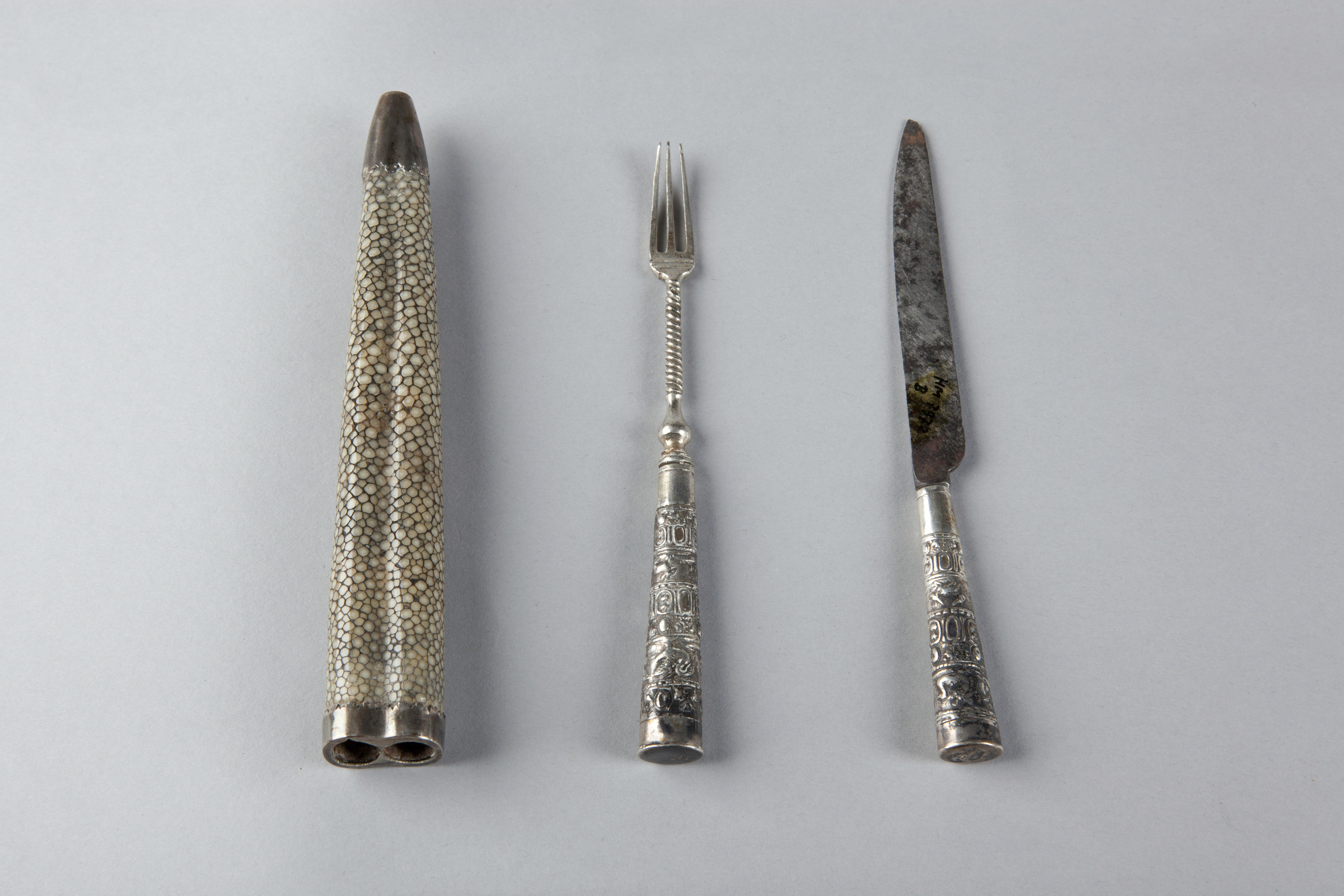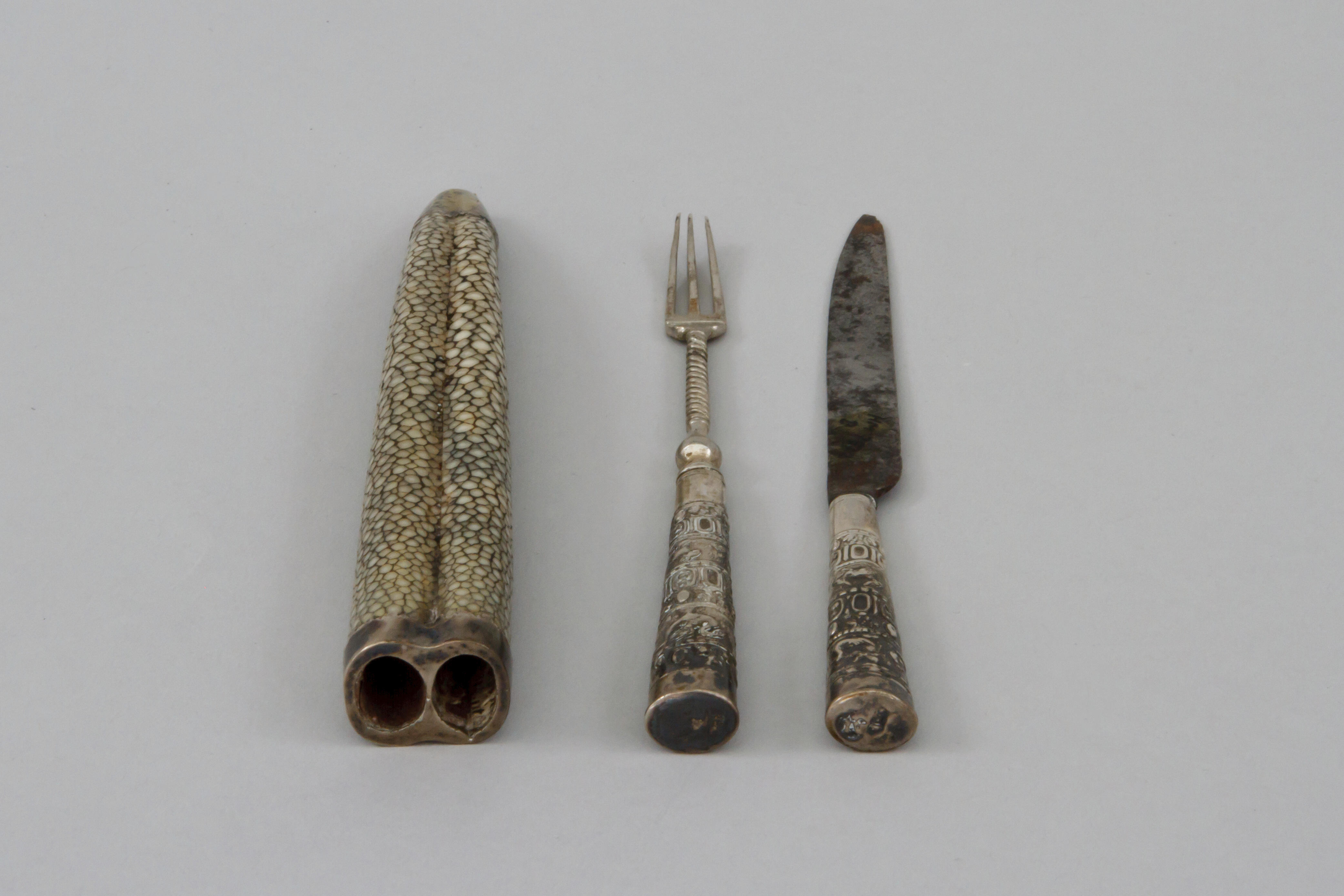 Zilveren couvert, bestaande uit een mes en vork in een etui van roggenhuid met zilverbeslag. Het couvert is in de achttiende eeuw in Amsterdam gemaakt.