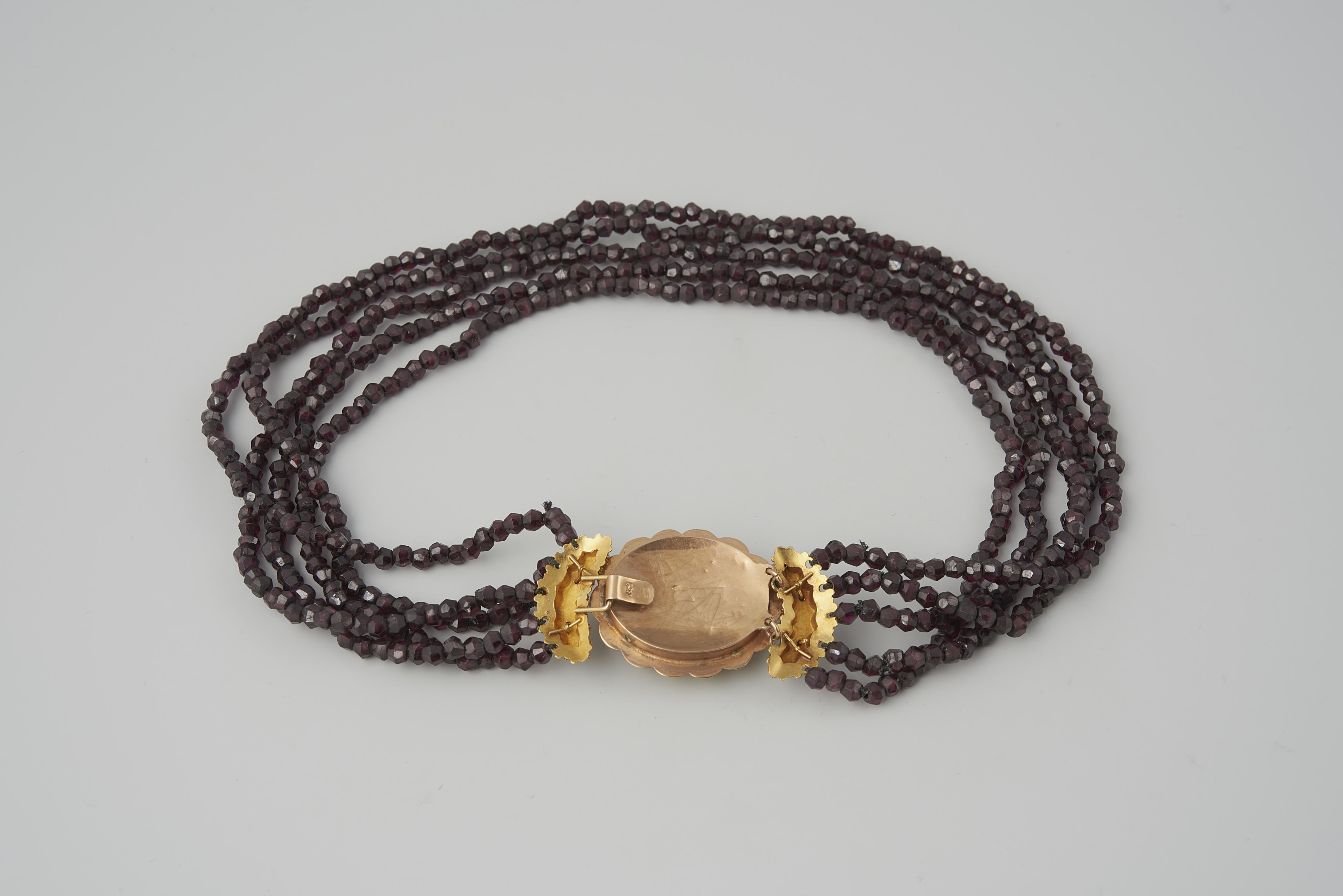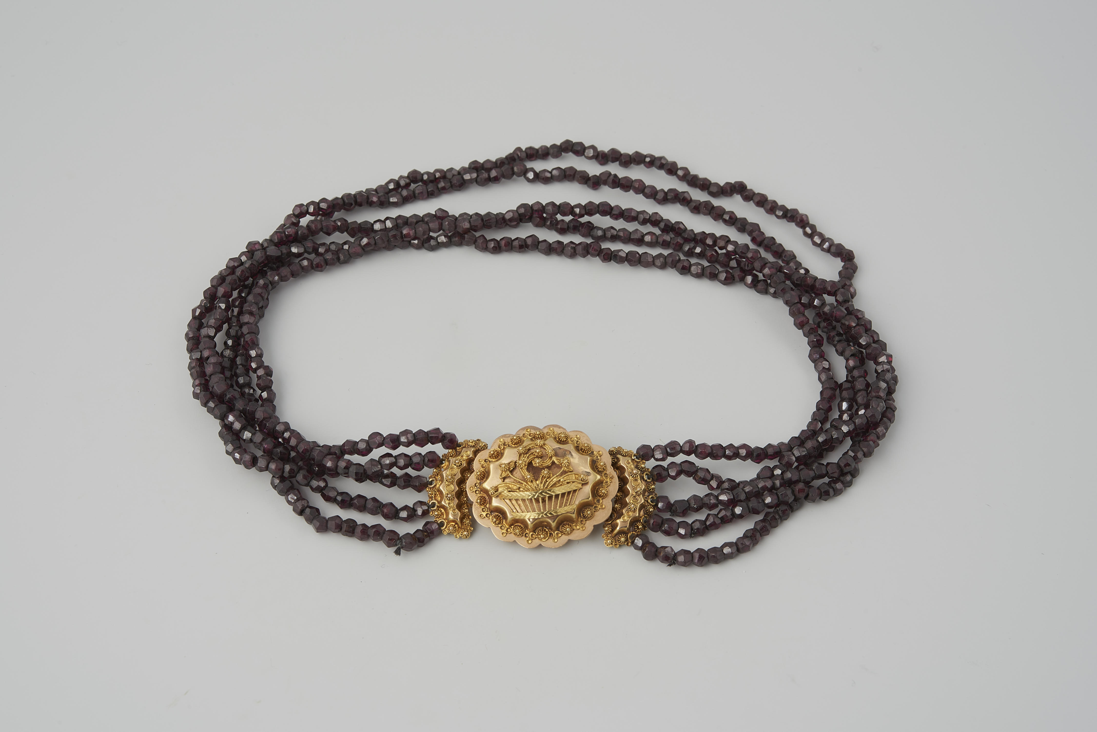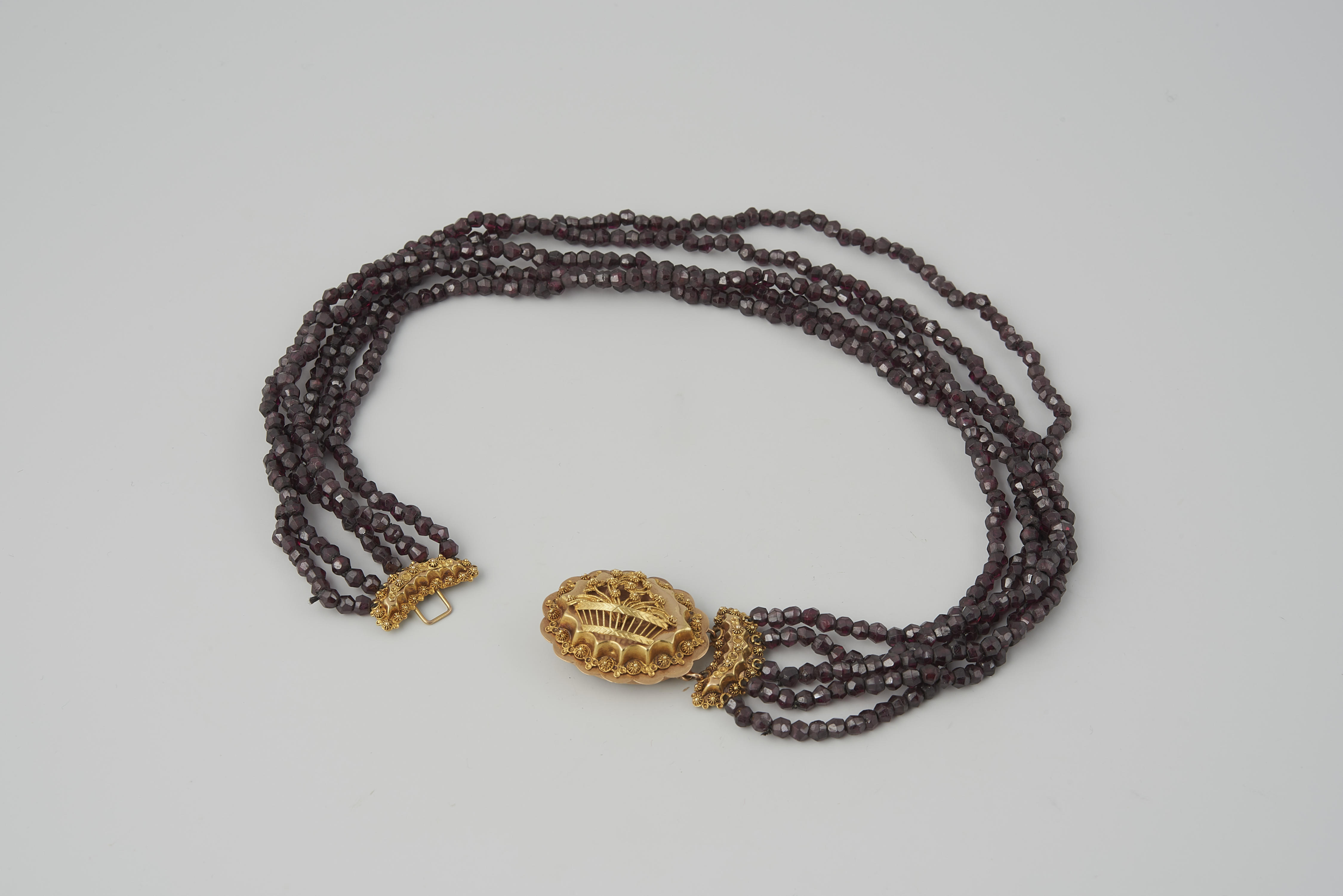 Halssnoer, bestaande uit een driedelig 14-karaats gouden slot met vijf strengen granaten kralen. Het halssnoer is gedragen door een vrouw in streekdracht uit Salland. Het meesterteken is onduidelijk. Mogelijk is het van D.P.M. Gaillard, werkzaam in Schoonhoven van 1907-1936. Het slot heeft een gehaltemerk dat gebruikt is tussen 1906 en 1953.