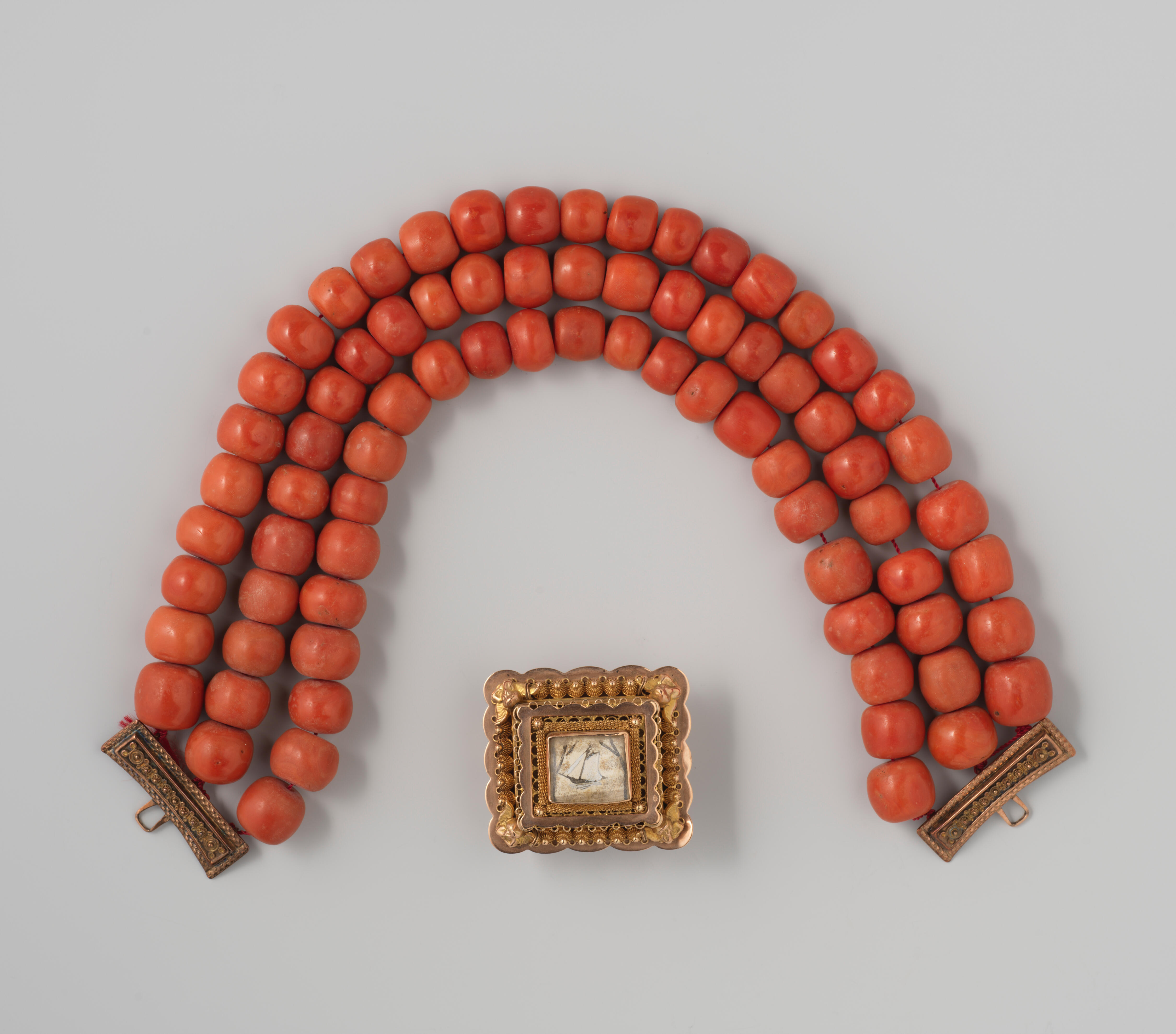 Halssnoer, gedragen door een meisje in streekdracht uit Volendam. Het halssnoer bestaat uit drie strengen bloedkoralen aan een driedelige gouden slot. In het middendeel van het gouden slot zit een voorstelling van een botter, gemaakt van haarwerk achter glas. Het slot is vervaardigd door de gebroeders Rozendaal in Hoorn. In het slot staat een gehaltemerk ...