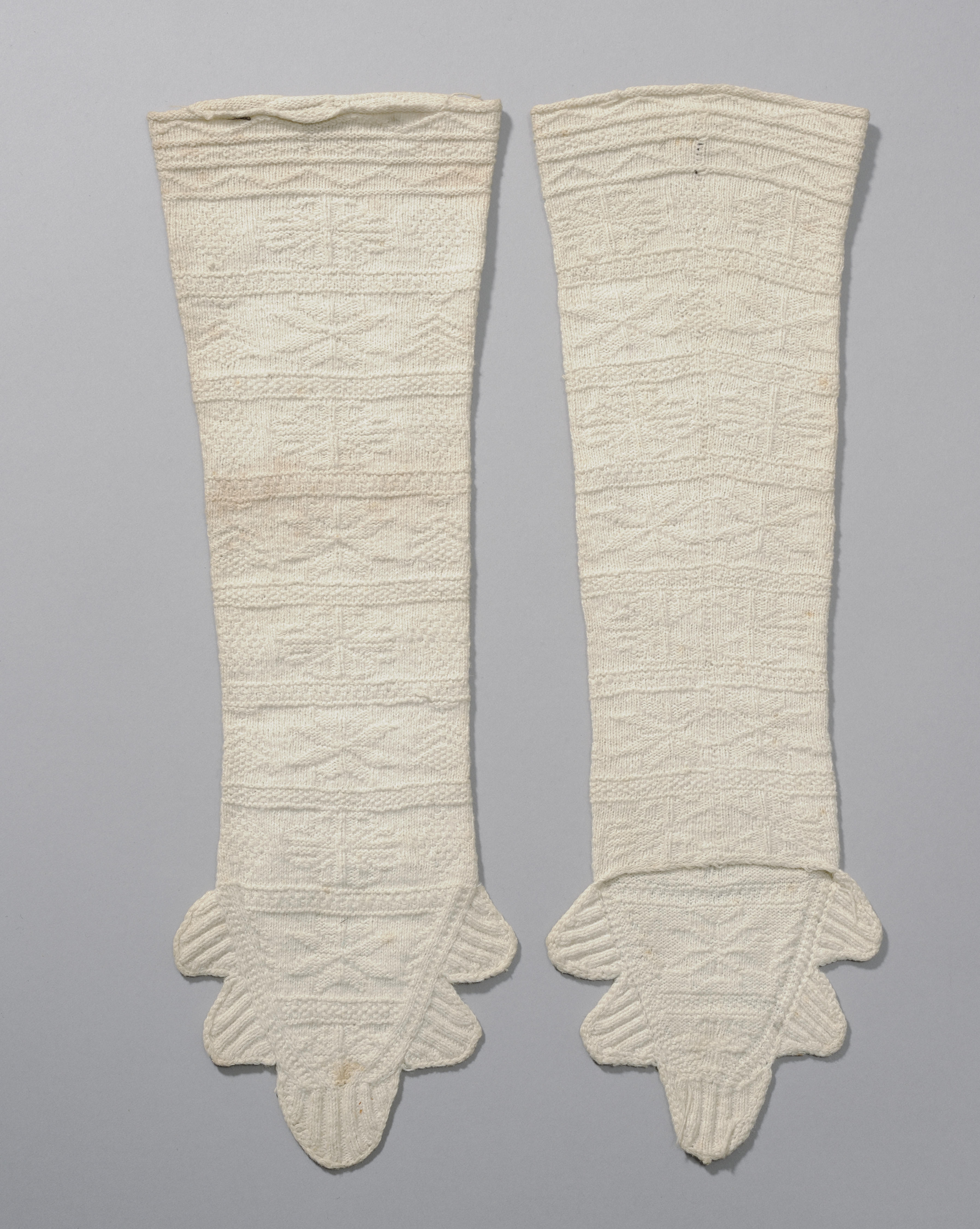 Met de hand gebreide mitaines van zogenaamd damastbreiwerk. De mitaines zijn afkomstig uit de Zaanstreek.