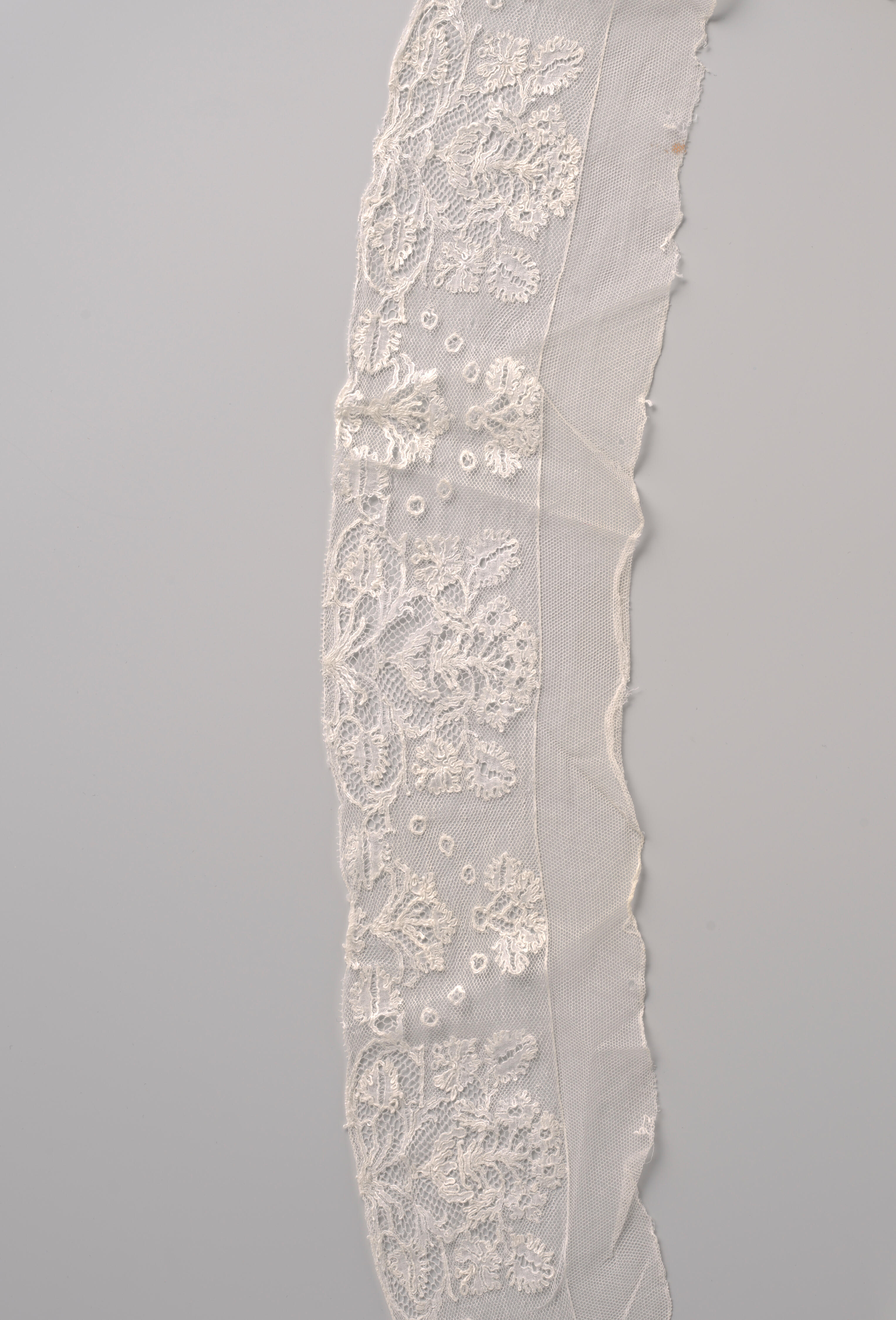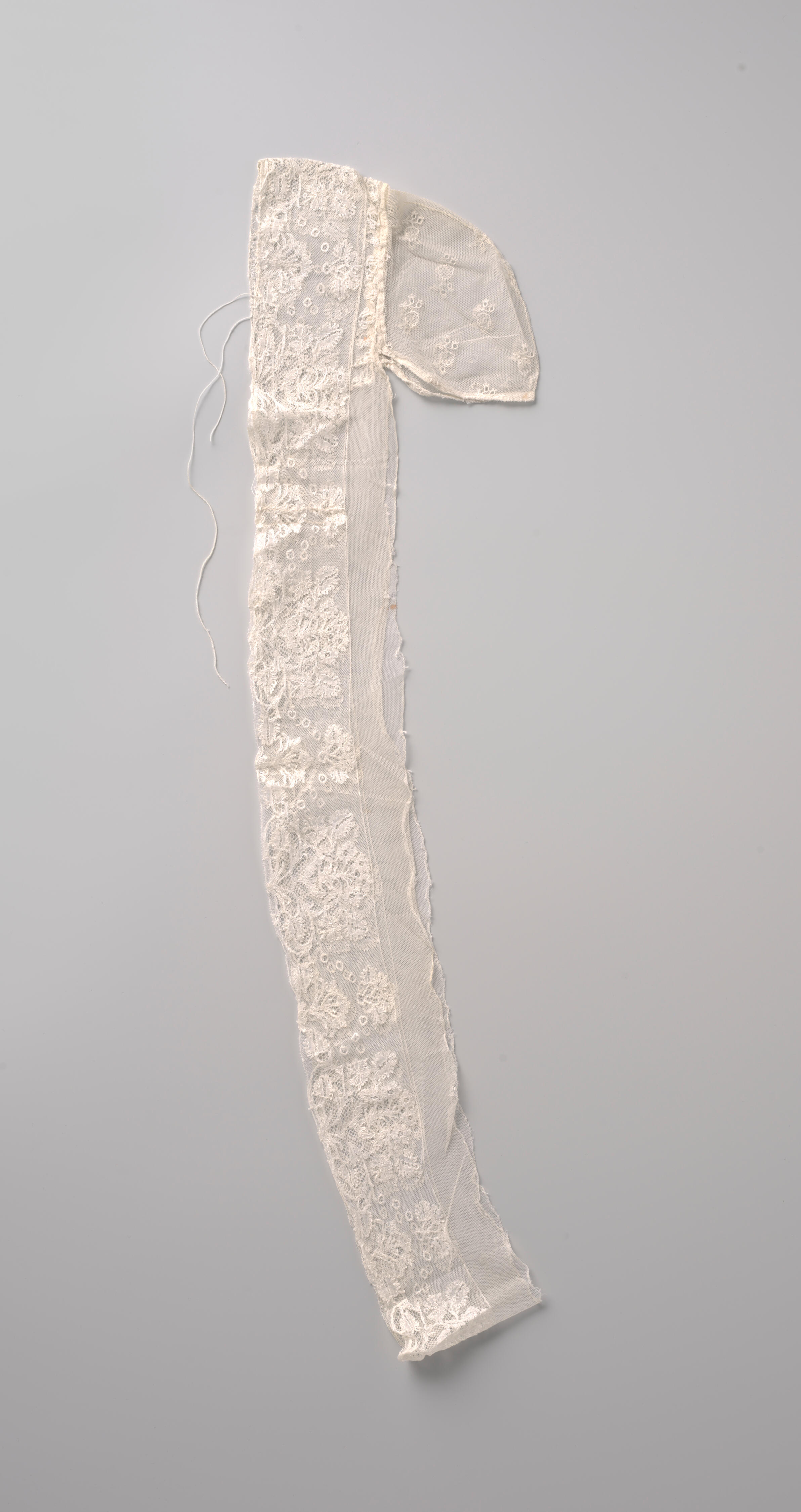 Een niet-opgemaakte oorijzermuts, een zogenoemde 'floddermuts', gedragen door een vrouw in streekdracht uit Friesland. De muts bestaat uit een bol en een kantstrook. De bol is van machinale katoenen tule, versierd met motieven in tuleborduurwerk. De kantstrook bestaat uit een strook Mechelse kloskant van circa 8,5 centimeter breed, verbreed met een strookje machinale tule van ...