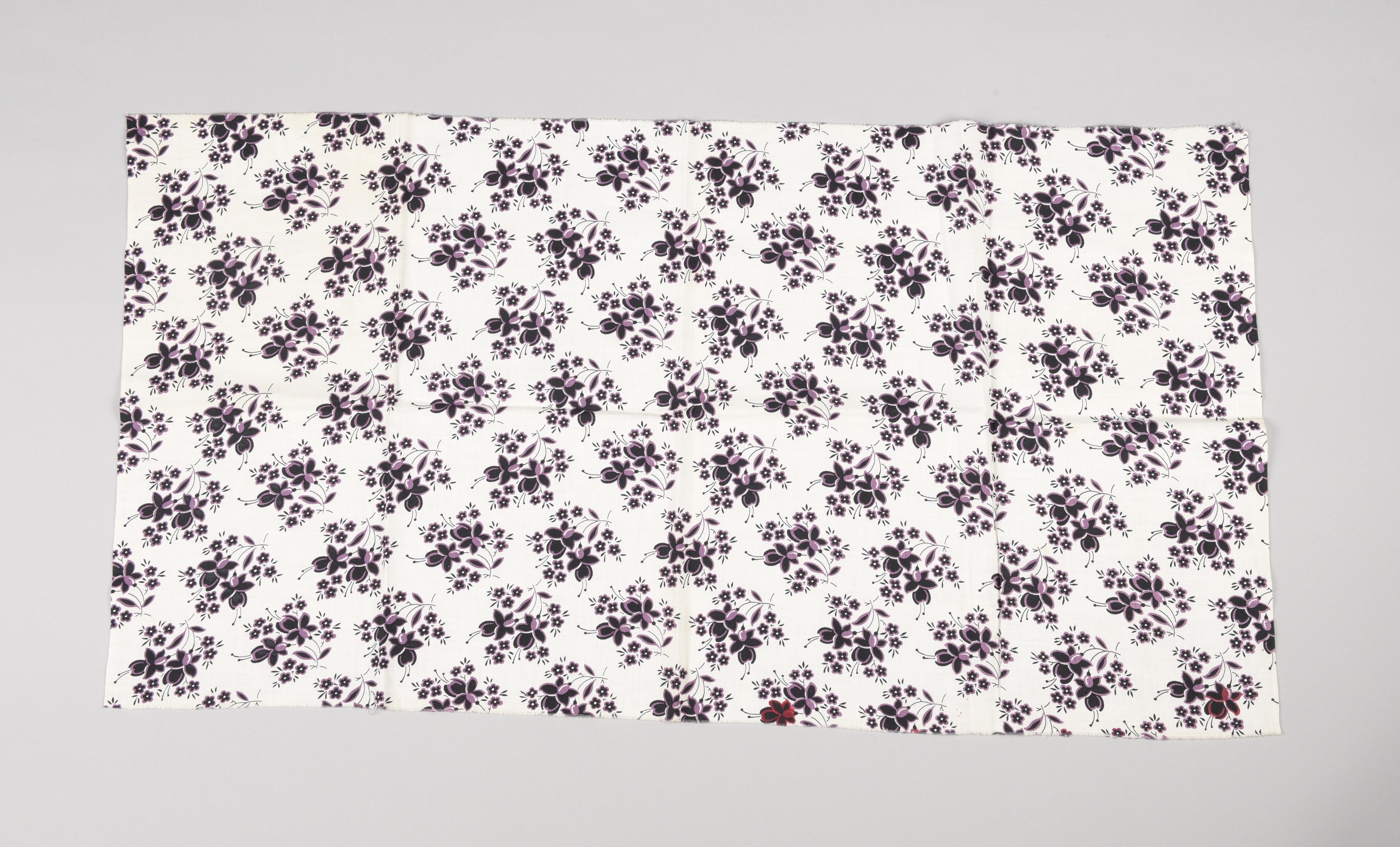 Lap bedrukte katoen, van het formaat om een kraplap van te maken en te dragen bij de lichte rouw. Vanaf het midden van de twintigste eeuw worden de kraplappen groter en waarschijnlijk is dit lapje daardoor overgebleven. De stof is geweven in keperbinding. De weefbreedte is circa 83 centimeter. Aan de achterzijde, langs de zelfkant, ...