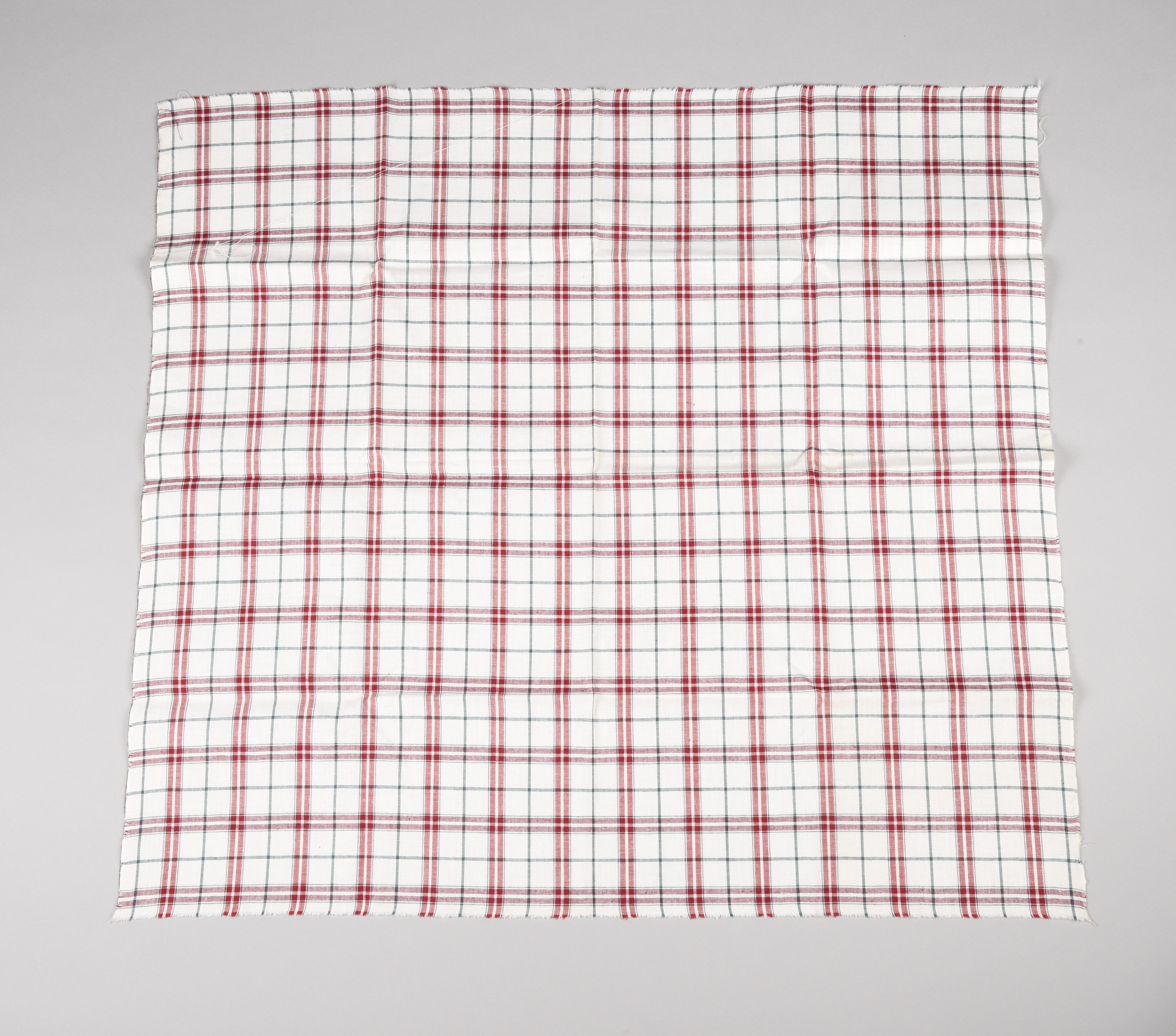 Een stuk geruite katoen, precies van het formaat om een schortstukje van te maken. De weefbreedte is 77 centimeter.