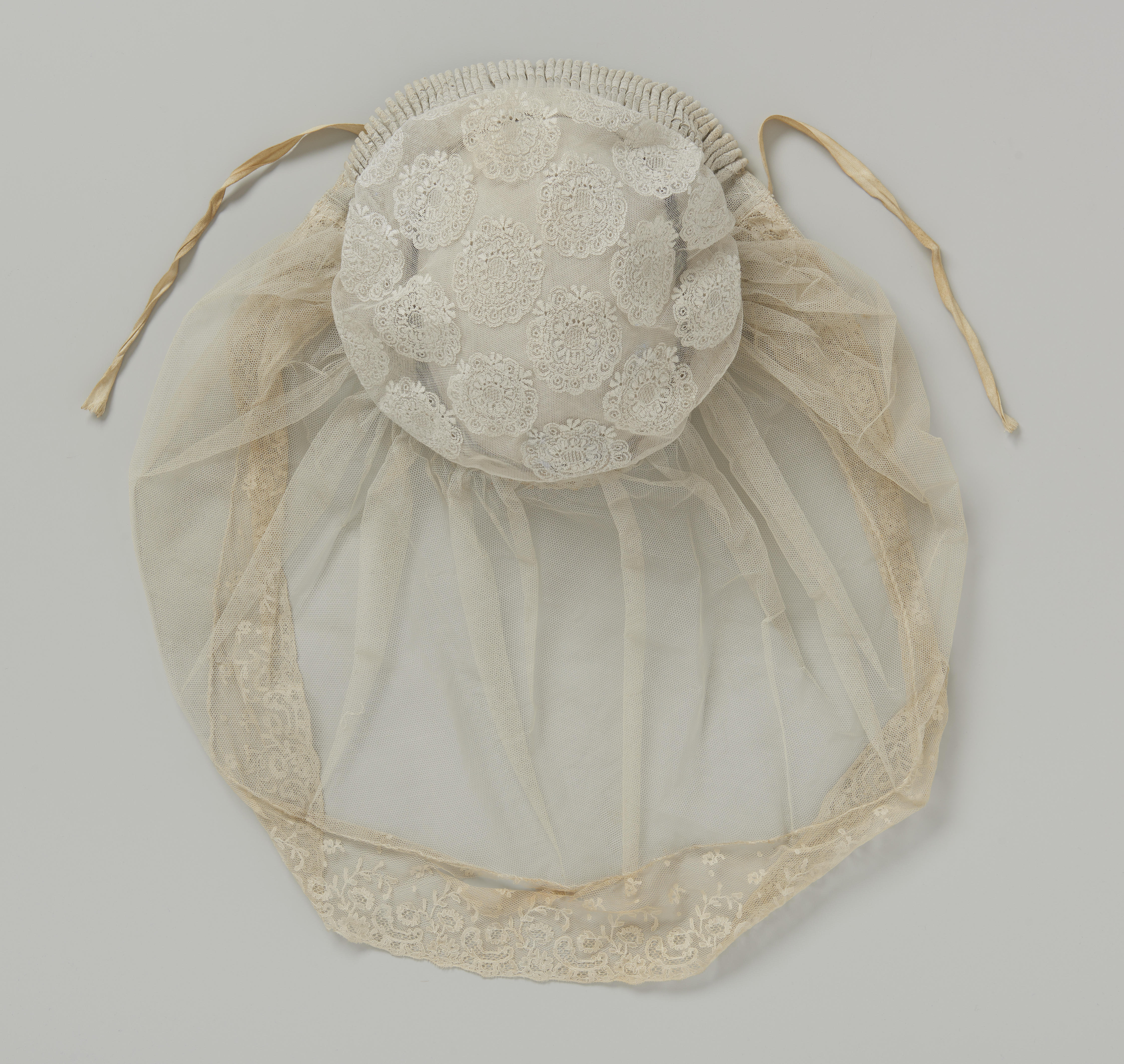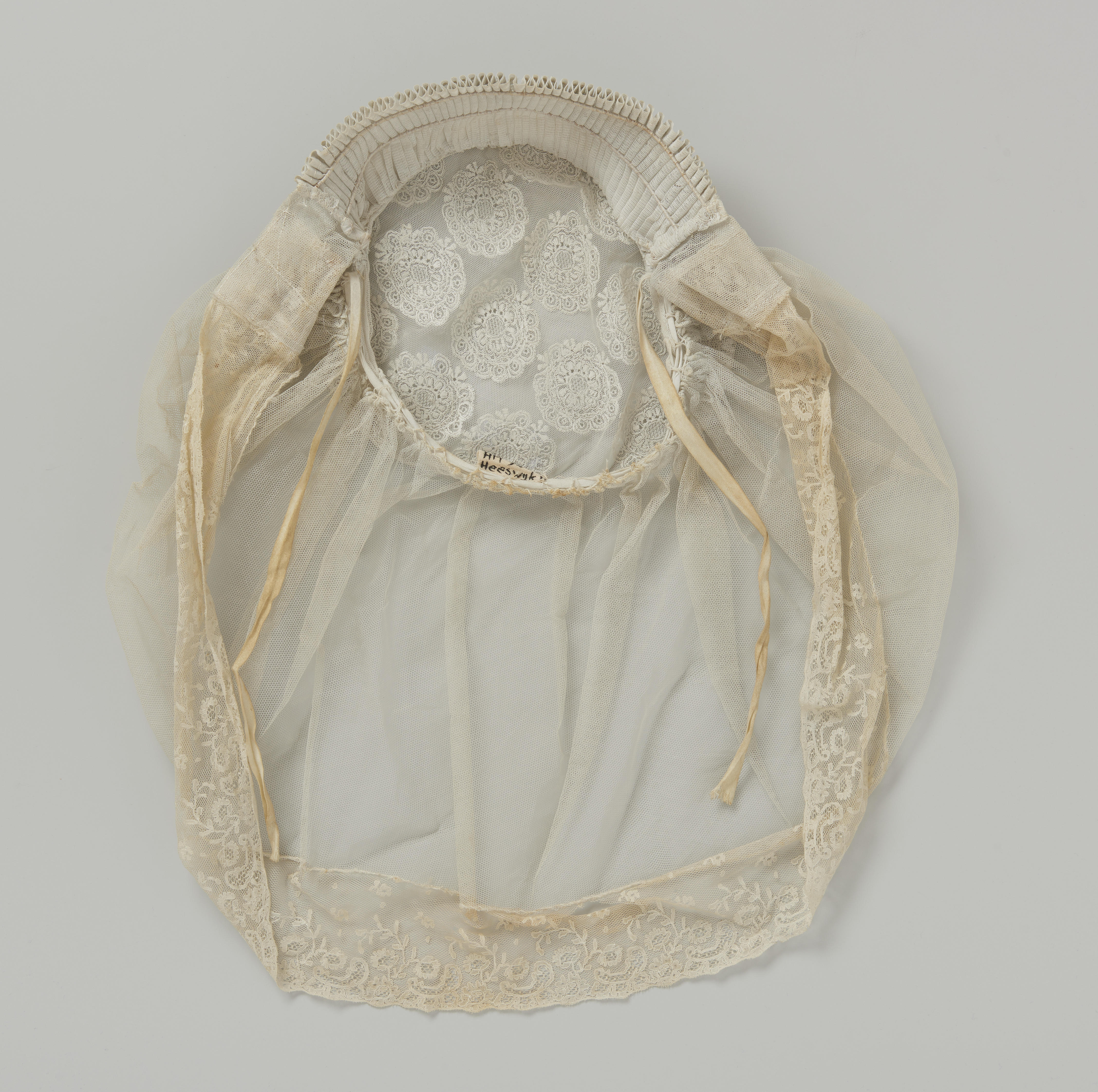 Muts met een bol van doorgestopte of geborduurde tule met rozetten van circa 5 centimeter doorsnede en een voorstrook van machinale kant op een ondergrond van tule. Aan de tulen staart zit een 7,5 centimeter brede Mechelse kloskant. De muts werd gedragen met een poffer.