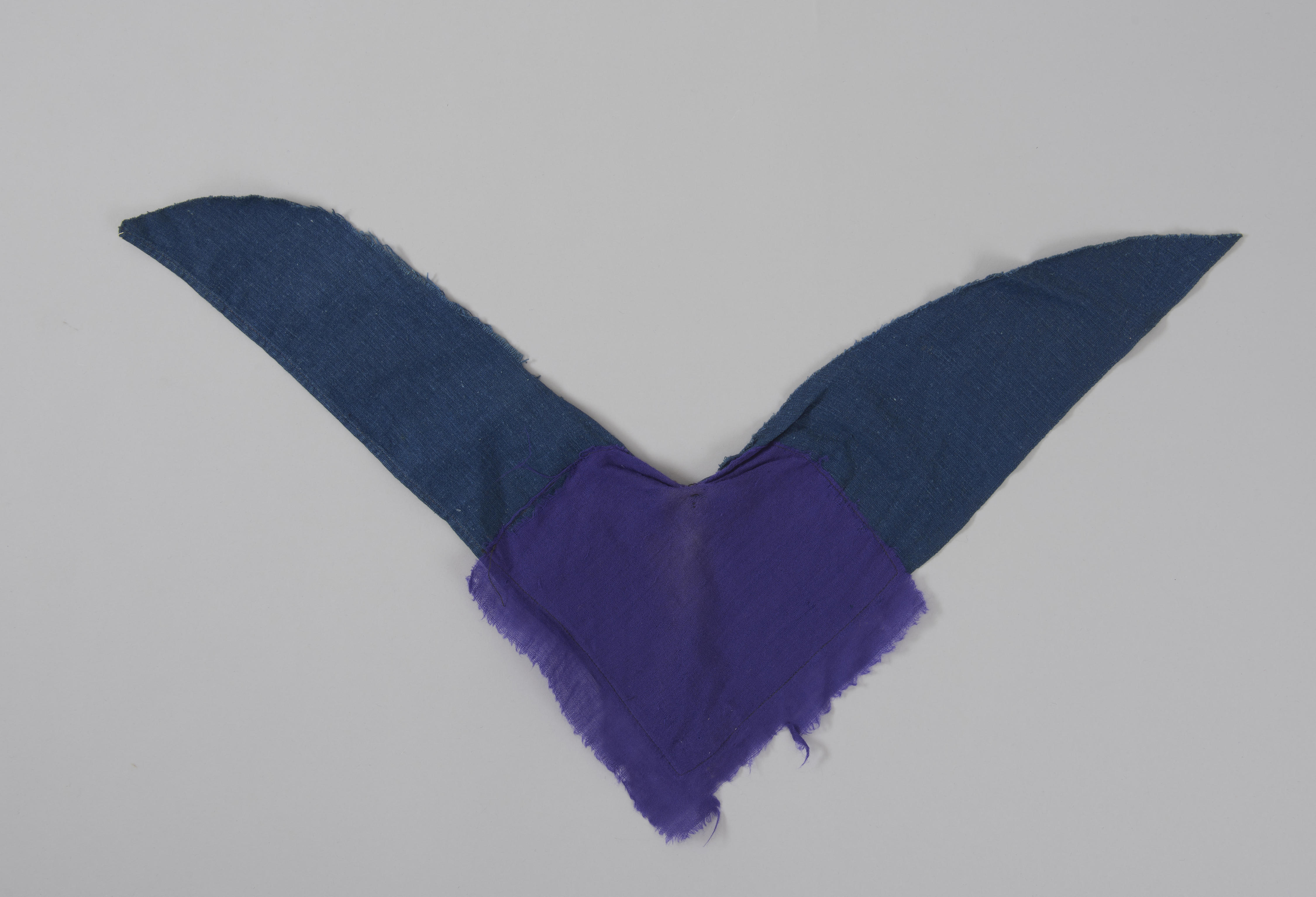 Doekje van paarsblauwe wollen mousseline, zogenoemd blauw saai. Het doekje is vergroot met een stuk blauwe katoen. Dergelijke kleine schouderdoekjes zijn gedragen door jonge meisjes en jongens in rokkendracht. Ze werden óver de kinderjurk en ónder de schort gedragen. Doekjes van 'blauw saai' werden zowel uit de rouw als bij de 'vierljaars-' en 'zeuvenwekesrouw' gedragen.
