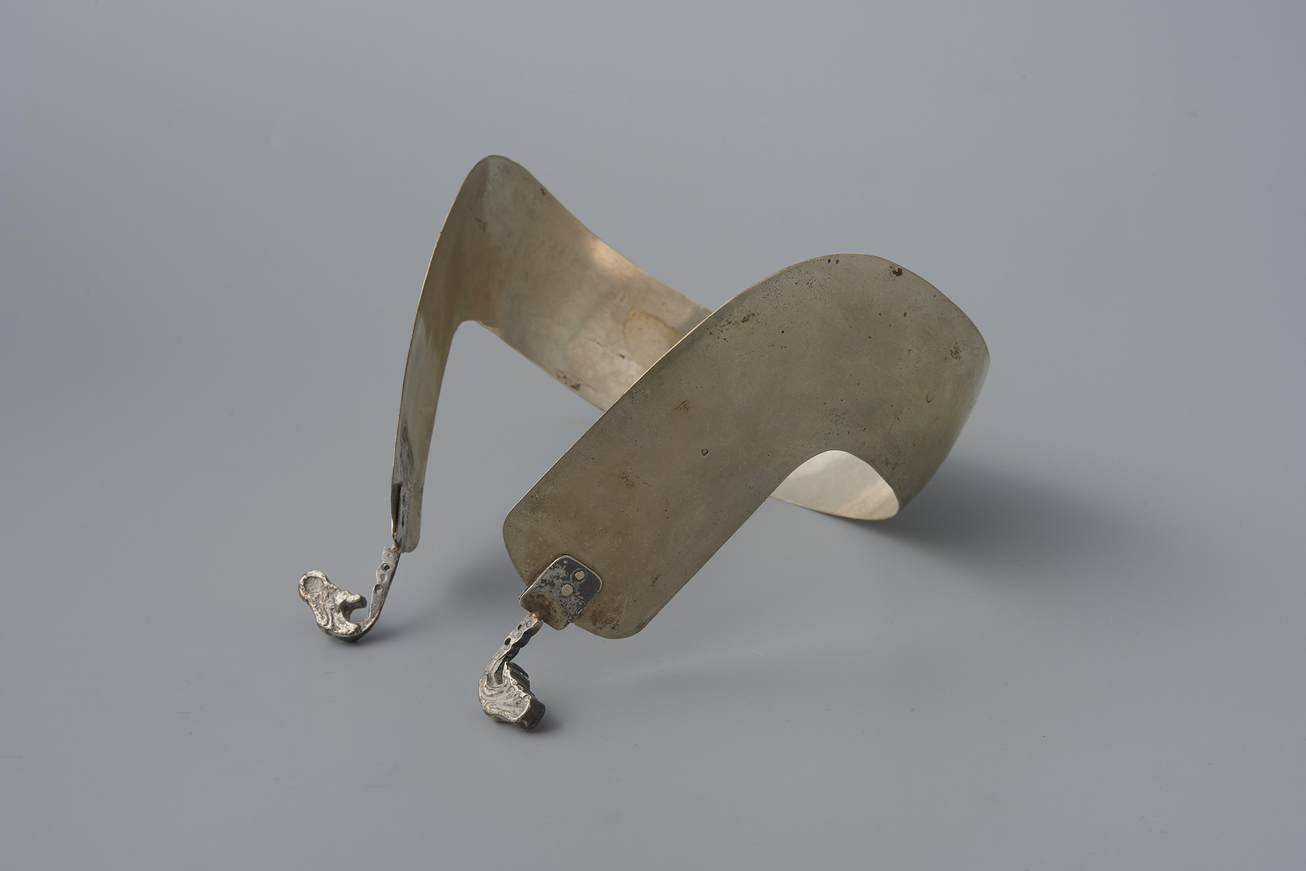Zilveren oorijzer, gedragen door een meisje in streekdracht van Urk. Aan de uiteinden van de beugel zijn twee gegoten zilveren 'knoppen' bevestigd. In de aanzetten van de knoppen zitten twee gaatjes, waardoor spelden gestoken kunnen worden om de muts aan het oorijzer vast te steken. De aanzetten van de knoppen zijn aan de beugel geklonken. ...