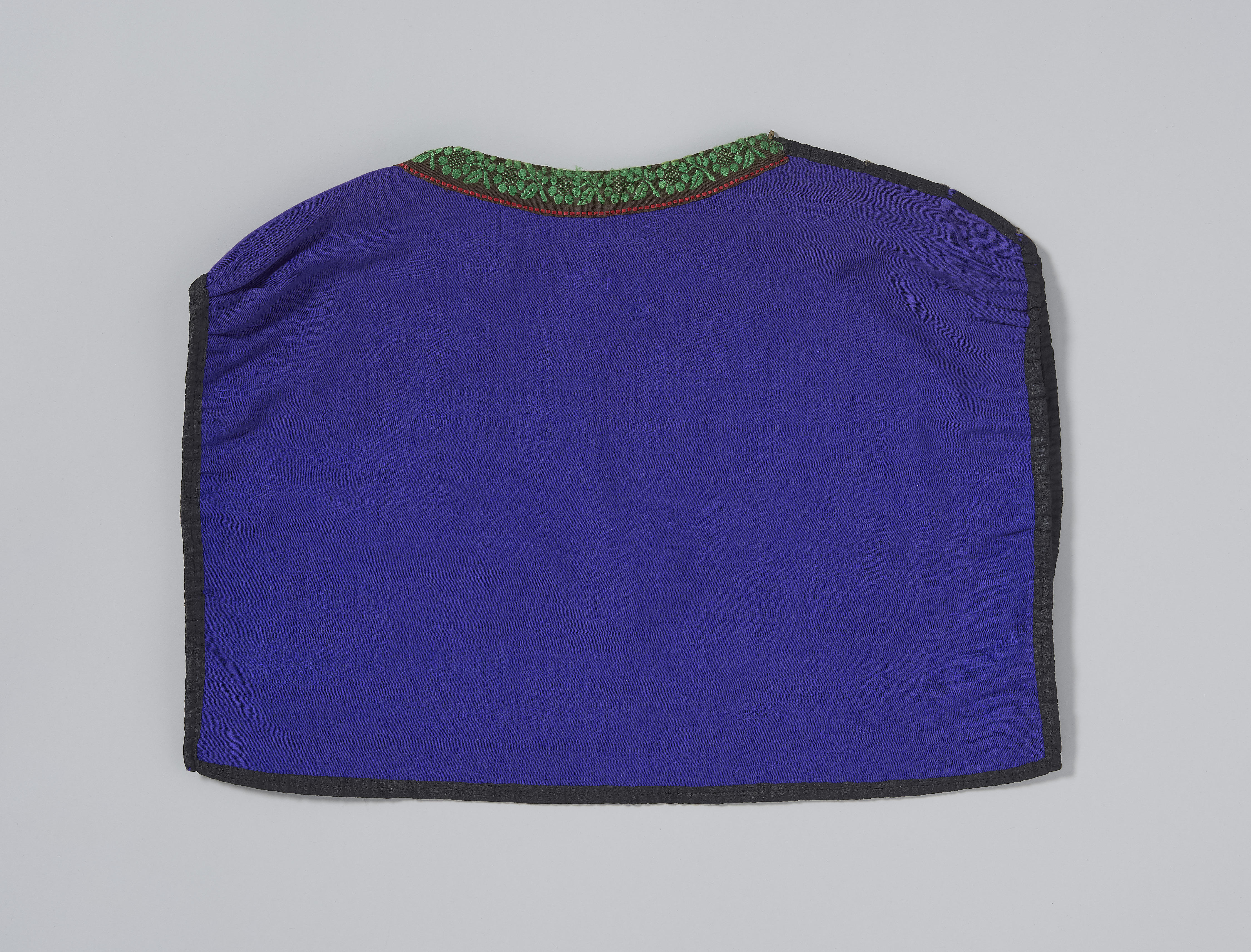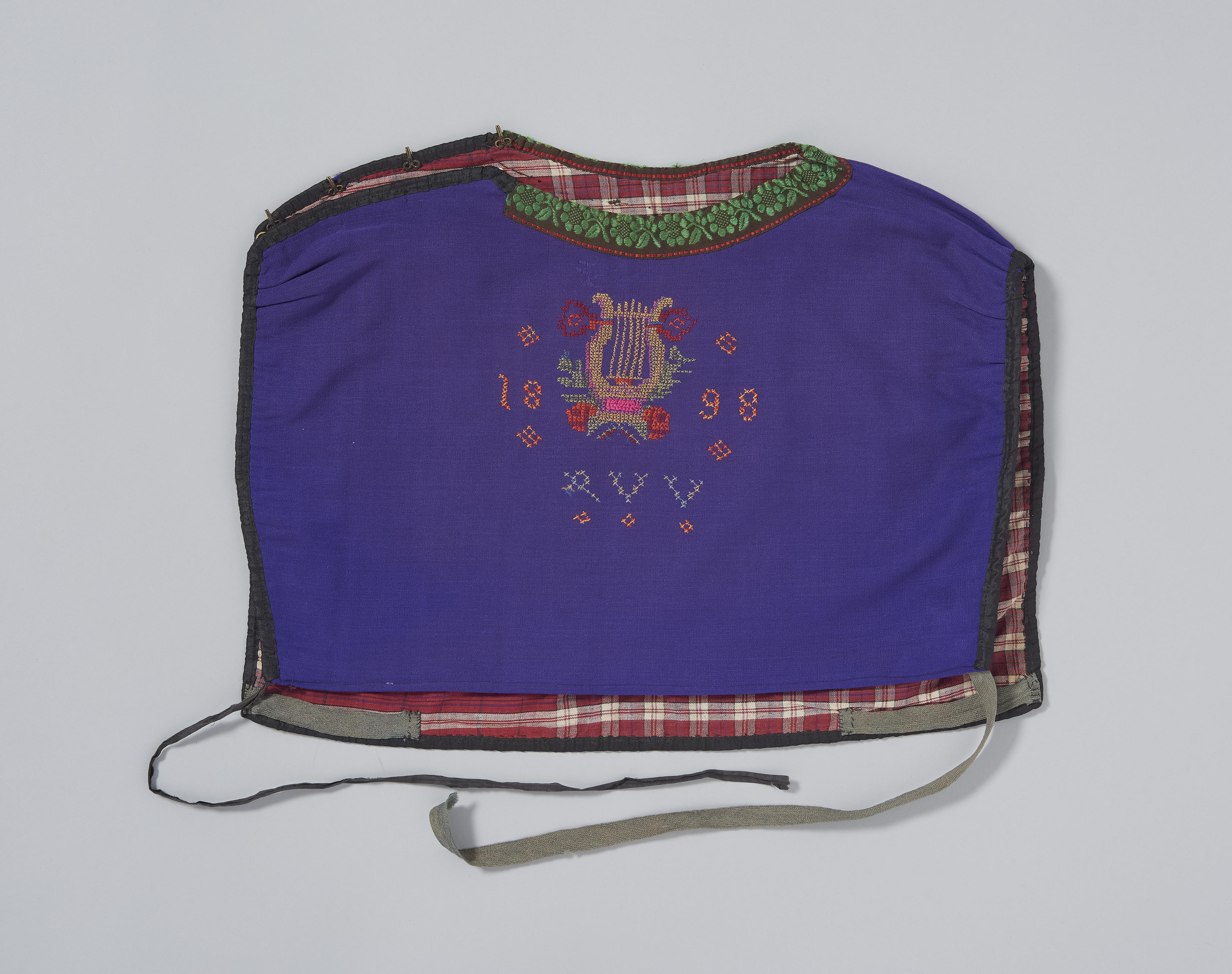 De geborduurde kraplap van paarse wol heeft het opschrift ‘1898’, met daaronder de letters ‘R V V’. De kraplap is als deel van een heel vrouwenkostuum in 1949 aangekocht van Mariap van Urk. Het is niet duidelijk of de kraplap in 1949 is vervaardigd of dat het om een oudere kraplap gaat.
