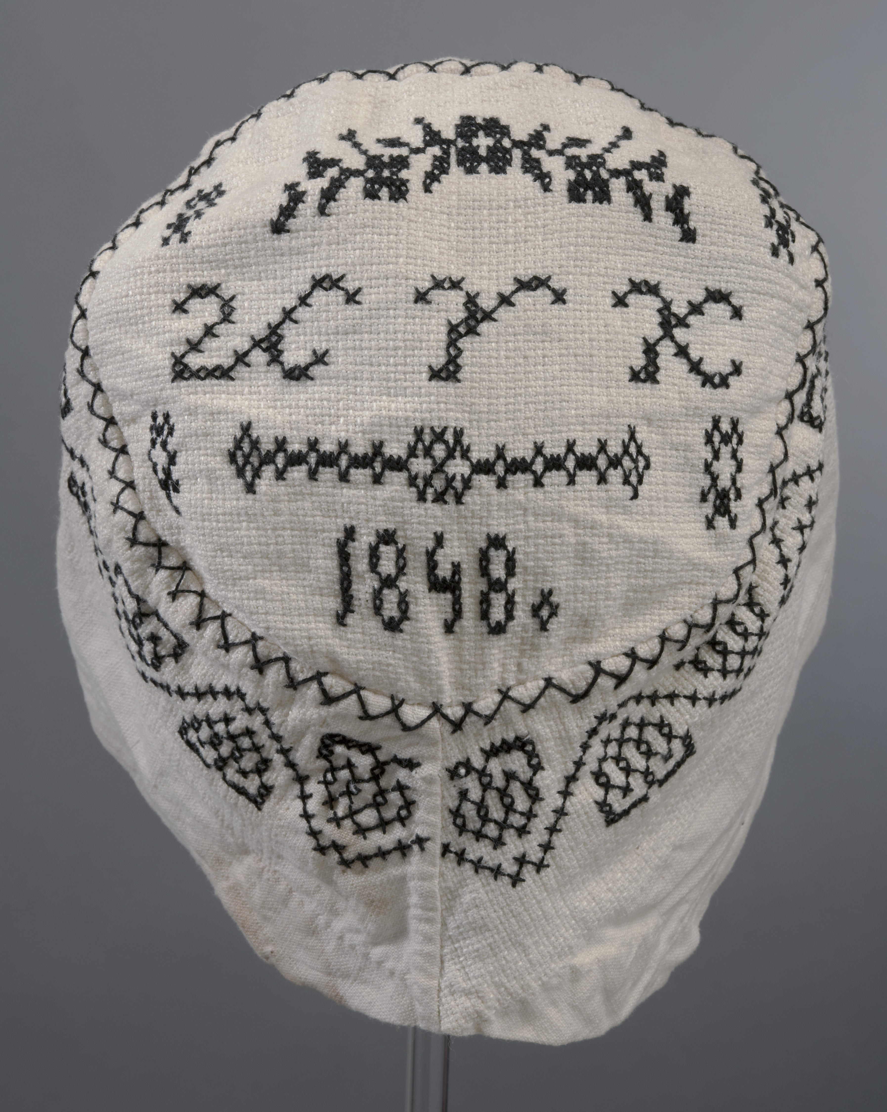 Deze ondermuts ziet eruit als een ondermuts uit het midden van de negentiende eeuw. Na 1875 werd het borduursel kleiner en werden alleen nog initialen geborduurd. Rond 1900 werd ook dat niet meer gedaan, alleen nog voor jonge meisjes. De hul die eroverheen ging, had toen geen doorschijnende bol meer. Waarschijnlijk dateert de muts niet, ...
