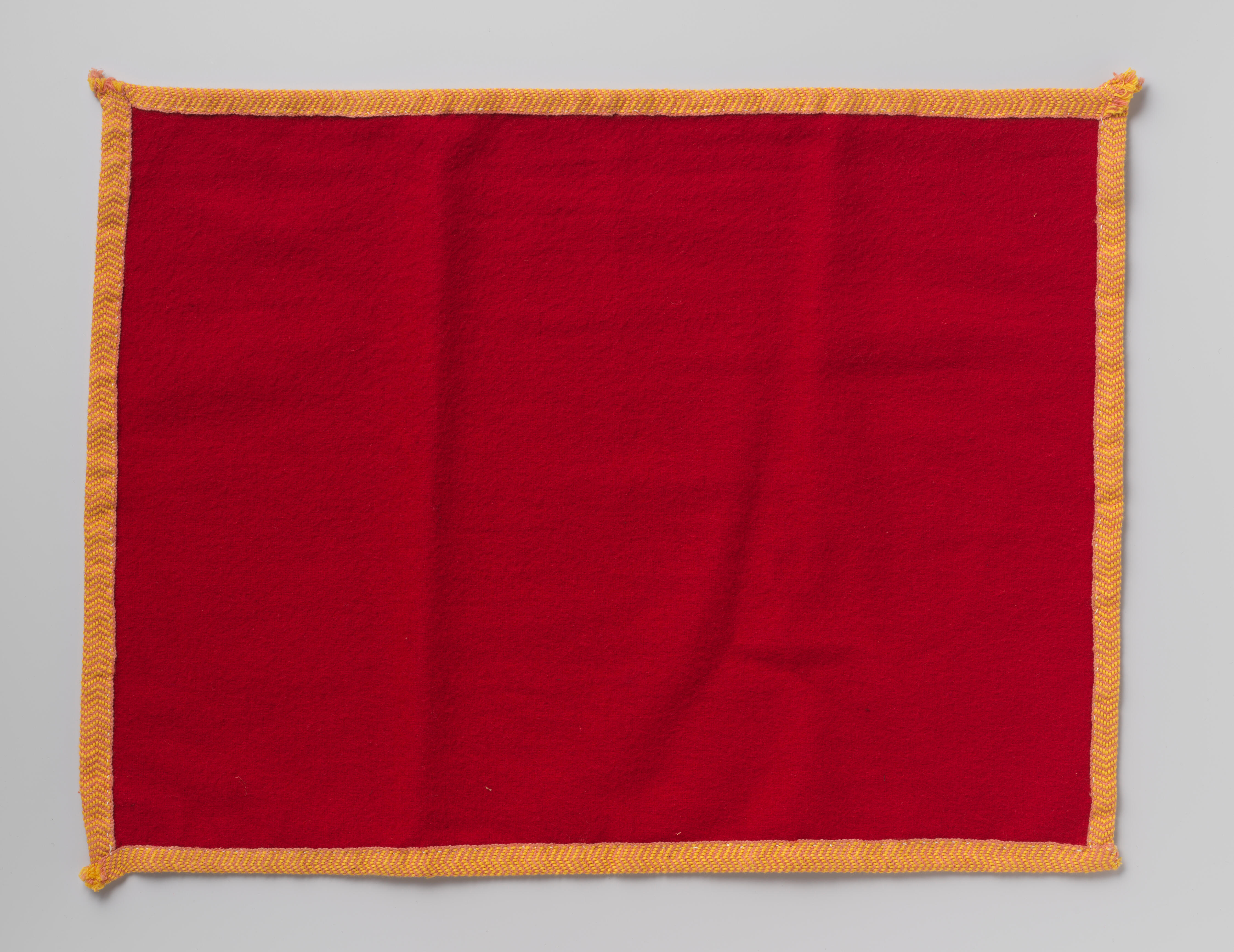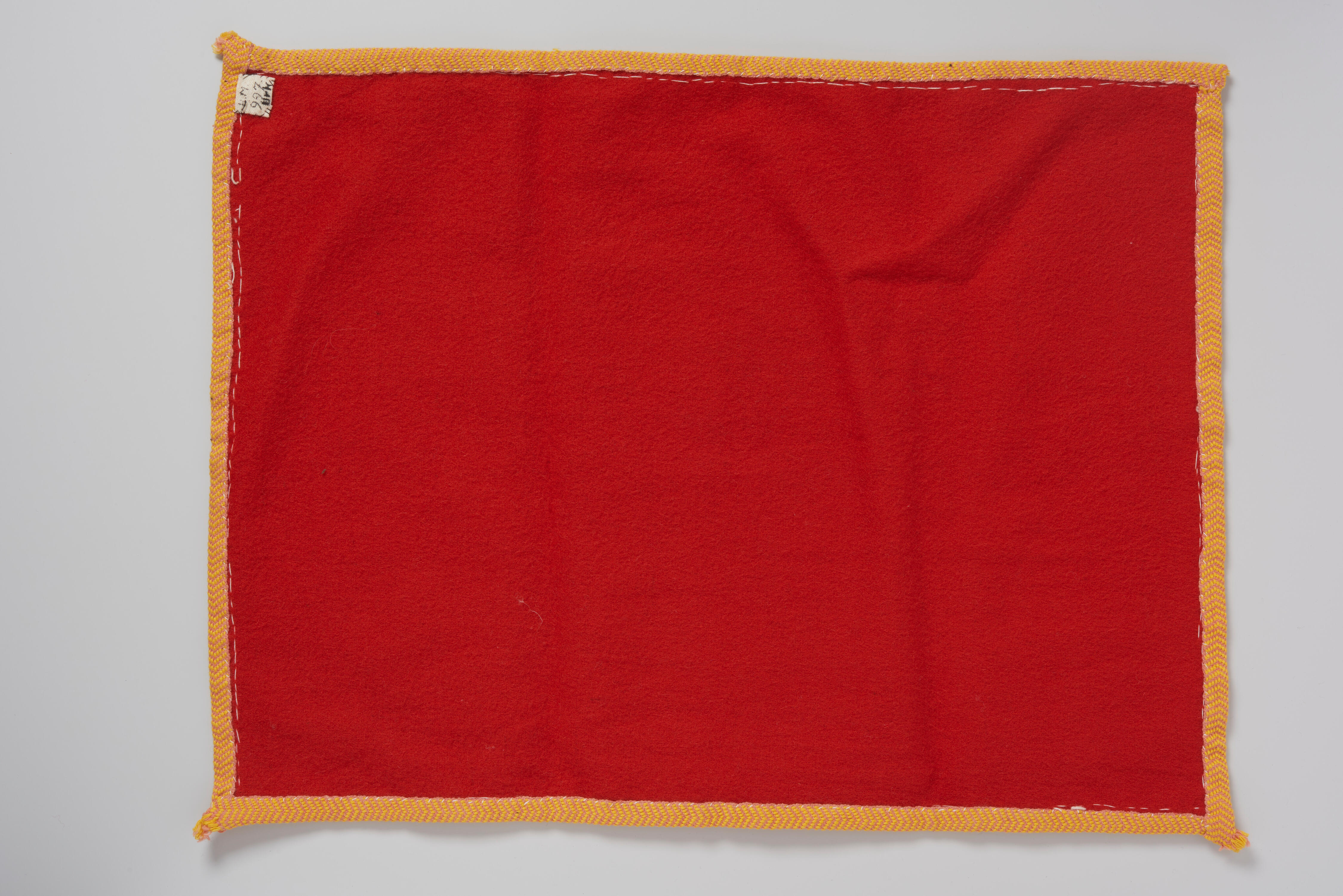 Rechthoekige borstlap van rode baai. De borstlap werd door Urker meisjes en vrouwen in streekdracht gedragen in de opening van het korset, onder de kraplap. Deze borstlap is aan vier zijden omgeboord met geel katoenen band.