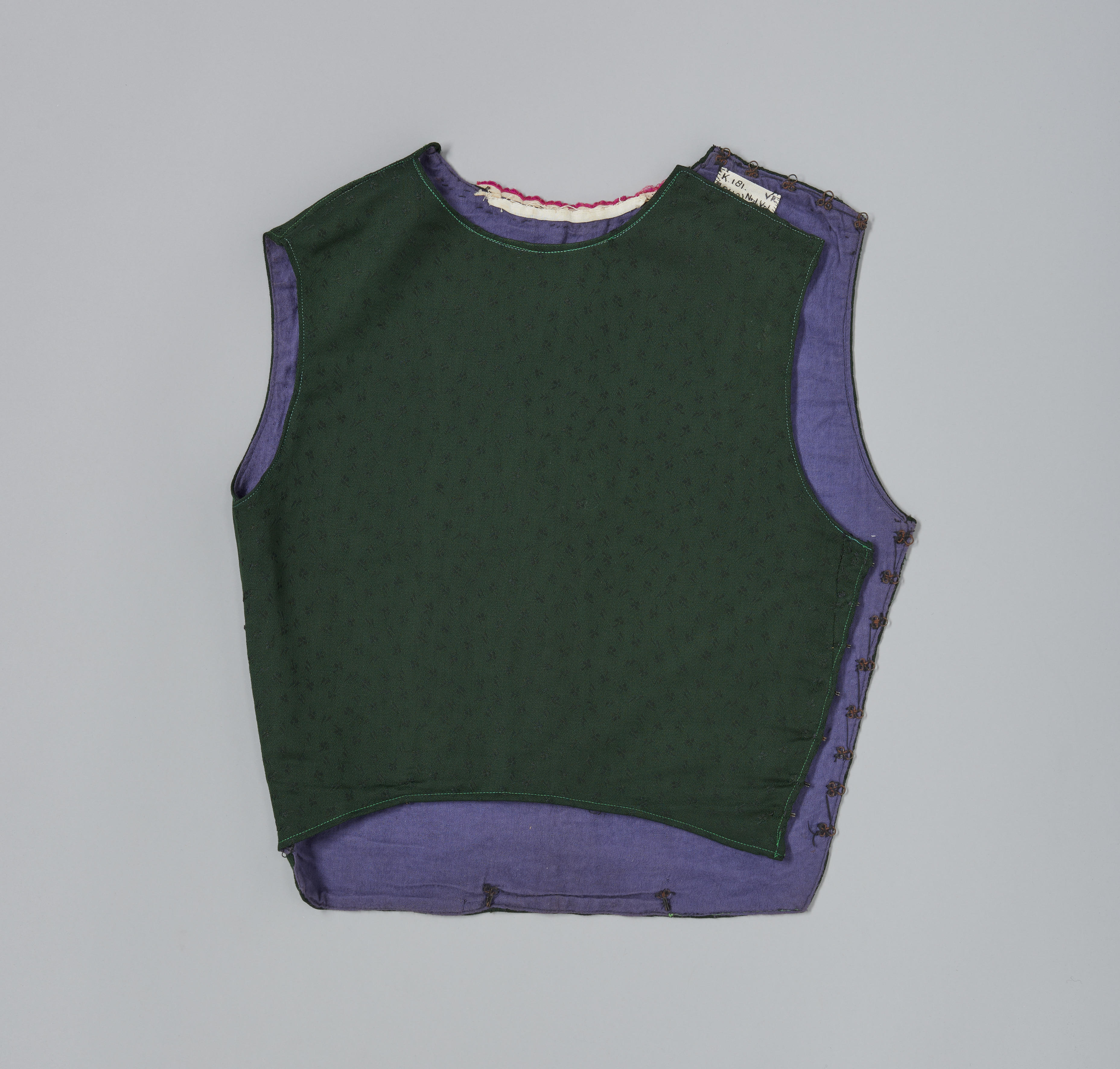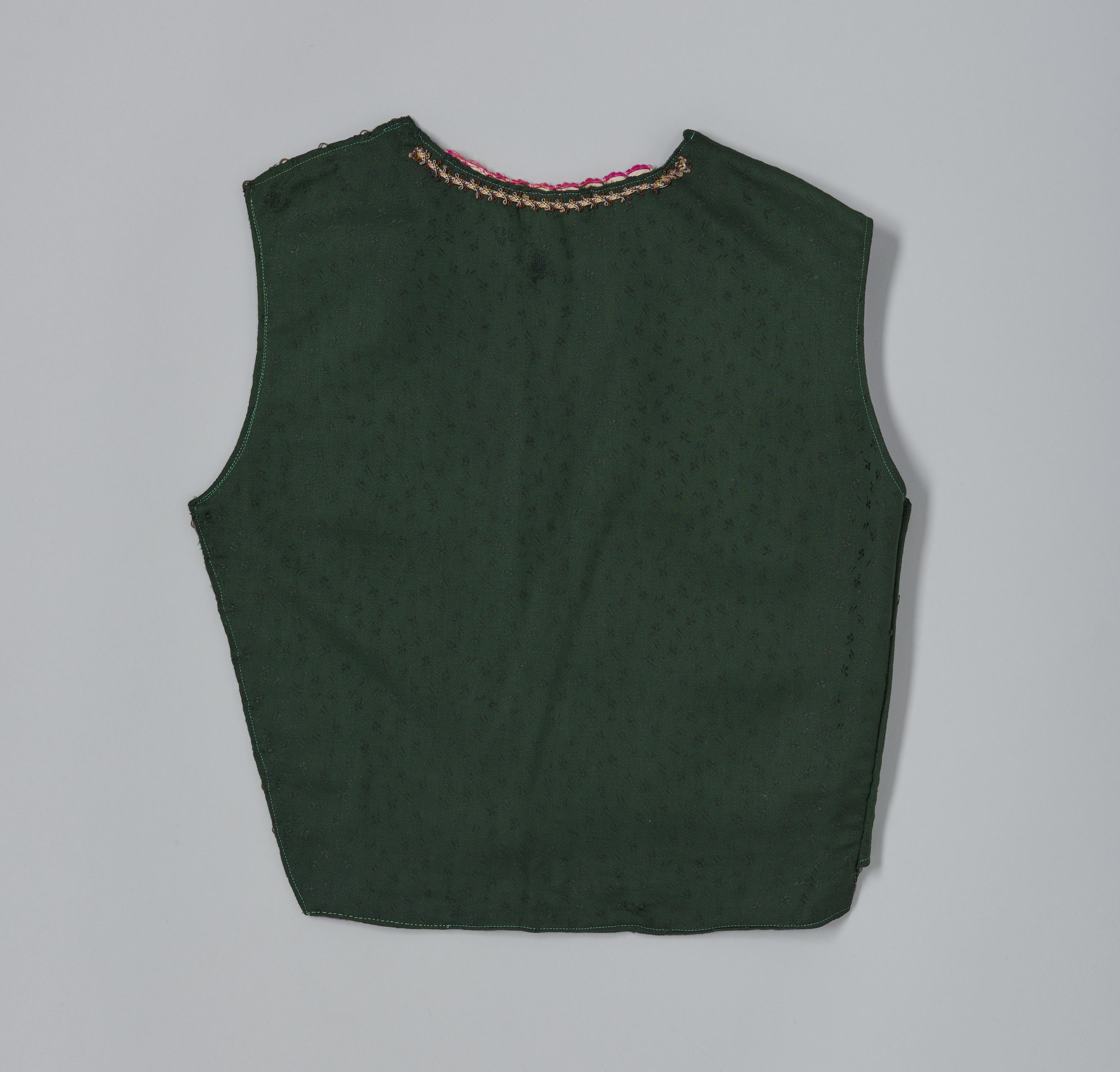 Kroplap van groene wol met ingeweven bloemetjes en afgezet met een veelkleurig galonnetje. De kroplap is gevoerd met paars flanel. Hij is gedragen in Oldebroek.