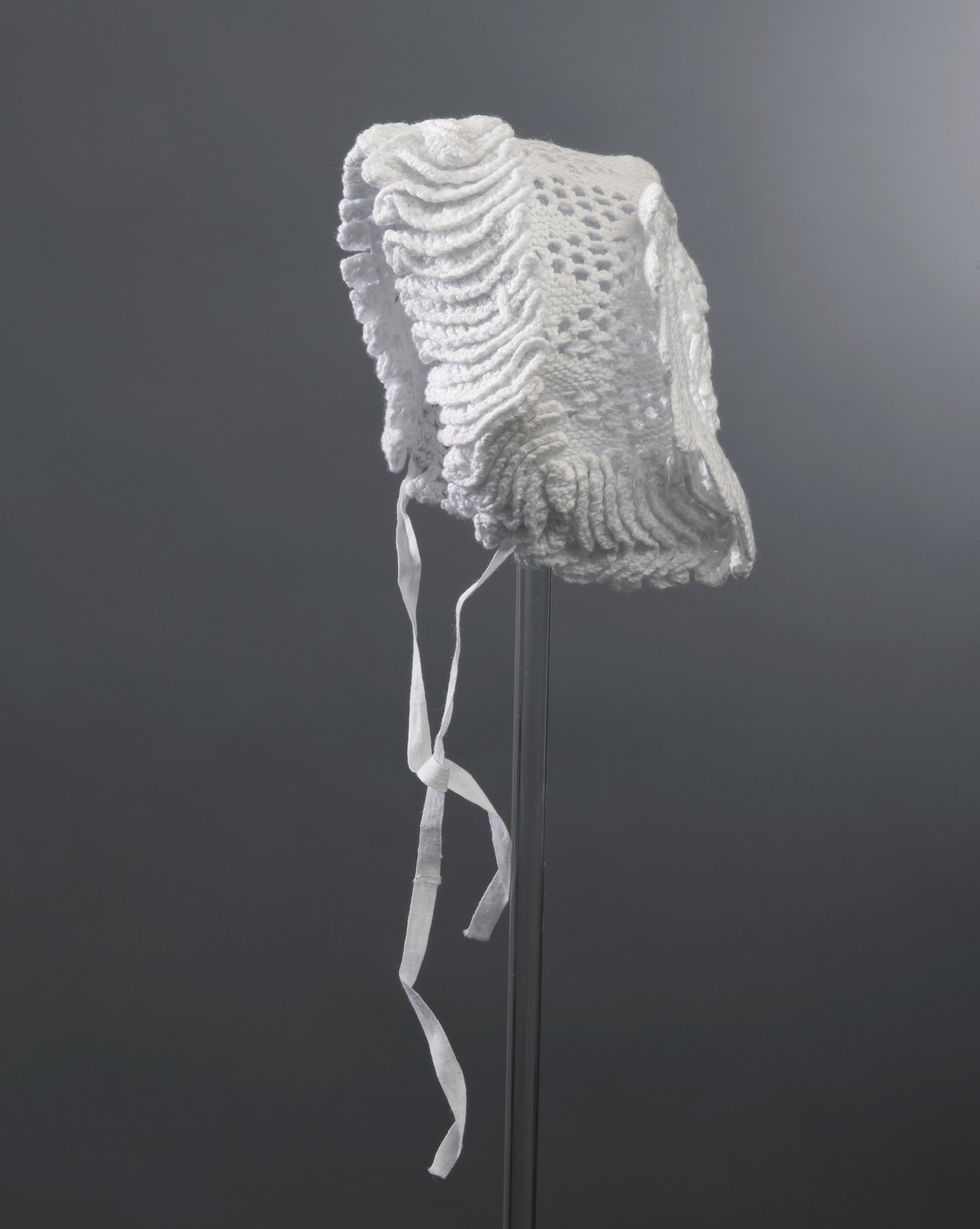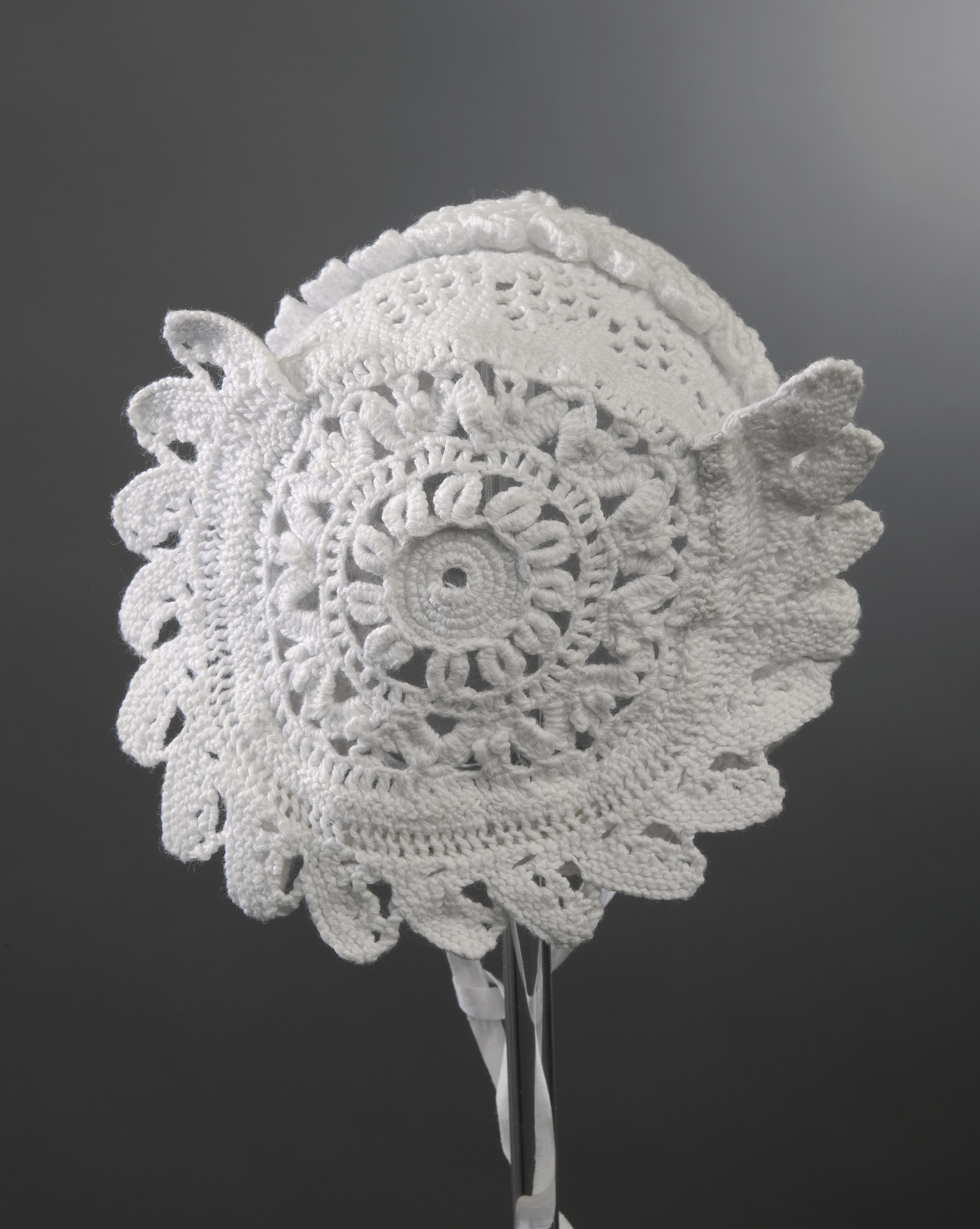 Babymutsje, gebreid en gehaakt van witte katoen. Het model van dit mutsje lijkt op dat van de daagse mutsen van volwassen vrouwen.