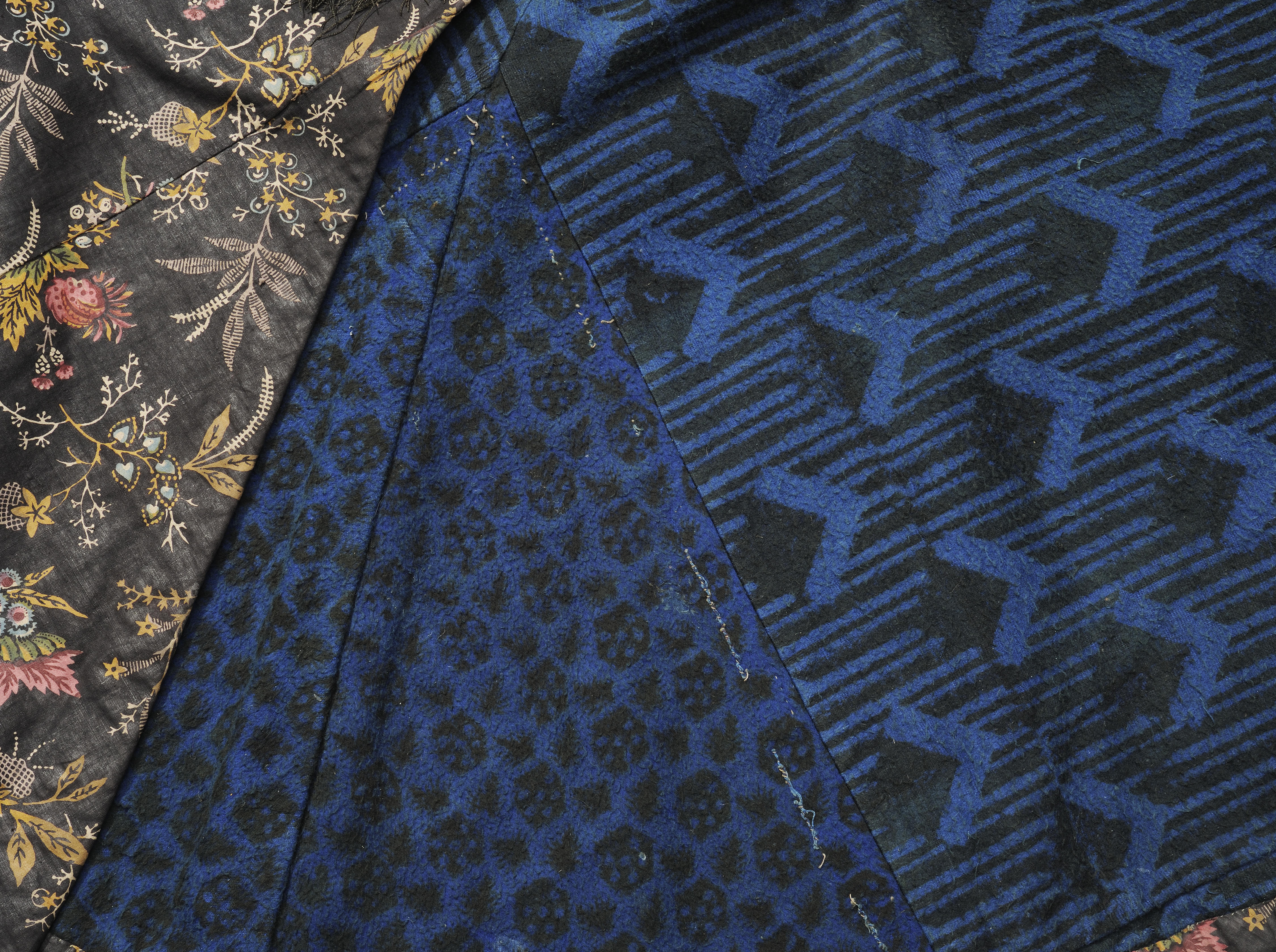 Cape van Europese katoendruk met een donker fond (zogenaamde ‘nachtgrond’), een wollen voering en een fluwelen kraag. De cape is afkomstig uit Rozenburg.