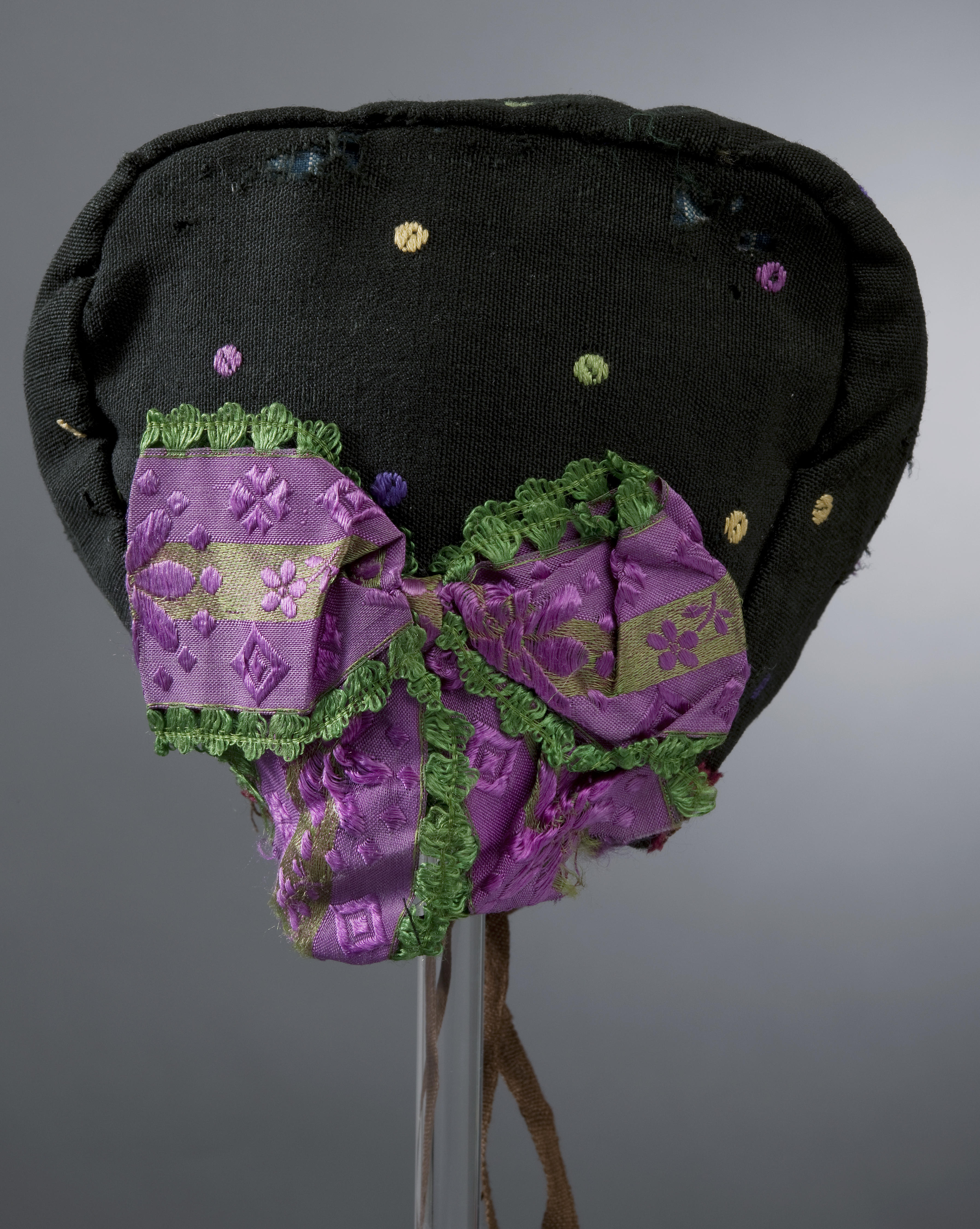 Wollen mutsje voor een baby of klein kind. Het mutsje is gevoerd met verschillende stukjes textiel. Het heeft een versiering van kleurig lint en band. Voor babykleding werden vaak restjes van mooie stoffen gebruikt.