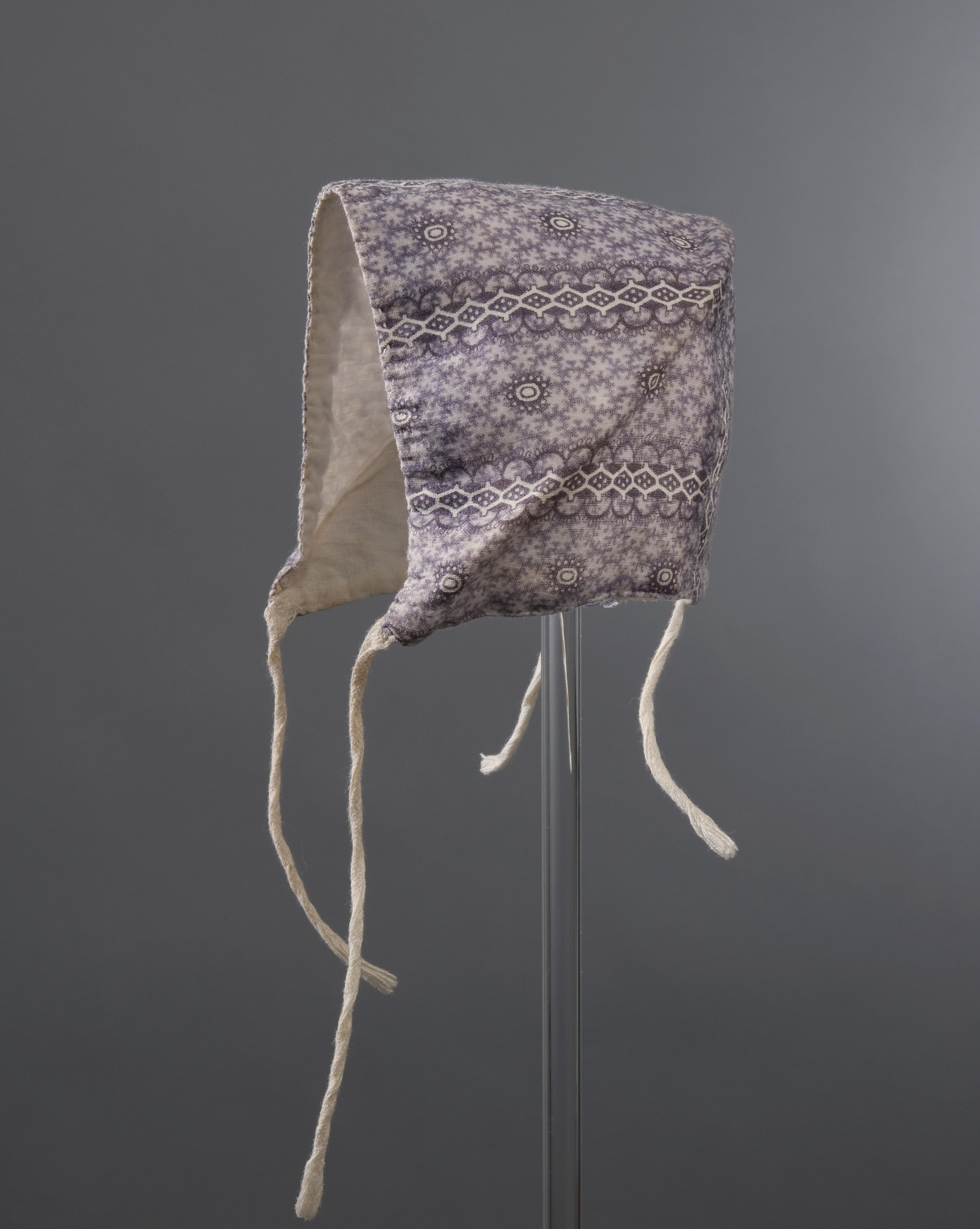 Babymutsje van bedrukte katoen, afkomstig van Zuid-Beveland.