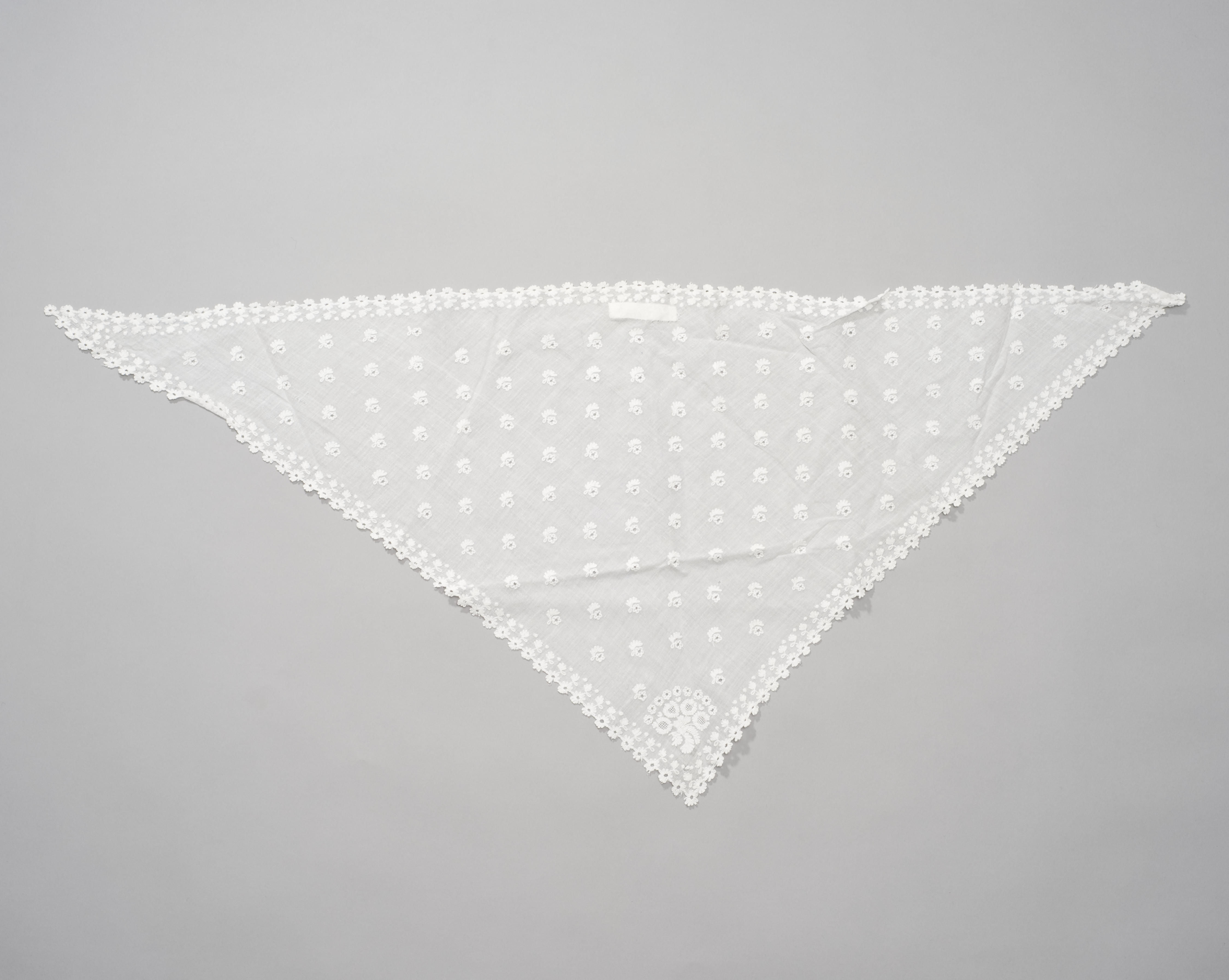 Driehoekige fichu van witte katoenen batist, waarvan de rand-, hoek- en strooimotieven in kettingsteek geborduurd zijn met witte katoen in deels opengewerkte blad- en bloemmotieven. De fichu is afkomstig van Walcheren.