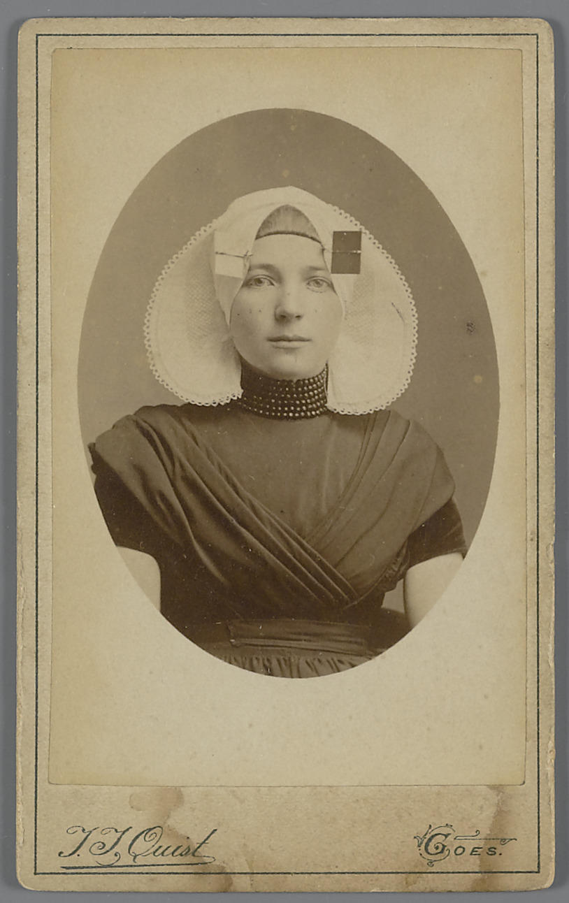 Vrouw in protestantse Zuid-Bevelandse streekdracht. Ze is gekleed in zondagse rouwdracht. Onder de bovenmuts draagt ze een ondermuts en een oorijzer met gouden 'stikken', de vierkante oorijzeruiteinden. Rond haar hals draagt de vrouw een halssnoer met zes strengen kralen en een sluiting aan de achterzijde. De bovenmuts is in de rouwperiode niet van kant maar ...