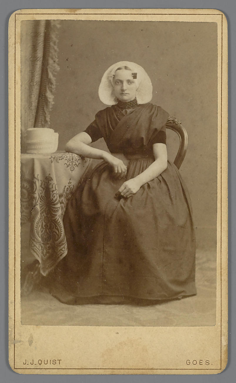Vrouw in protestantse Zuid-Bevelandse streekdracht. De vrouw draagt zondagse rouwdracht. Ze heeft het haar in een scheiding. De opname dateert uit een periode dat de vrouwen en meisjes hun haar nog konden dragen zoals zij dit zelf wilden. Een scheiding kwam echter weinig voor. Men ziet in deze tijd ook veel protestantse vrouwen met het ...
