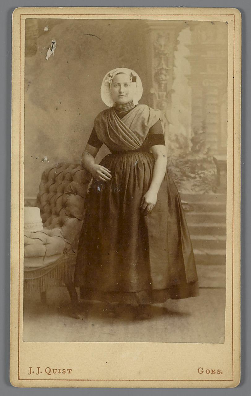 Vrouw in protestantse Zuid-Bevelandse streekdracht. Ze is gekleed in de zondagse dracht. Onder de kanten muts draagt ze een tussenmuts en een ondermuts met een oorijzer. Boven de gouden 'stikken', de vierkante oorijzeruiteinden, zijn twee paar mutsspelden in de ondermuts gestoken. Om haar hals draagt de vrouw een halssnoer met een sluiting in de nek. ...