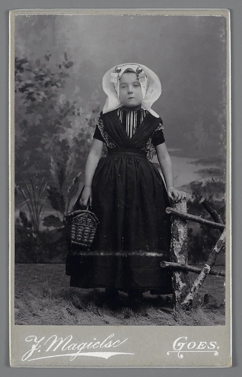 Meisje in Zuid-Bevelandse streekdracht. Het meisje draagt een oorijzer en ondermuts met daaroverheen de 'poepinnemuts', een meisjesmuts. Deze muts werd zowel gedragen door protestantse als katholieke meisjes. De manier waarop de muts gestreken werd verschilde daarbij. Qua grondvorm behoorde deze muts bij het kornettype. Naast de uiteinden van het oorijzer zijn twee paar mutsspelden in ...