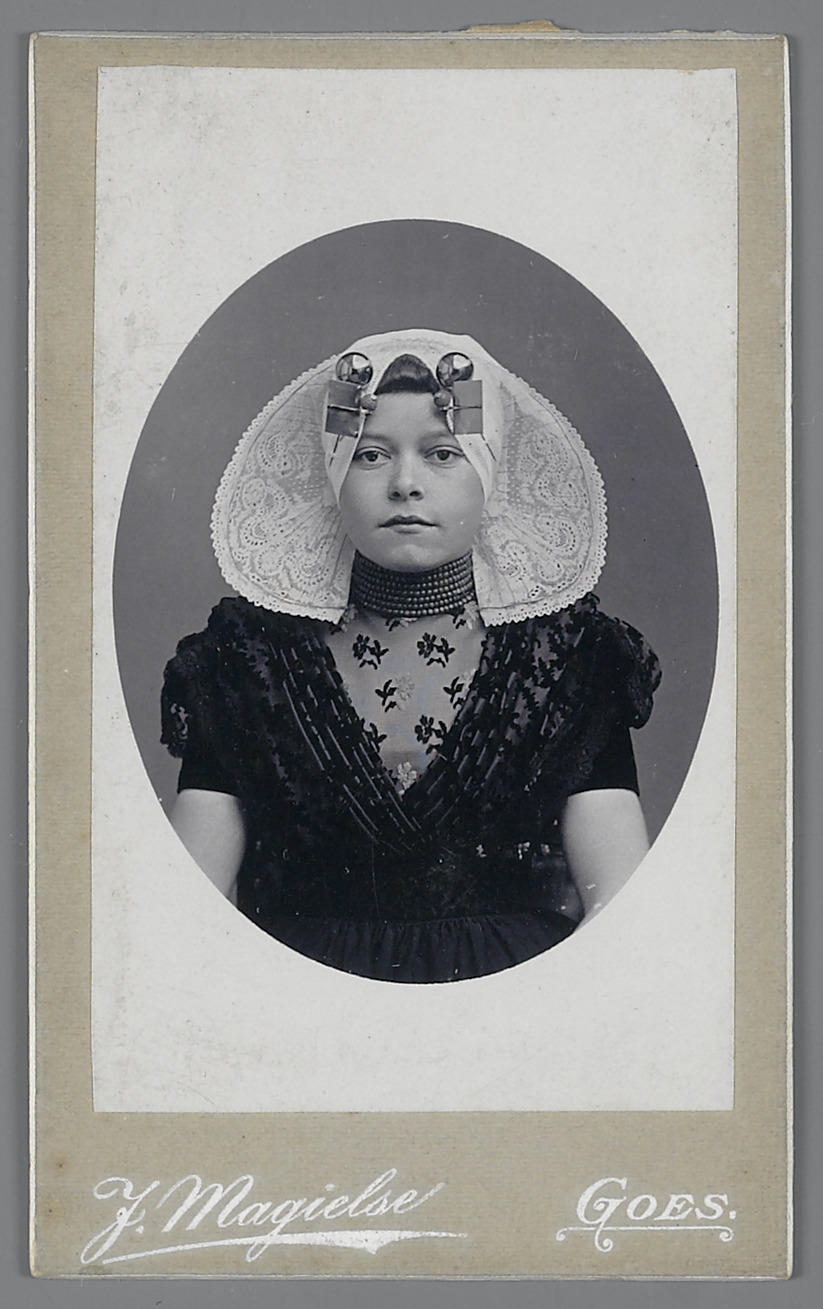 Vrouw in protestantse Zuid-Bevelandse streekdracht. Ze is gekleed in de zondagse dracht. Onder de kanten muts draagt ze een ondermuts met een oorijzer. Boven de gouden 'stikken', de vierkante oorijzeruiteinden, zijn twee paar mutsspelden in de ondermuts gestoken. De kanten muts is verstevigd met 'karkas', gemaakt van koperdraad dat omwikkeld is met garen. Om haar ...