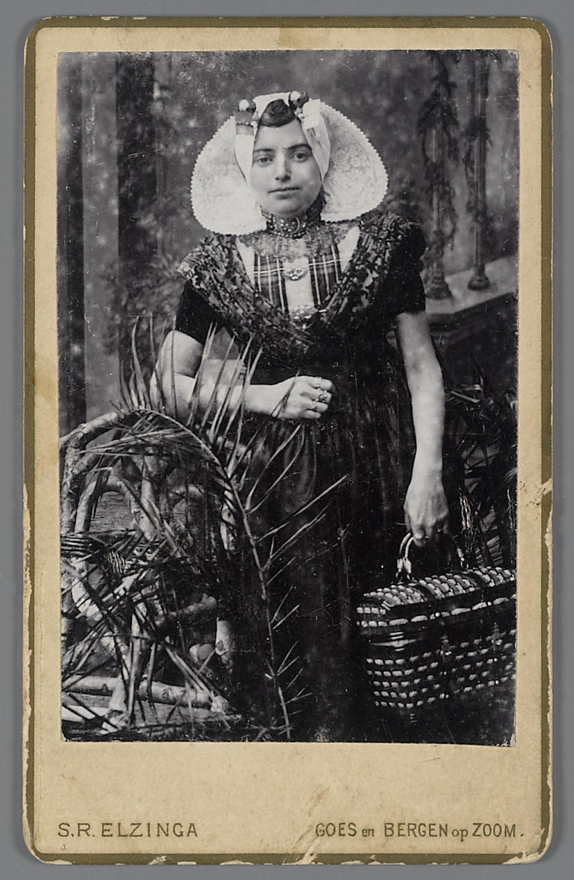 Vrouw in protestantse Zuid-Bevelandse streekdracht. Ze is gekleed in zondagse dracht. Onder de kanten muts draagt ze een ondermuts met een oorijzer. Boven de gouden 'stikken', de vierkante oorijzeruiteinden, zijn twee paar mutsspelden in de ondermuts gestoken. Op de 'beuk' of kroplap zijn twee broches gespeld. Het halssnoer heeft een driedelige sluiting. Aan haar linkerhand ...