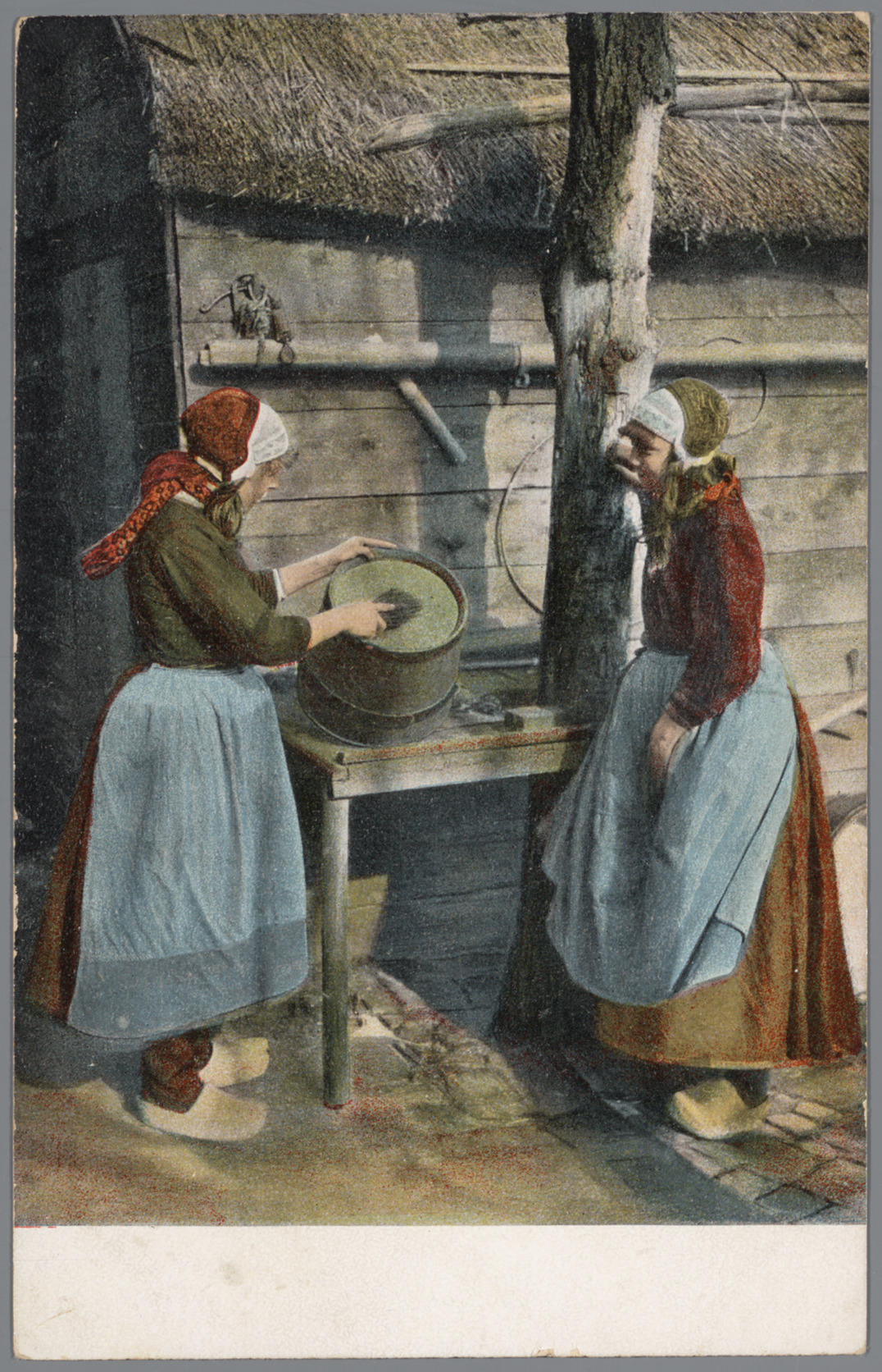 Twee meisjes in Marker streekdracht. Het linker meisje maakt een emmer schoon.