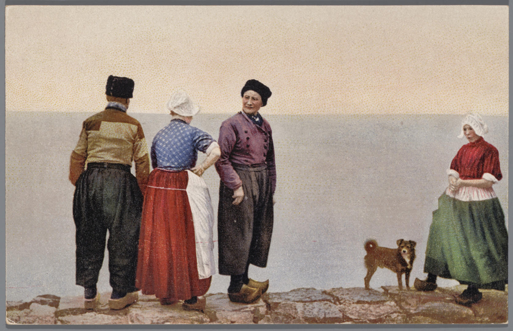 Mannen, vrouw en meisje in Volendammer streekdracht. De opname is gemaakt aan zee. Naast het meisje staat een hondje.