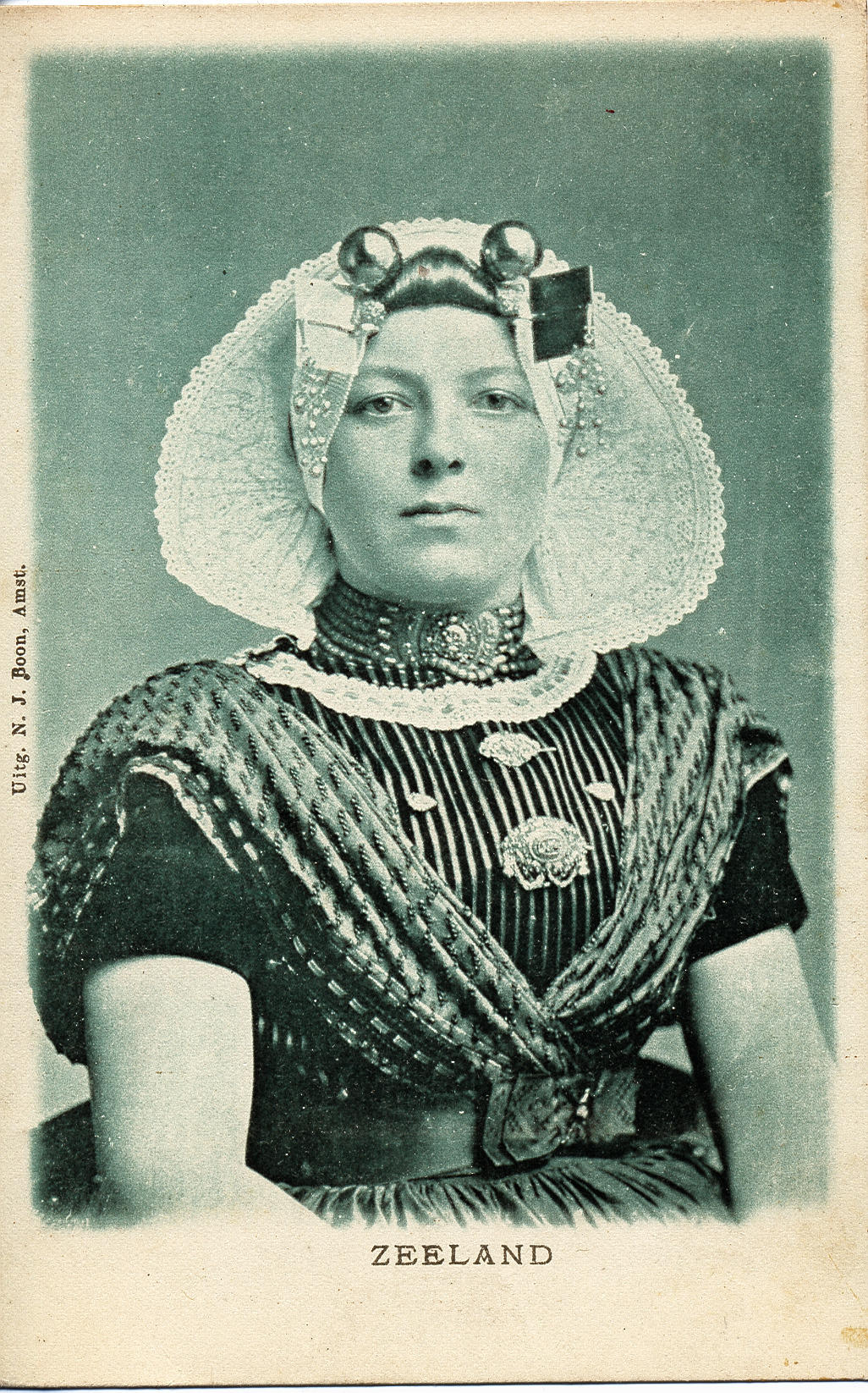 Ansichtkaart met een foto van een vrouw in protestantse Zuid-Bevelandse streekdracht. Aan de 'stikken' (vierkante oorijzeruiteinden) hangen oorijzerhangers. In de muts zijn twee paar mutsspelden gestoken. Vooraan heeft ze een paar zogenoemde kroonspelden van cantillewerk. Achteraan draagt ze een paar 'bolspelden'. De vrouw draagt een halssnoer met zes strengen kralen en een driedelige sluiting aan ...