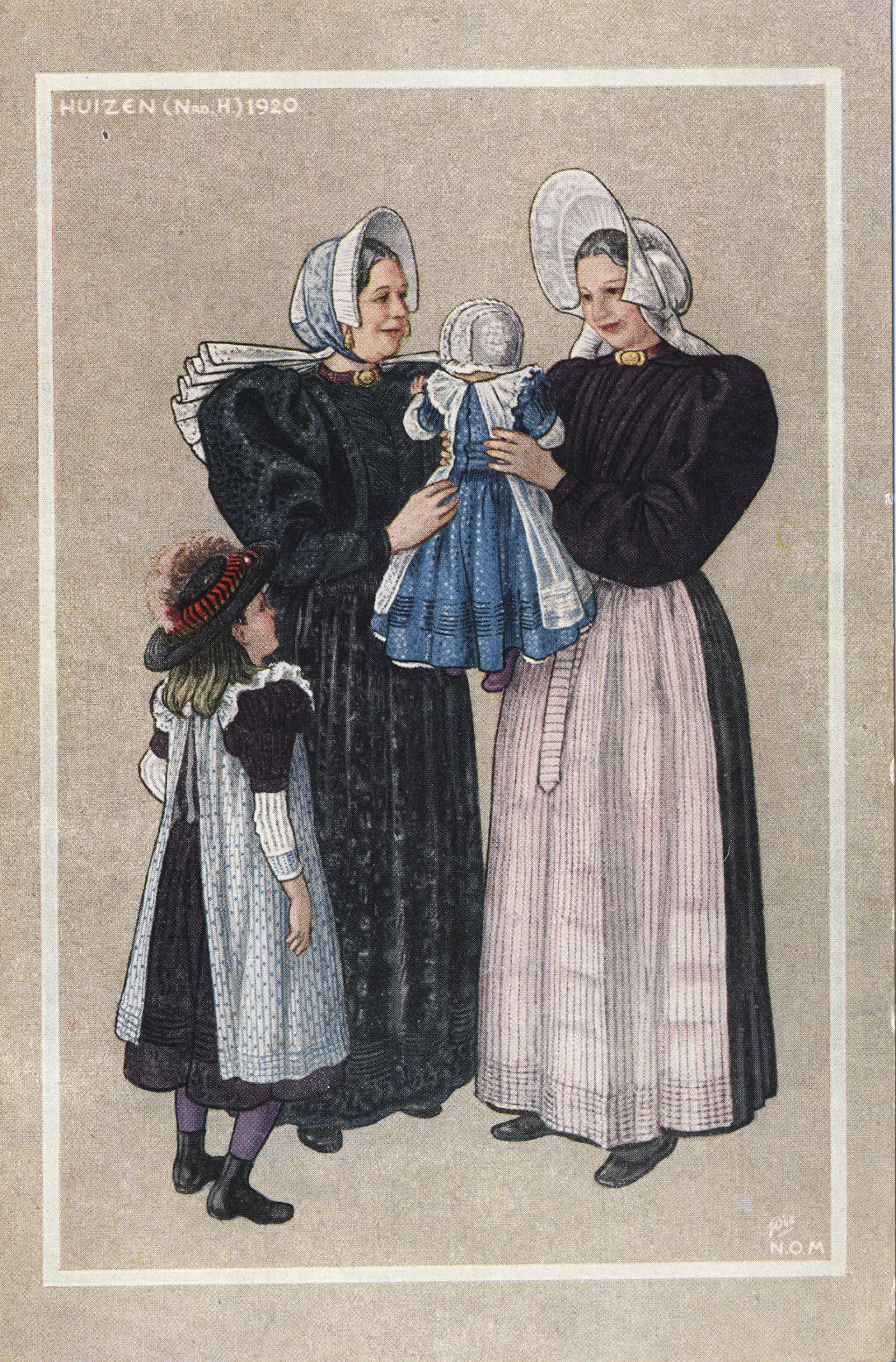 Vrouwen en kinderen in Huizer streekdracht rond 1930. De vrouw links draagt een kornetmuts en de vrouw rechts een oorijzermuts.