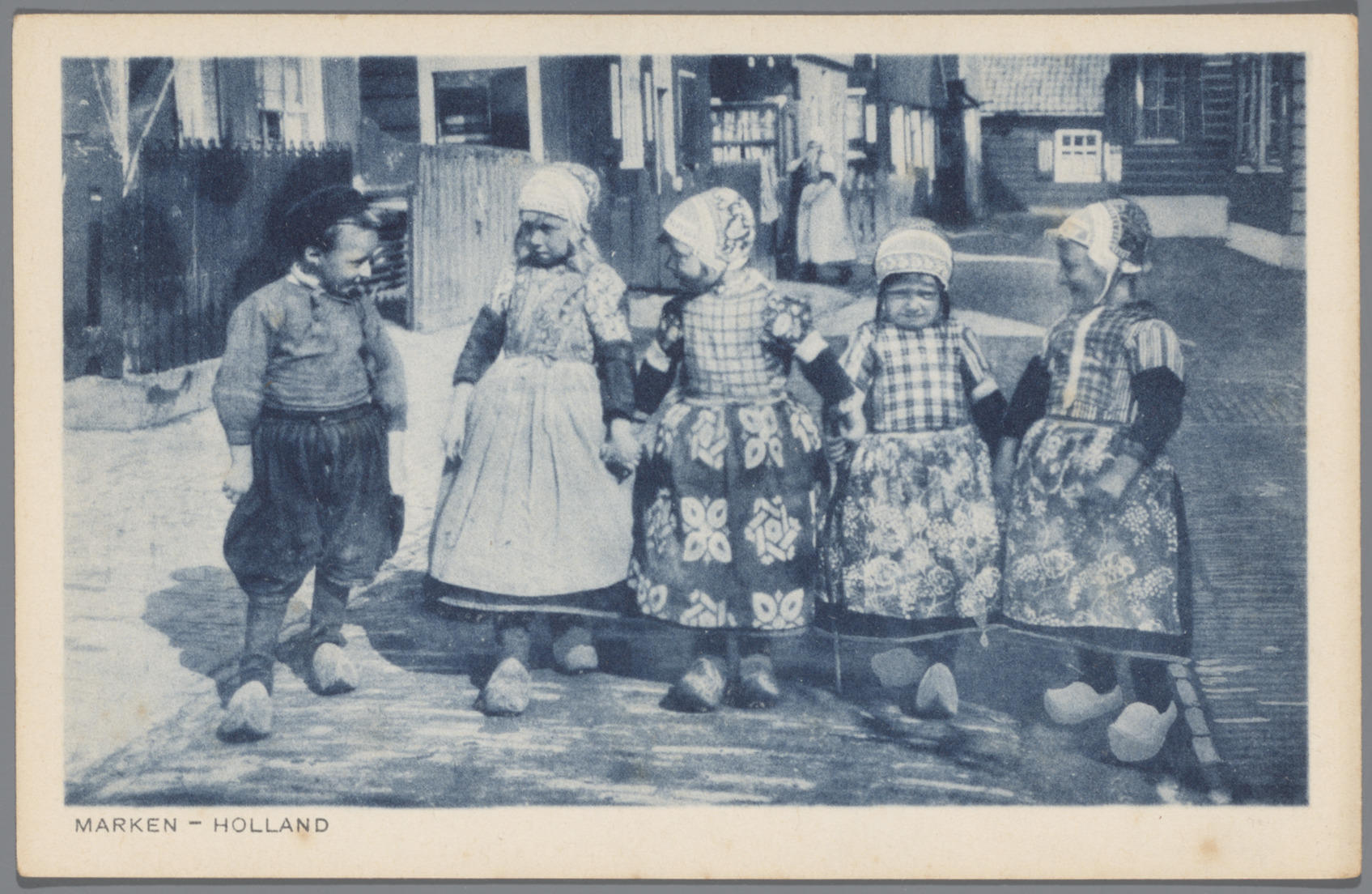 Ansichtkaart van een meisje en vier jongens in Marker streekdracht in de Kerkbuurt op Marken. De linker jongen draagt een boezeroen (soort overhemd) en een broek. Het meisje en de drie jongens rechts daarvan zijn in rokkendracht. De jongens in rokkendracht zijn onder andere te herkennen aan hun geruite borstlap en gebloemde schort. De tweede ...