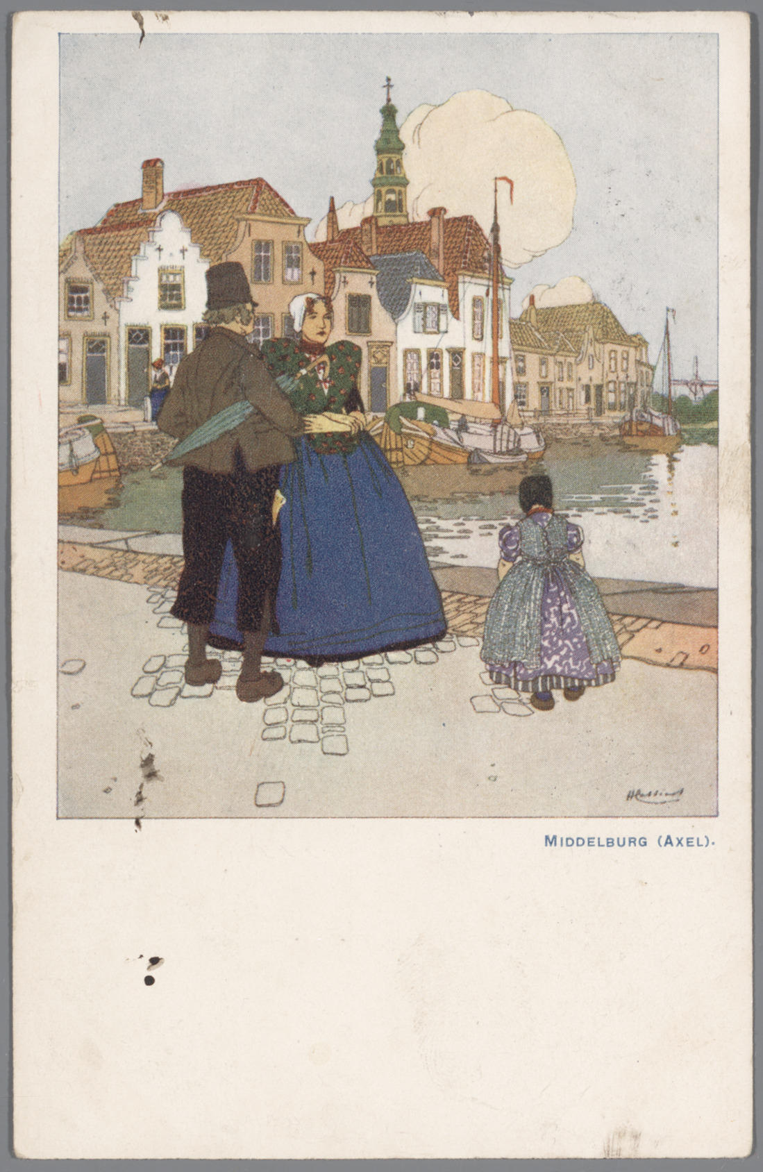 Man, vrouw en meisje in Axelse dracht, aan de haven te Middelburg