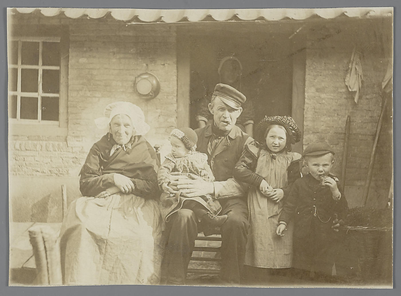 Familie in streekdracht uit Tilburg of omstreken. De familie is gekleed in opknapdracht. De vrouw links draagt een muts zonder poffer, lange oorbellen en een omslagdoek. Het meisje draagt de zwarte meisjesmuts. Het kleine kind draagt een mutsje met een rand van opgewerkte kralen. De vrouw in de deuropening heeft een slaapmuts op die ook ...