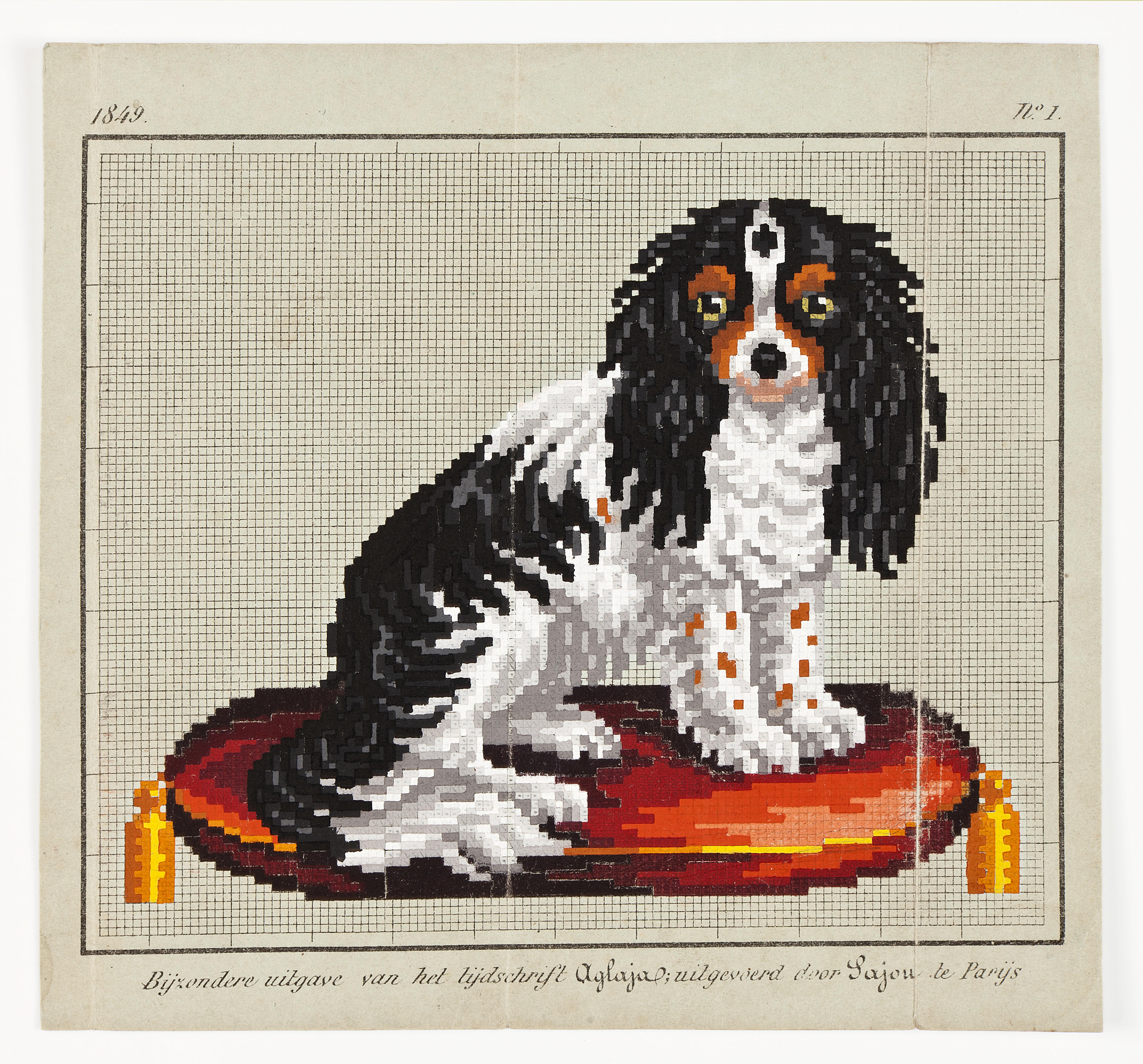 Op het telpatroon staat een King Charles hondje op een kussen, een geliefd patroon uit de Biedermeiertijd. Het patroontje was een bijzondere uitgave van het tijdschrift 'Aglaja', uitgegeven door Sajou in Parijs, Frankrijk. Linksboven staat 1849 en rechtsboven is ‘no.1’ te zien.