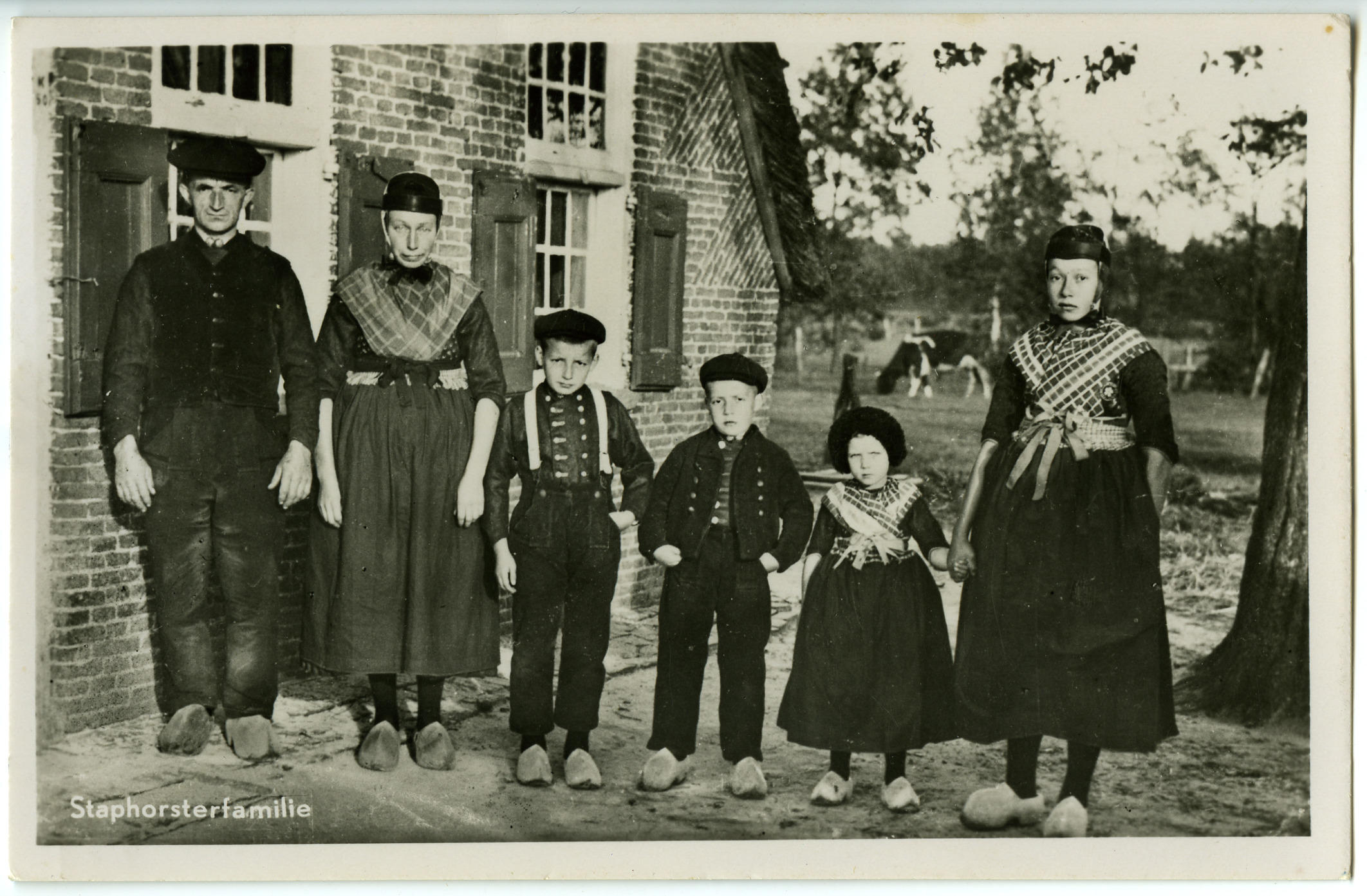 Ansichtkaart met een foto van Jan Hoeve en Grietje Hoeve-Evertsen met hun kinderen Jan, Albert, Hendrikje en Lijsje voor hun woning in Staphorst. Ze zijn gekleed in Staphorster dracht.