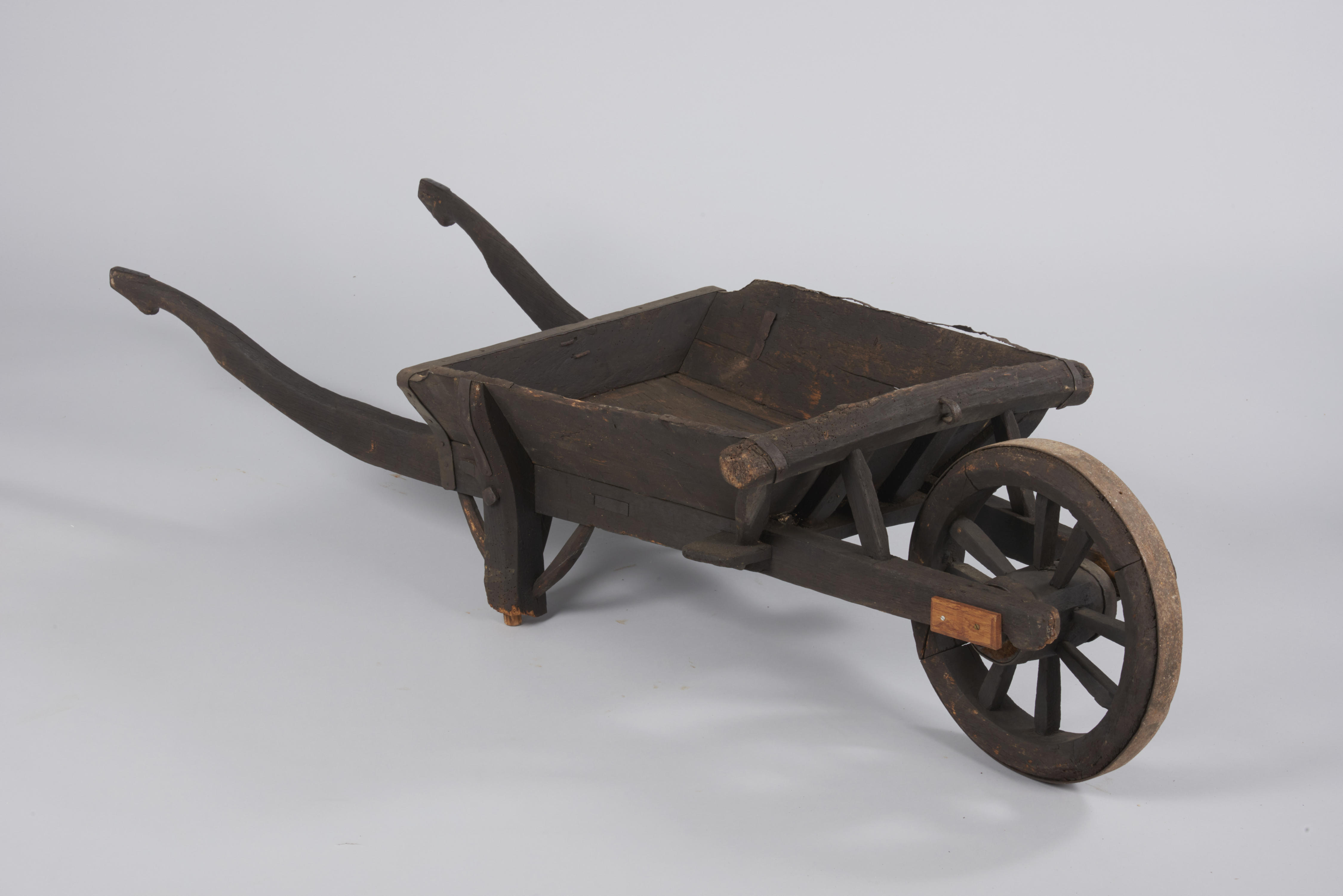 Bakkruiwagen, gebruikt door Jan Veenstra voor het werk als veenarbeider in Nieuw-Amsterdam en voor vervoer van plaggen en zoden als dakdekking van zijn hut. De kruiwagen heeft een blokwiel met dubbelbrede velg om niet in de veengrond weg te zakken. Later is er een ijzeren wielband om gezet.