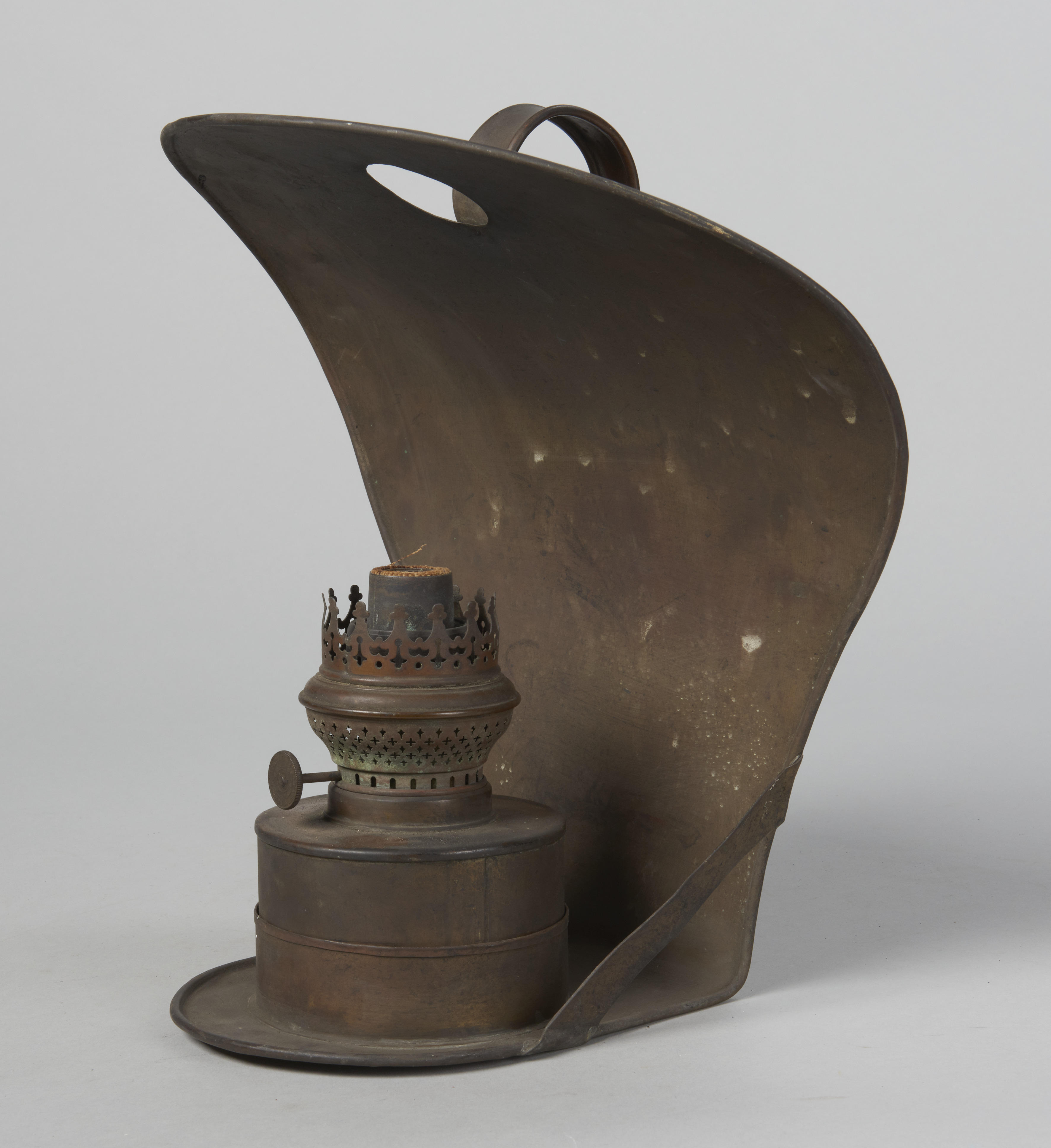 Messing petroleumwandlamp met een muurbeugel op de rug. De brede gebogen reflector werpt het licht naar voren en beneden. De brander is van het type Patent-Reform-Kosmos-Brenner. Een rij van soortgelijke lampen kon bijvoorbeeld in een kerk aan de muur gehangen worden. Losse exemplaren werden in huis gebruikt als bijverlichting.